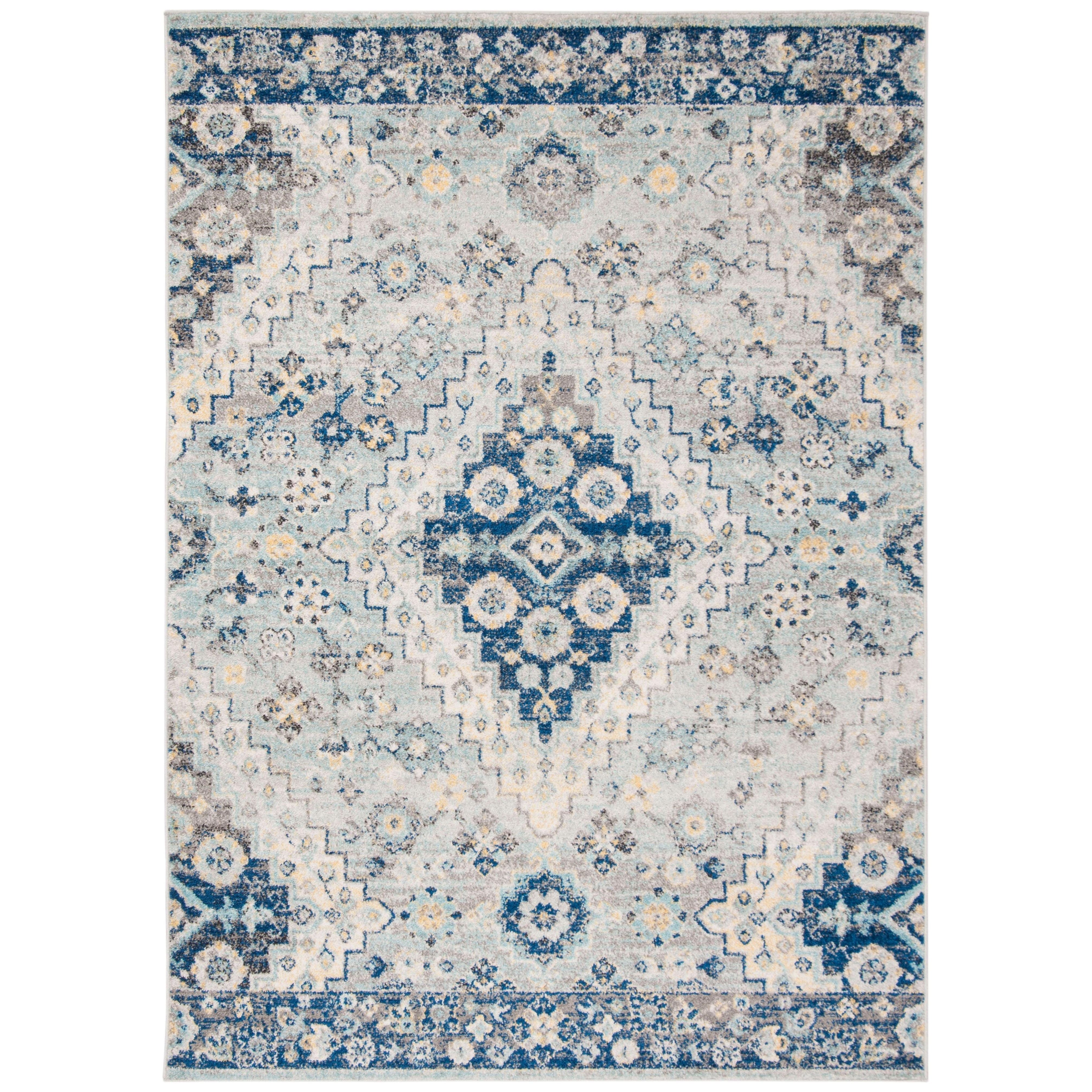 Madison MAD616F Grey Cream area rug, a perfect blend of classic rug design and modern flair. This transitional floor covering features a captivating mosaic of floral medallions in beautiful shades of blue and orange, creating a unique gradient effect. The distressed, heirloom appearance adds a touch of elegance to any room.