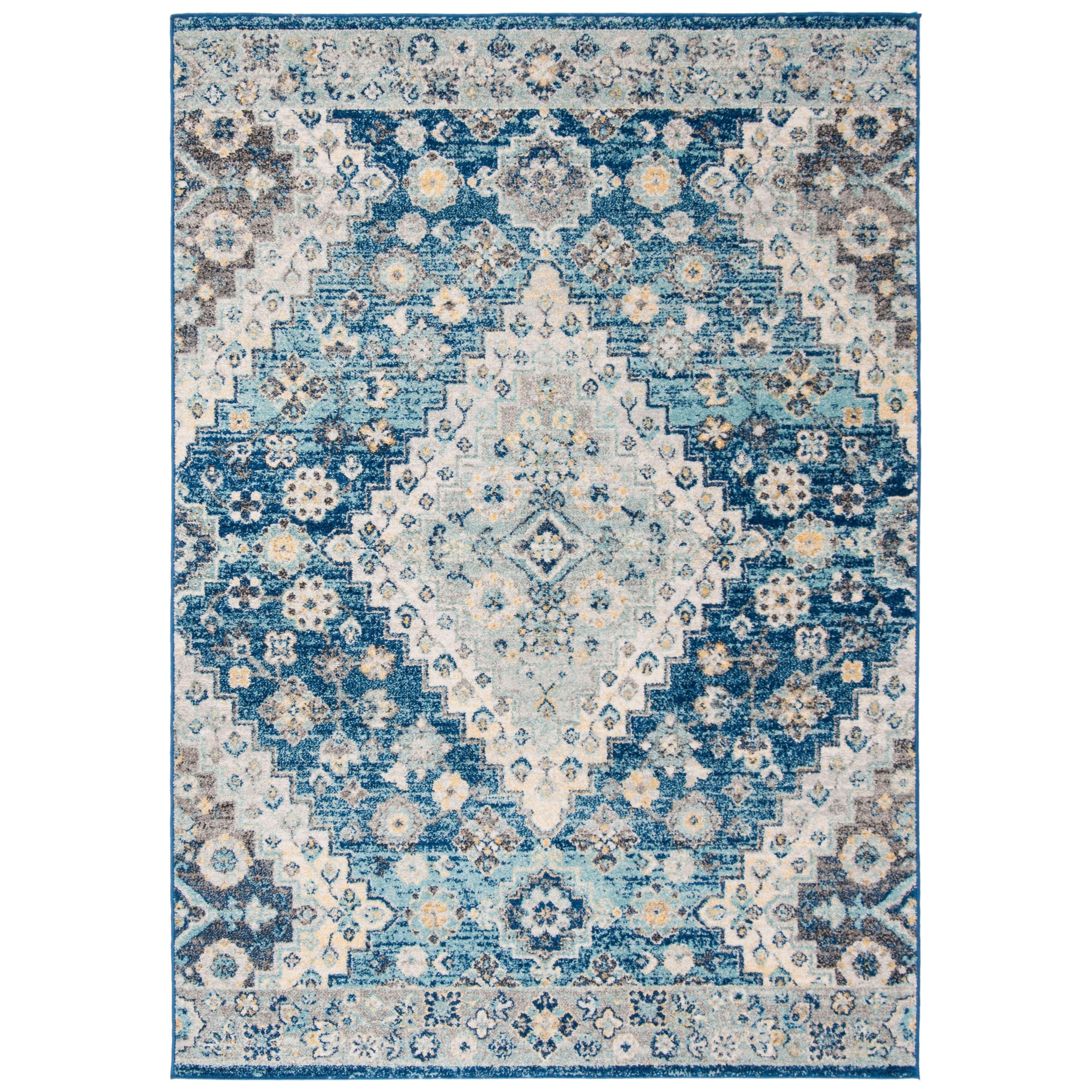 Madison MAD616N Navy Creme area rug, a stunning blend of classic rug patterns and modern design. This transitional floor covering features a mesmerizing display of floral medallions in captivating shades of blue and orange, creating a beautifully distressed, heirloom-inspired look. Crafted with high-quality synthetic yarns, this elegant rug boasts a shimmering finish that exudes lasting beauty.