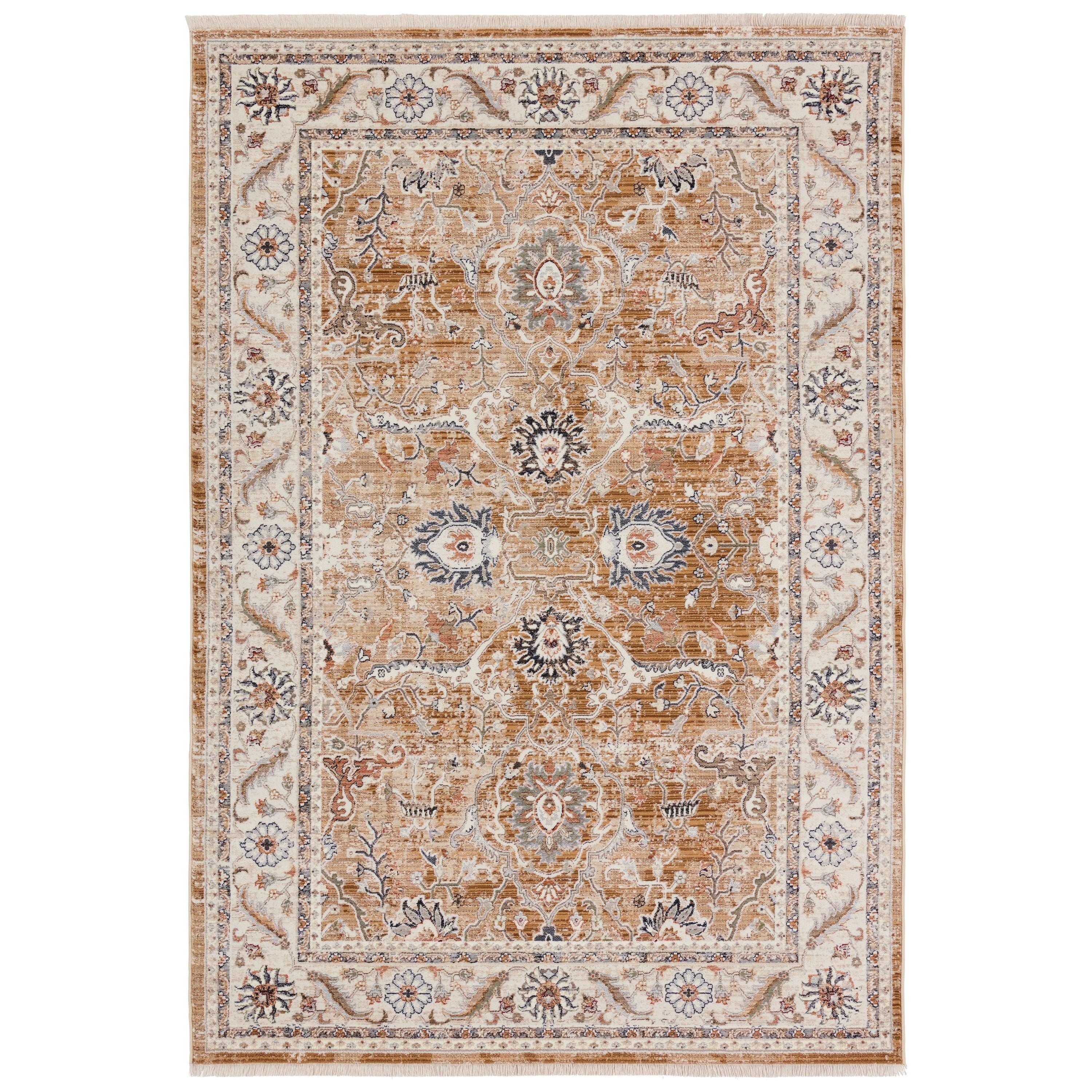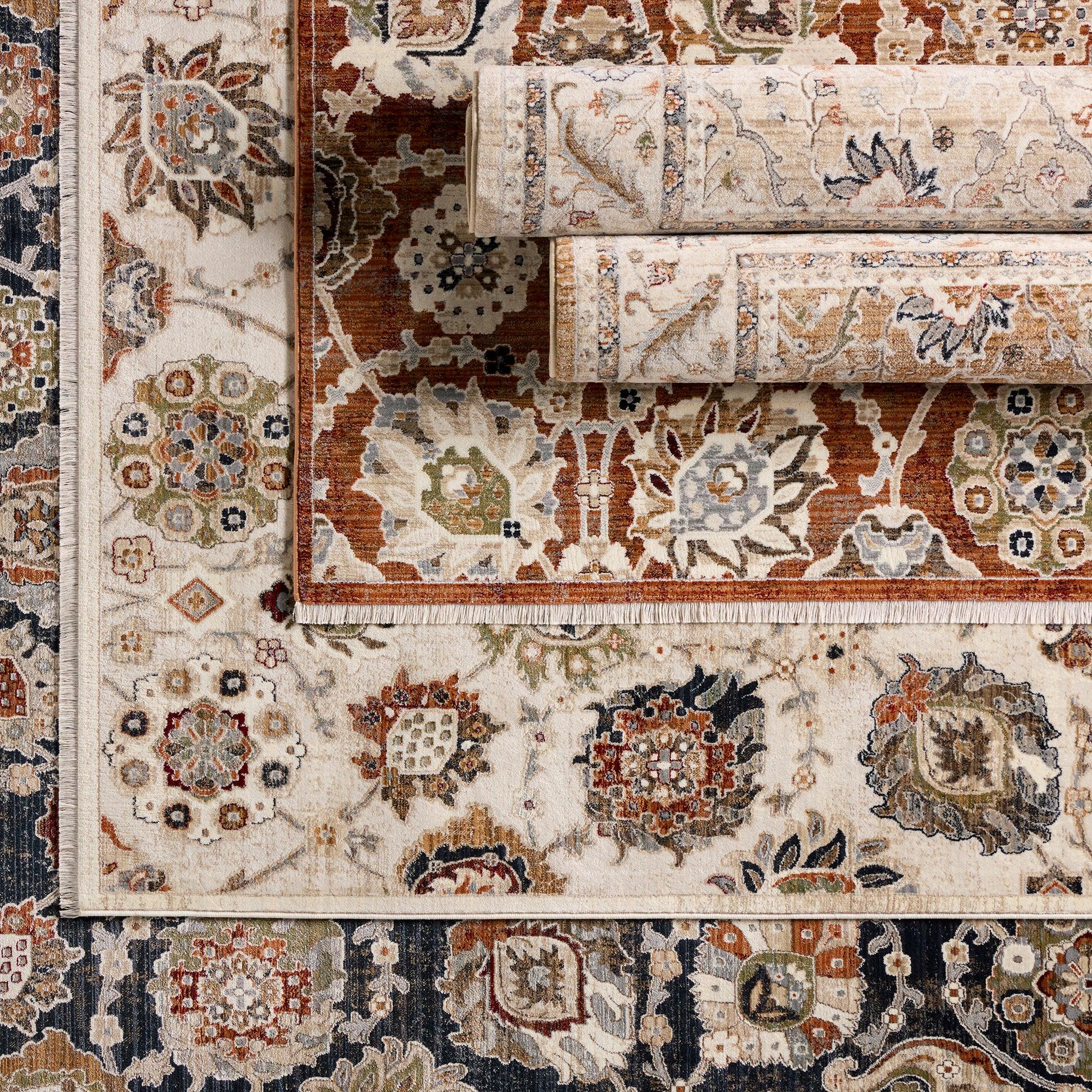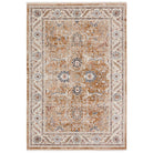 Zefira ZFA18 Romano, a stunning rug inspired by the timeless beauty of sun-drenched Turkish patterns. The Zefira collection features intricate traditional motifs reinvented with contemporary, vibrant color palettes. The Romano rug showcases an elegant erased medallion design in rich shades of brown, cream, orange, red, blue, green, and gray.