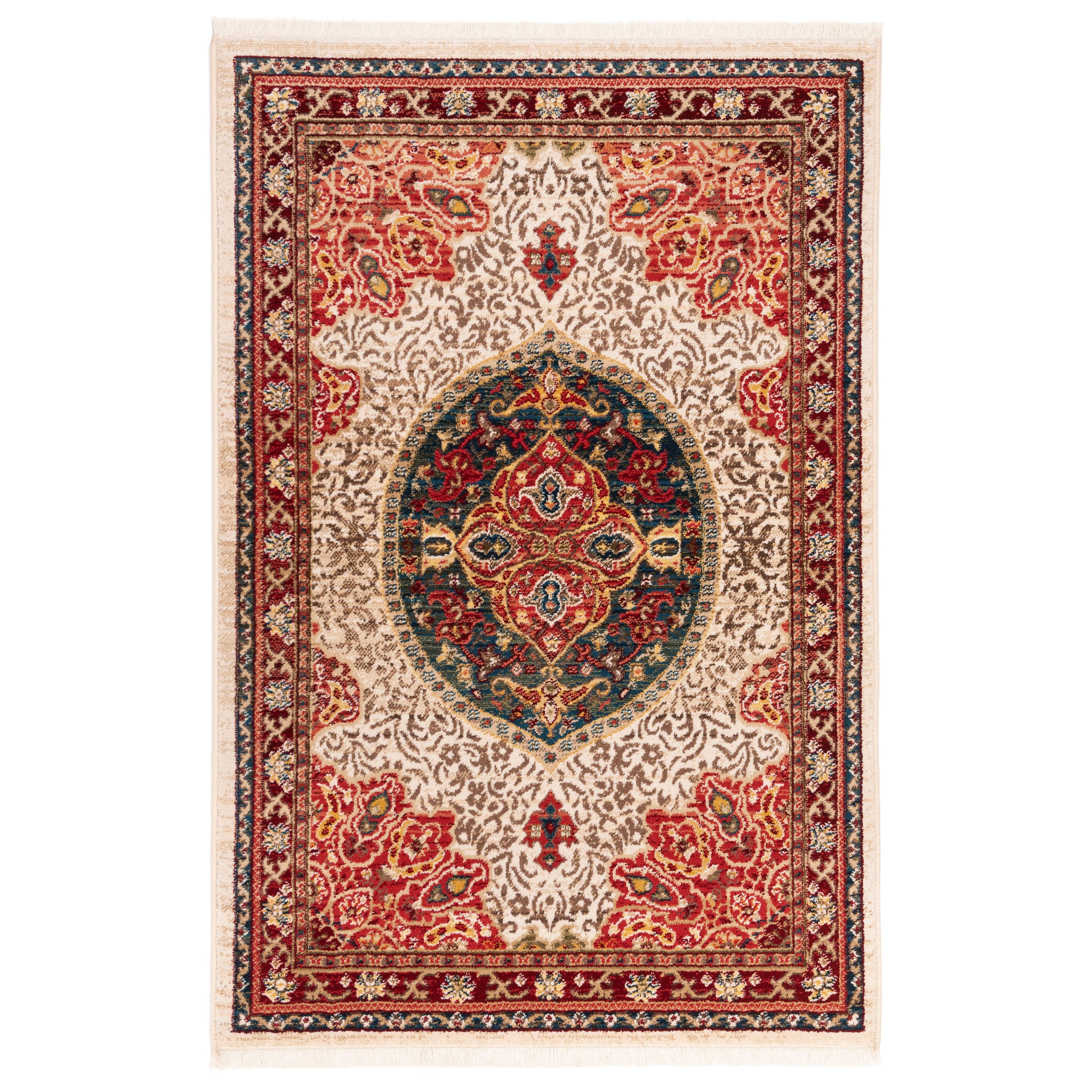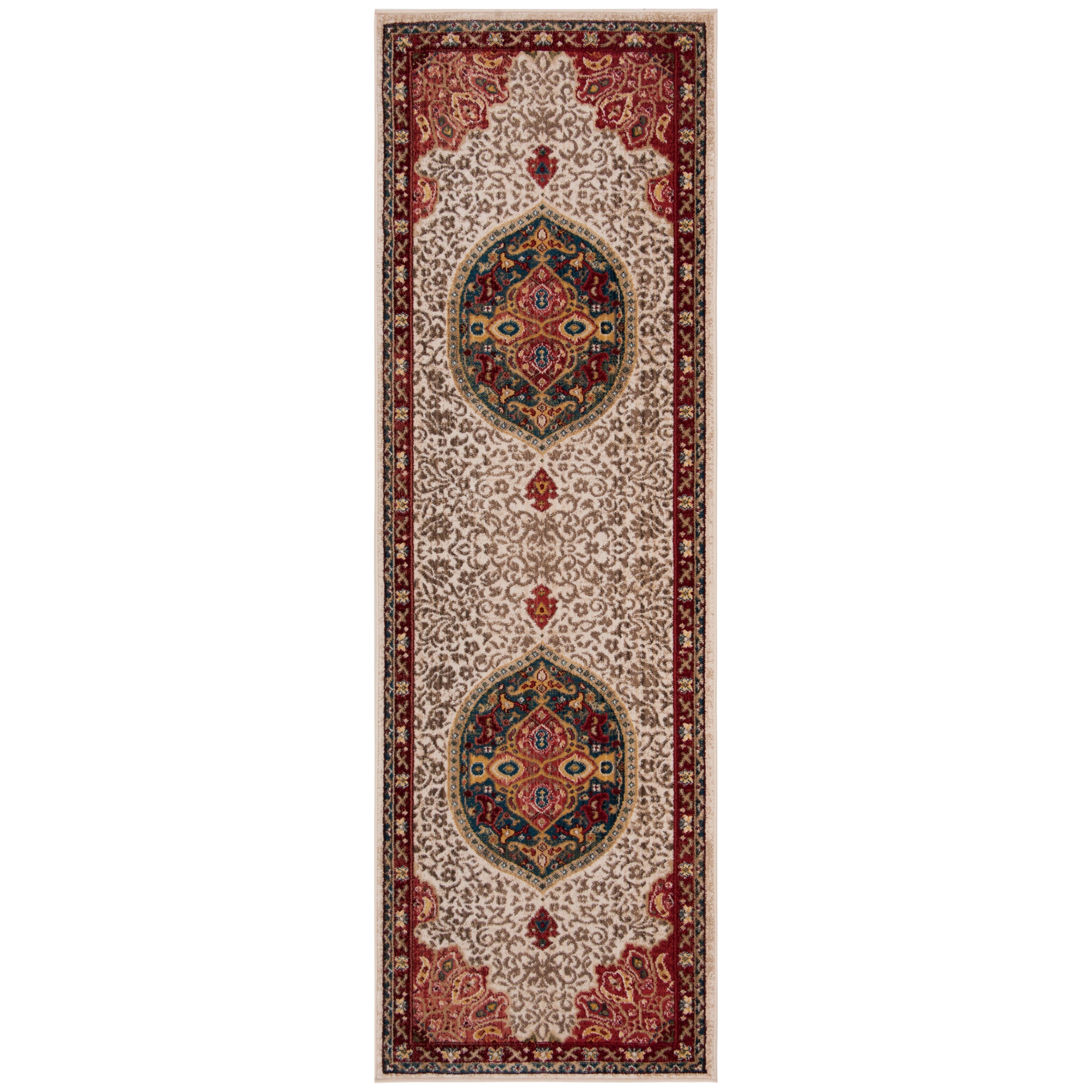 Kashan KSN302D Ivory Red rug from Safavieh, a modern twist on traditional Persian design. This collection seamlessly blends classic motifs with vibrant contemporary colors for a fresh and stylish look. Crafted with meticulous attention to detail, these rugs showcase transitional elements that effortlessly enhance any room decor.