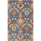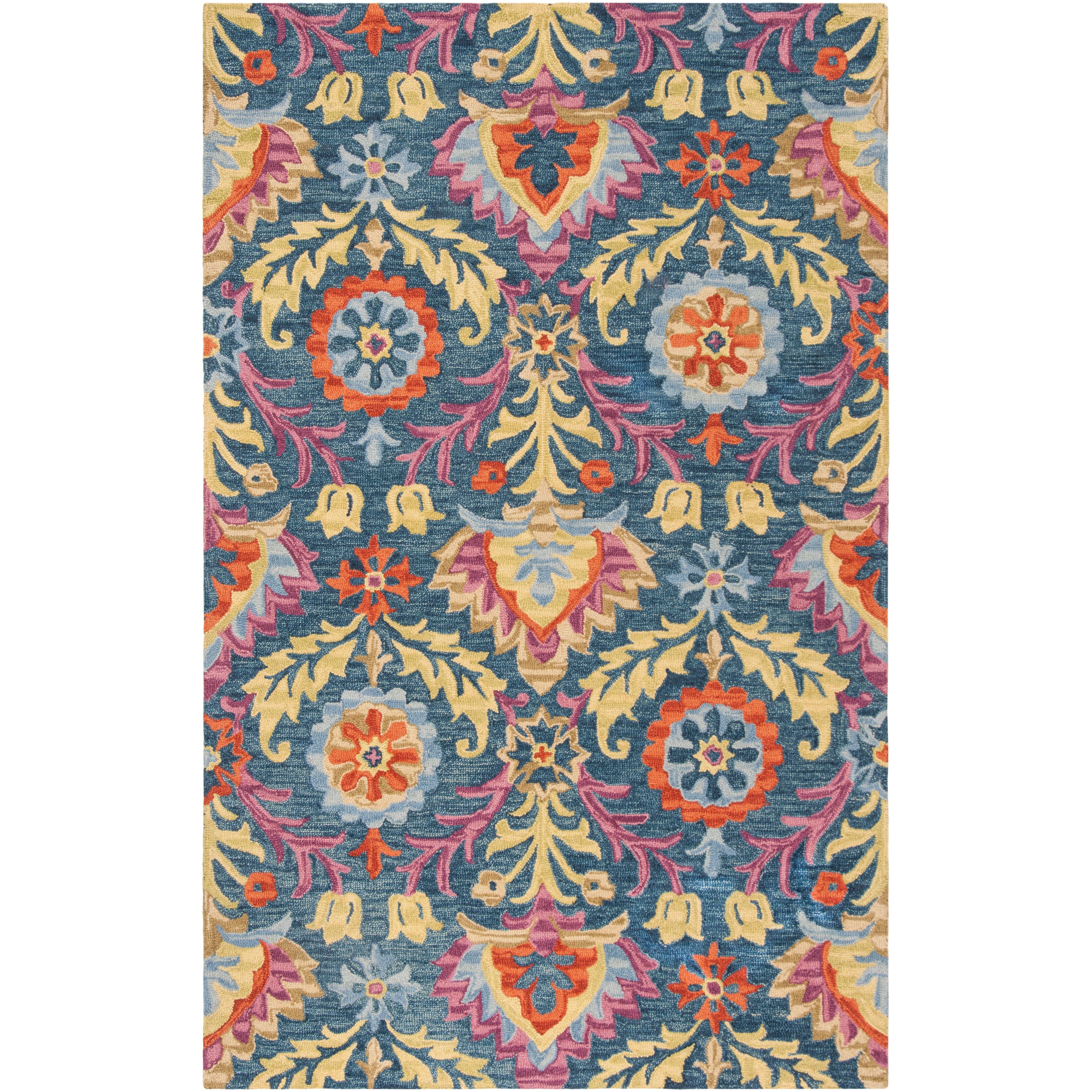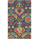 Suzani SZN312A Blue Multi rug from the Suzani Collection, featuring playful patterns and colorful ornamental medallions and florals. Hand-hooked from premium wool, this rug is expertly crafted to bring a unique touch to your space. With a thickness of approximately 0.5 inches, it is perfect for contemporary, bohemian, and transitional home decor styles.