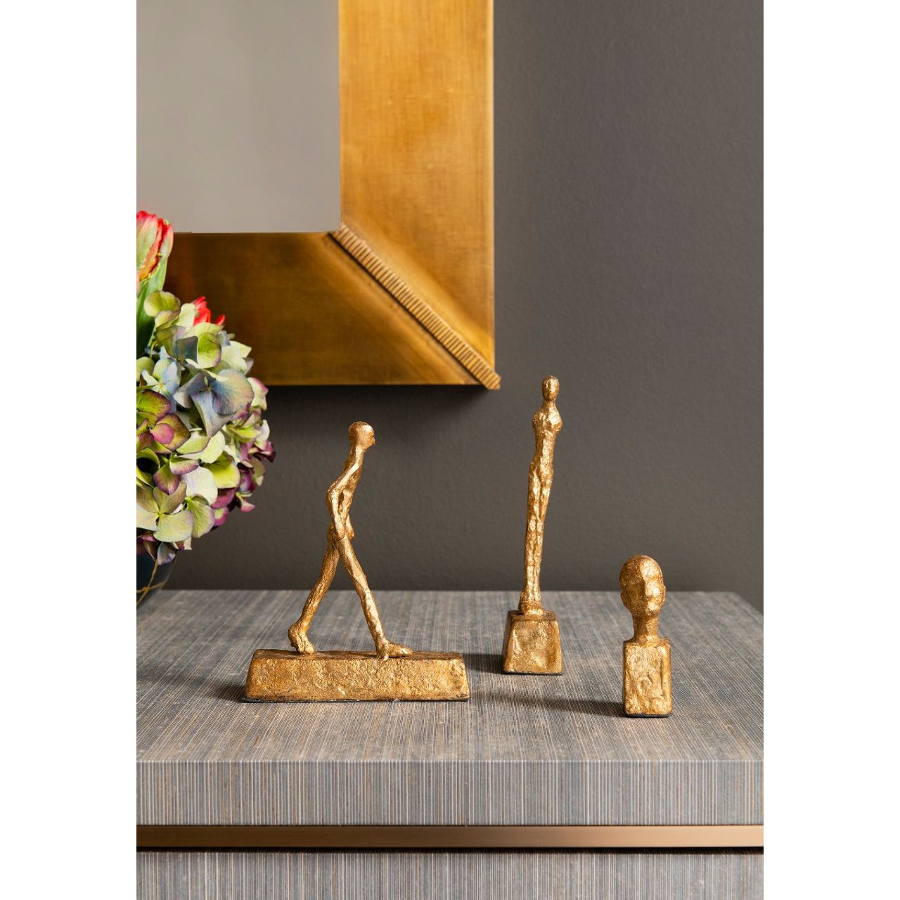 The Three Forms Set is a transcendental trio, giving an otherworldly twist to the study of humanism. Raw elemental finishes and surrealist silhouettes lend each of these statues an air of mystery, as if they were artifacts discovered from an ancient civilization. The walking man and standing figure are both strikingly long and slender, representing exaggerated human bodies with ethereal presence. The third statue depicts a bust in the regal style, with artfully abstracted features. Realized in iron, the decorative pieces are topped with a layer of heavily worked gold leaf, with hand-eroded edges that make each of them appear like naturally aged treasures. Monumental as they are, the statues are petite enough to liven up a corner of a desk or console table, or fit amongst your leatherbound titles in a bookcase.