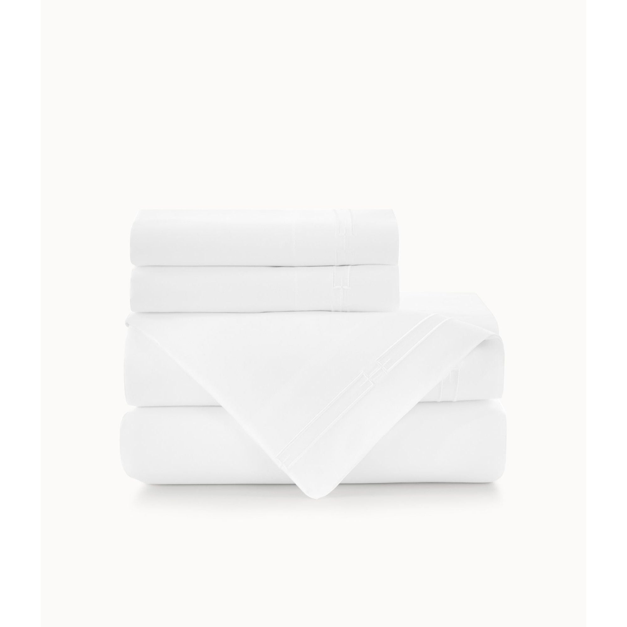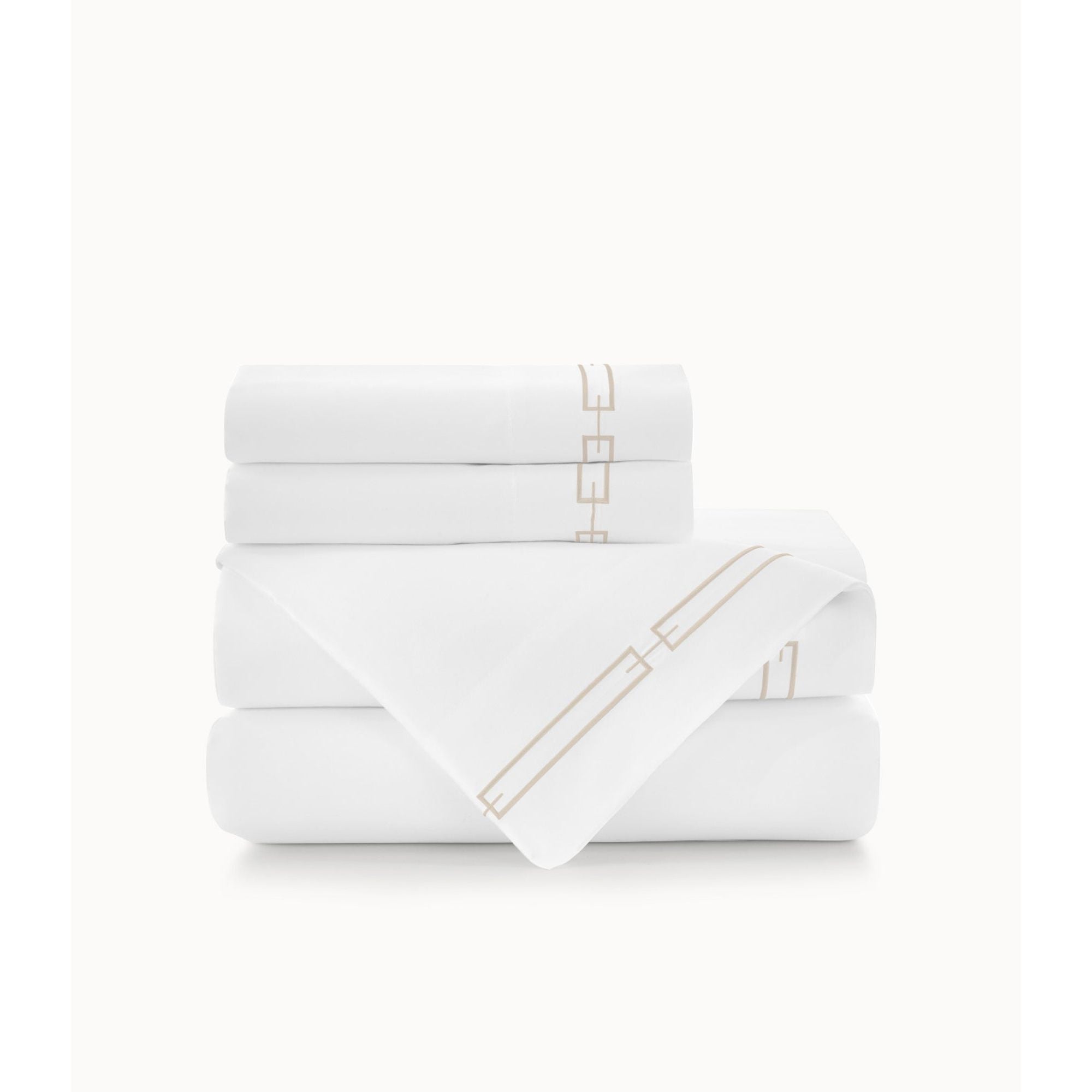 - Flat sheet and pillowcases feature a contemporary geometric link design embroidered on the 4" cuff of both.