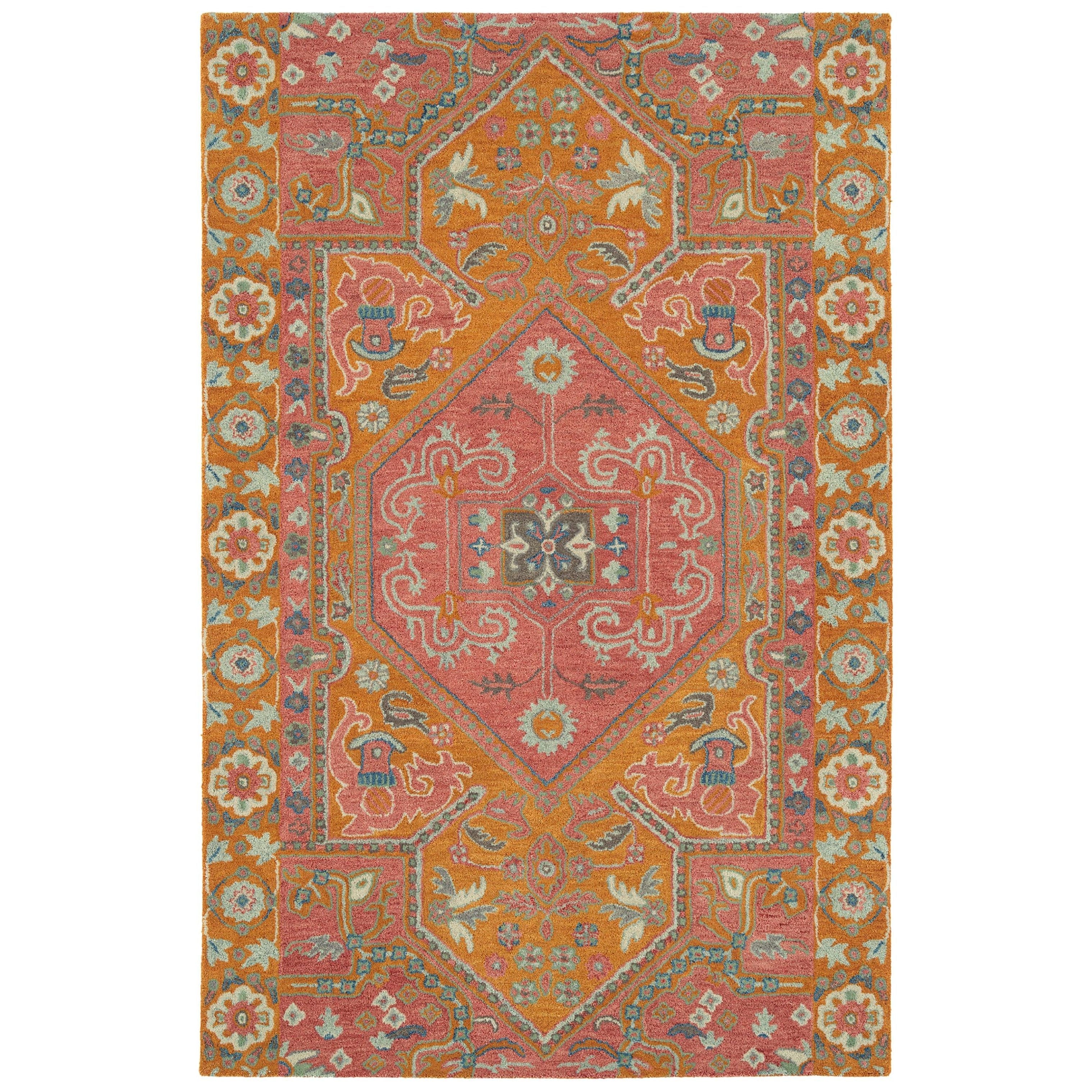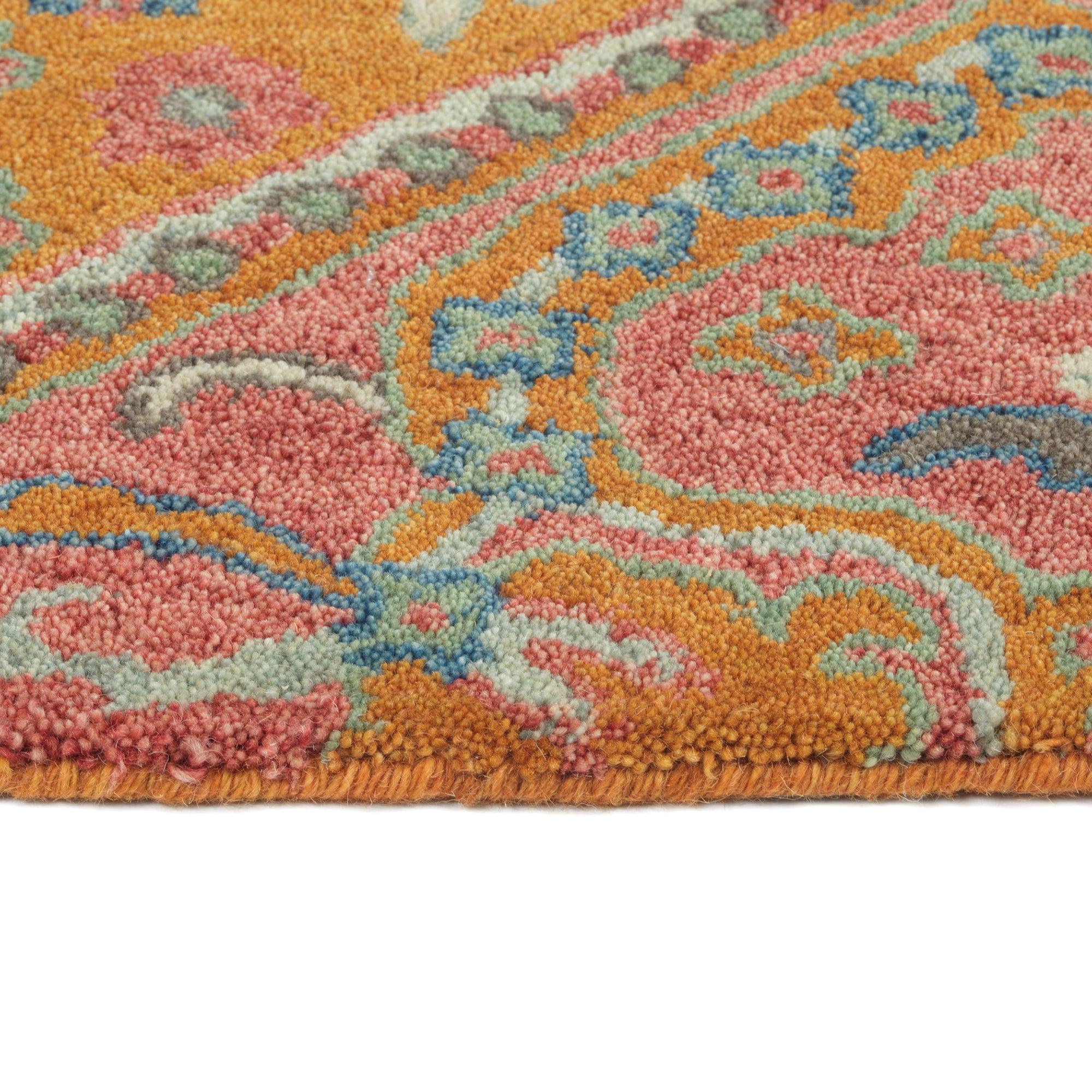 exquisite Helena 3219 92 Pink rug, a masterpiece inspired by 16th Century nobility fashion. The rug features simple floral shapes and vibrant colors that exude elegance and charm. Hand-tufted with precision, this rug is made from hand-dyed 100% imported wool spun into a premium textured yarn for a luxurious feel underfoot.