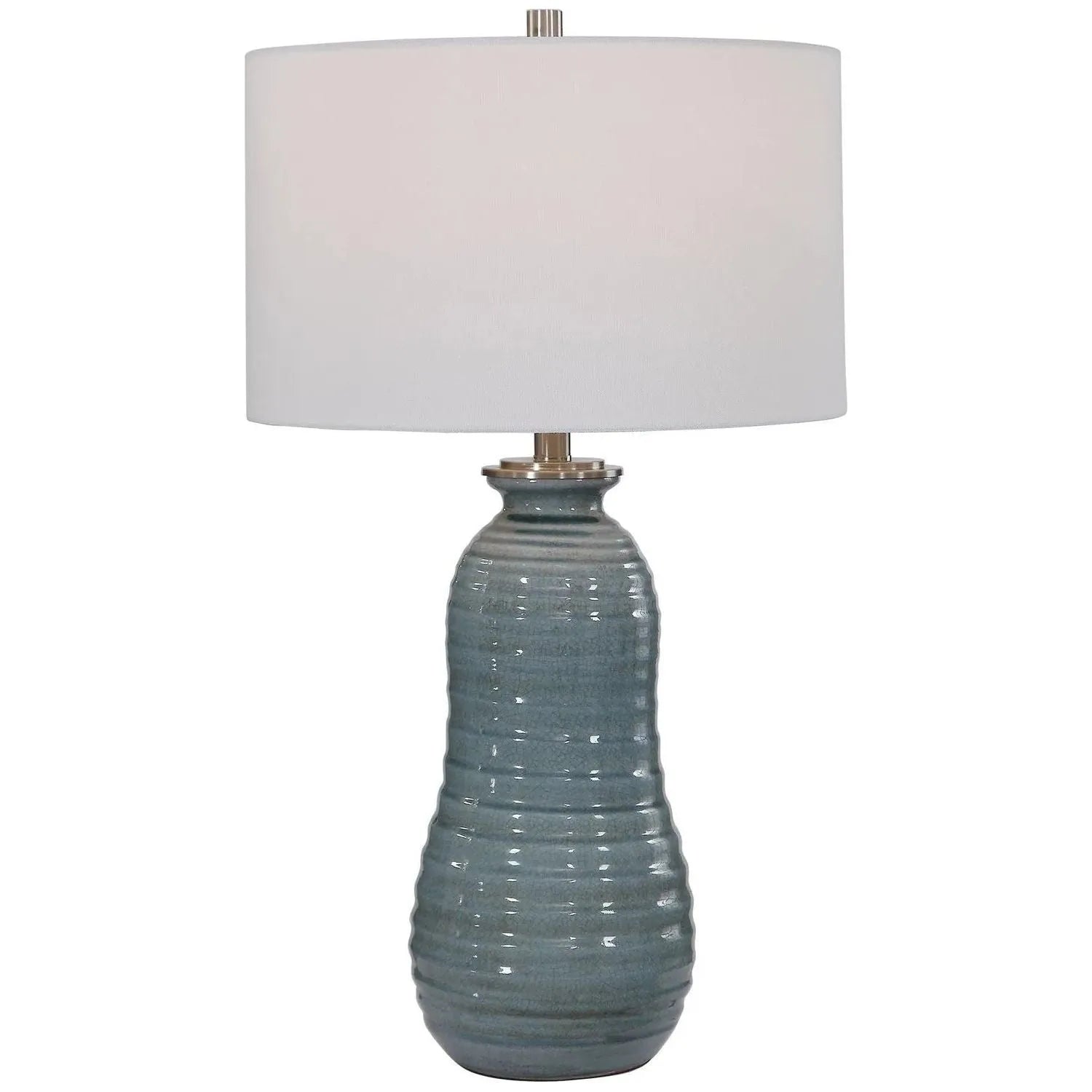 This Ceramic Table Lamp Has A Tapering Ribbed Surface That Is Finished In A Light Blue Crackled Glaze, Accented With Brushed Nickel Details. A Hardback Drum Shade In White Linen Complements This Piece. Due To The Nature Of Fired Glazes On Ceramic Lamps, Finishes Will Vary Slightly.