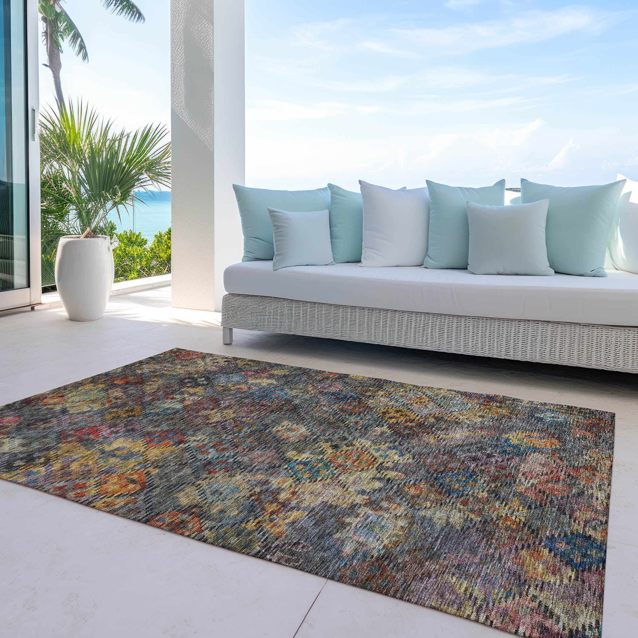 Experience the timeless beauty of our area rug, boasting a vintage old world flair adorned with intricate motifs that evoke traditional and global influences. Crafted with UV stabilized materials, this rug seamlessly transitions from indoor to outdoor spaces, ensuring durability and versatility for any setting. Its ultra-thin construction adds refinement to any room, while its machine-washable design simplifies maintenance for busy households. Perfect for families and pet owners, this rug combines style with practicality for a truly luxurious addition to your home.