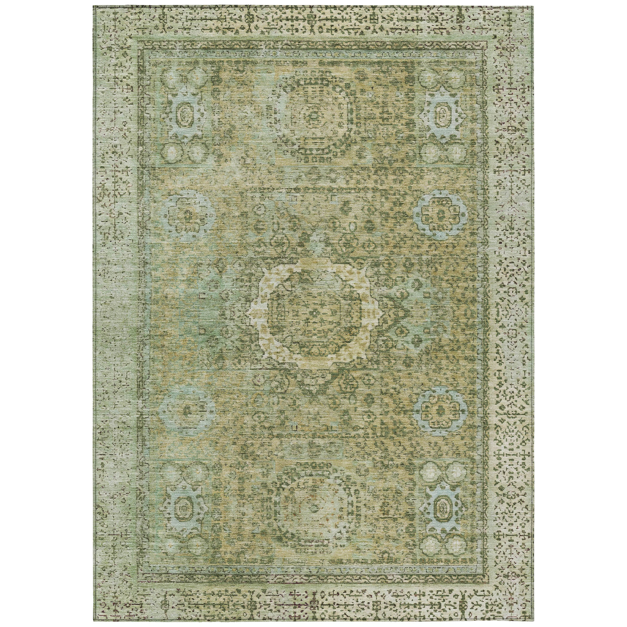 Showcasing distressed medallions with a finely detailed border, this rug brings a vintage appeal that adds warmth and character to your space. The aged effect enhances the medallions, giving them a timeworn beauty, while the border provides structure. Traditional in style, this bordered pattern offers a sophisticated, timeless aesthetic. Designed for both indoor and outdoor spaces, this UV-stabilized rug features an ultra-thin construction that’s easy to clean and care for. Its machine-washable design adds convenience, while its family and pet-friendly nature ensures it can handle everyday wear and tear. Stylish and durable, it’s the perfect solution for busy households.