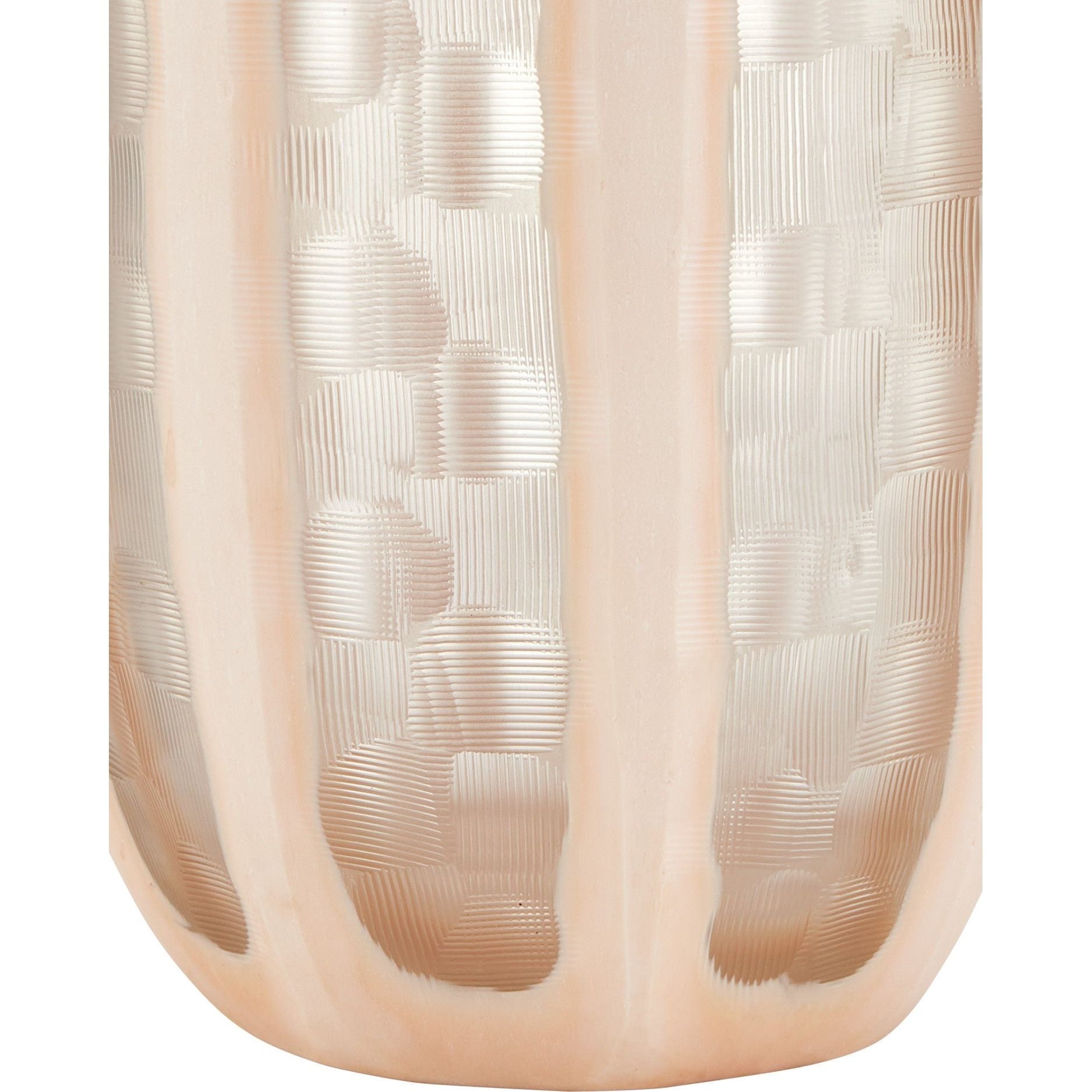 The Merletto Glass Vase Set features a trio of exquisite mouth-blown and machine-cut pieces that blend elegance with intricate craftsmanship. Each vase showcases a clear glass shell that is dipped in soft pastel blush glass, and then expertly ground away to reveal the transparent strips beneath. This refined technique creates a stunning layered effect on the vessels that vary in size.
