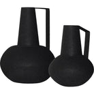 The classic pitcher style vase gets a contemporary transformation in this design. The combination of architectural angles and a textured matte black finish on powder coated iron is inherently stylish. The two vases vary in size, providing diversity for arrangements.
