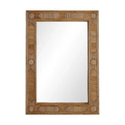 Geometric inlay of natural rattan creates a decorative patterned frame surrounding a plain rectangular mirror. Rattan will vary.