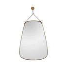 Gaze upon the sophistication of this unique wall mirror. The mirror itself is framed in warm, antique brass-finished iron, with a black leather loop that appears to be suspending the mirror — mounted with a security cleat. While the strap is a decorative element, it can be adjusted by a sliding cuff, so you can choose the length. Security cleat hanging hardware allows this mirror to hang vertically. Leather and finish will vary.
