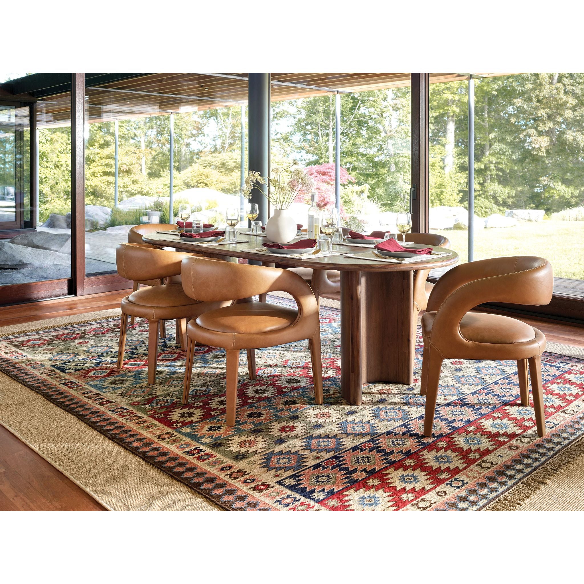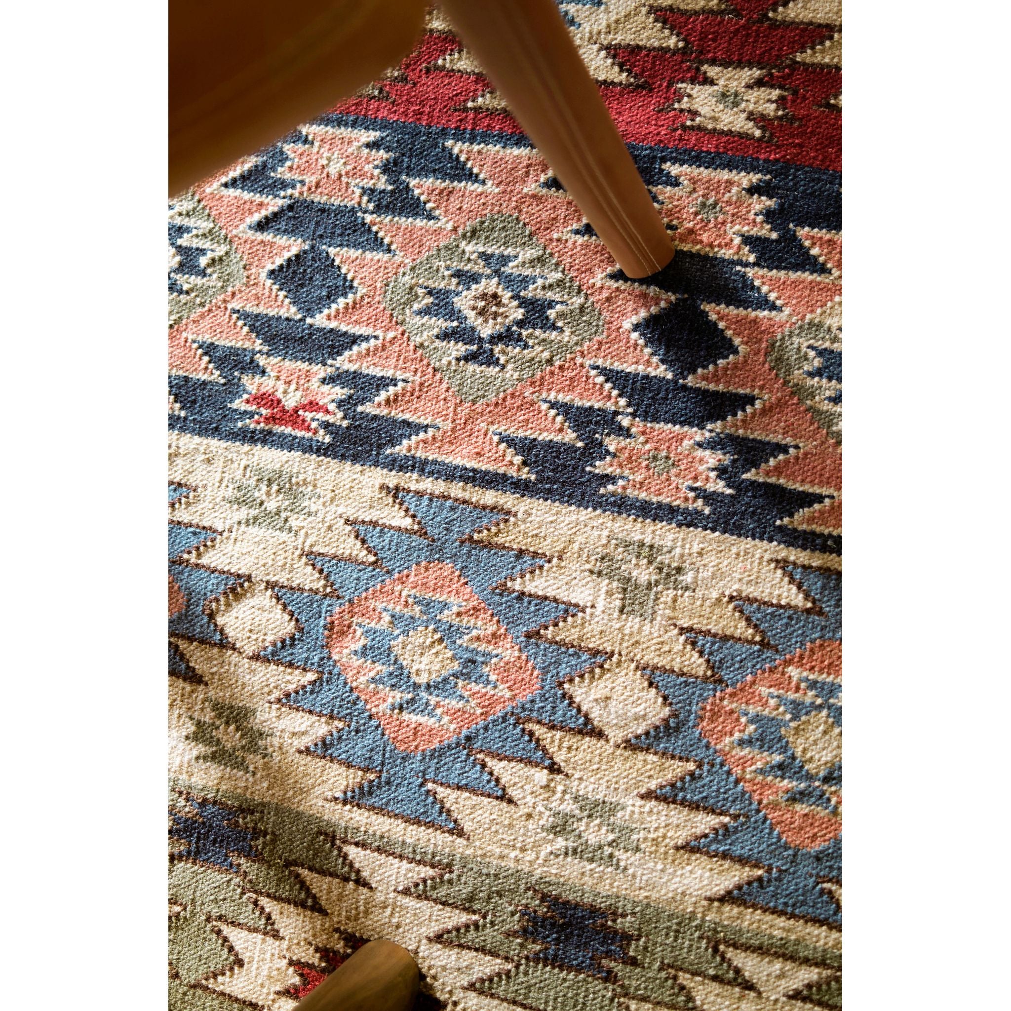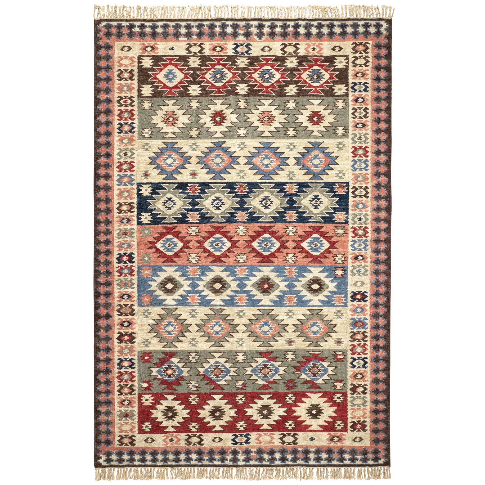 The Balsam Kilim Handwoven Wool Rug was inspired by a vintage kilim rug our designers discovered at the Brimfield Antique Market in Massachusetts. Made of wool and cotton, this eclectic piece will add character and warmth to any space with its flatwoven construction, geometric motifs, and hand-knotted fringe.