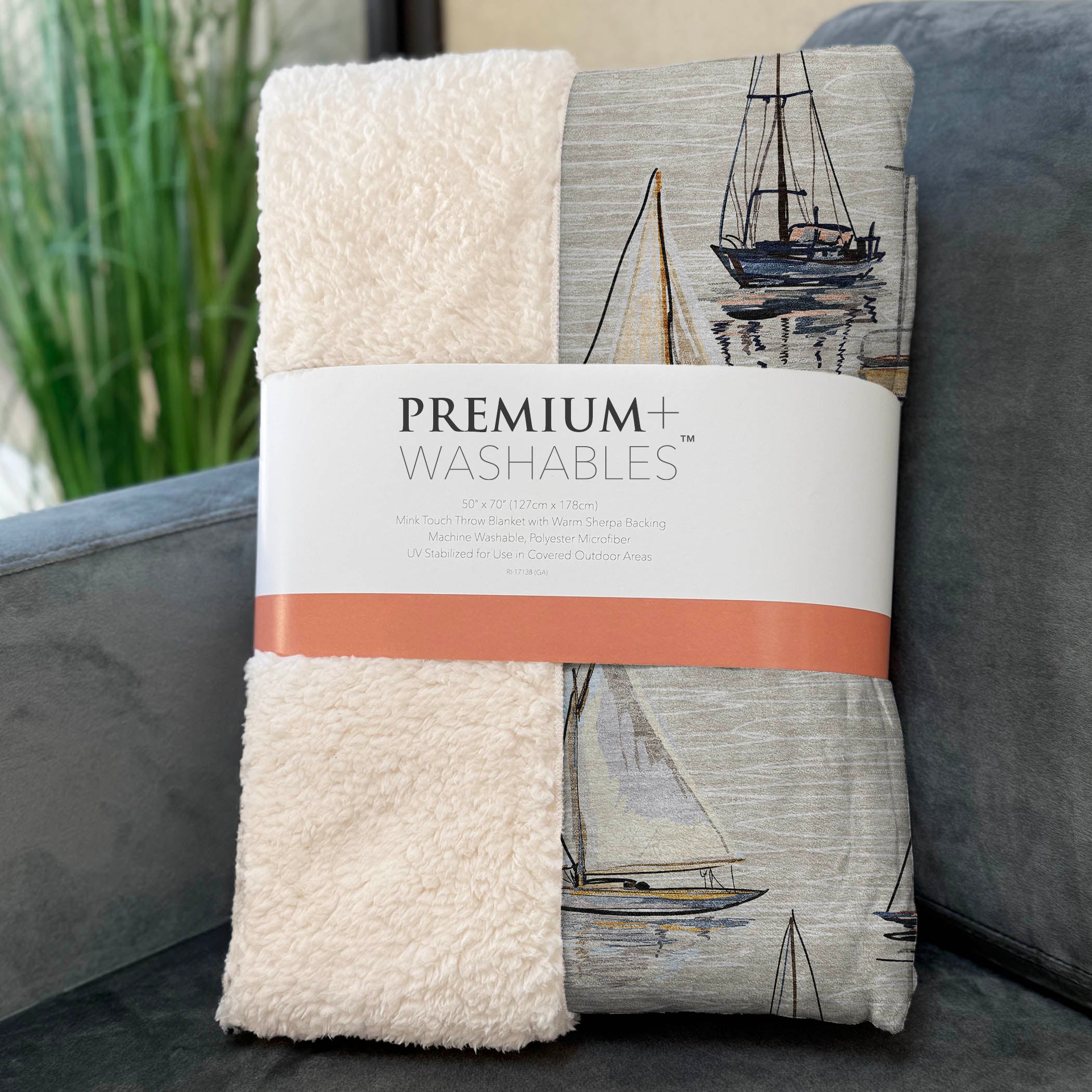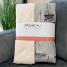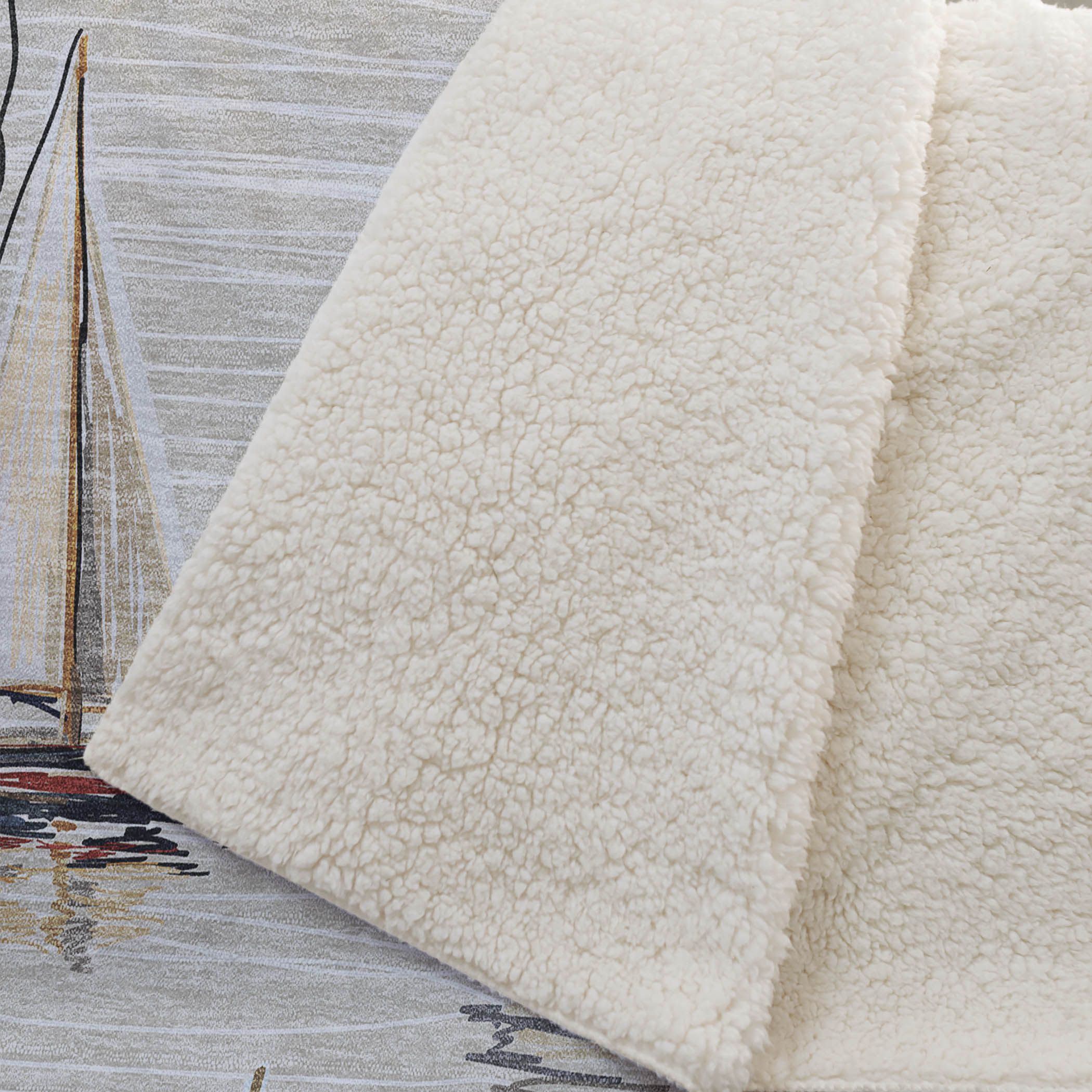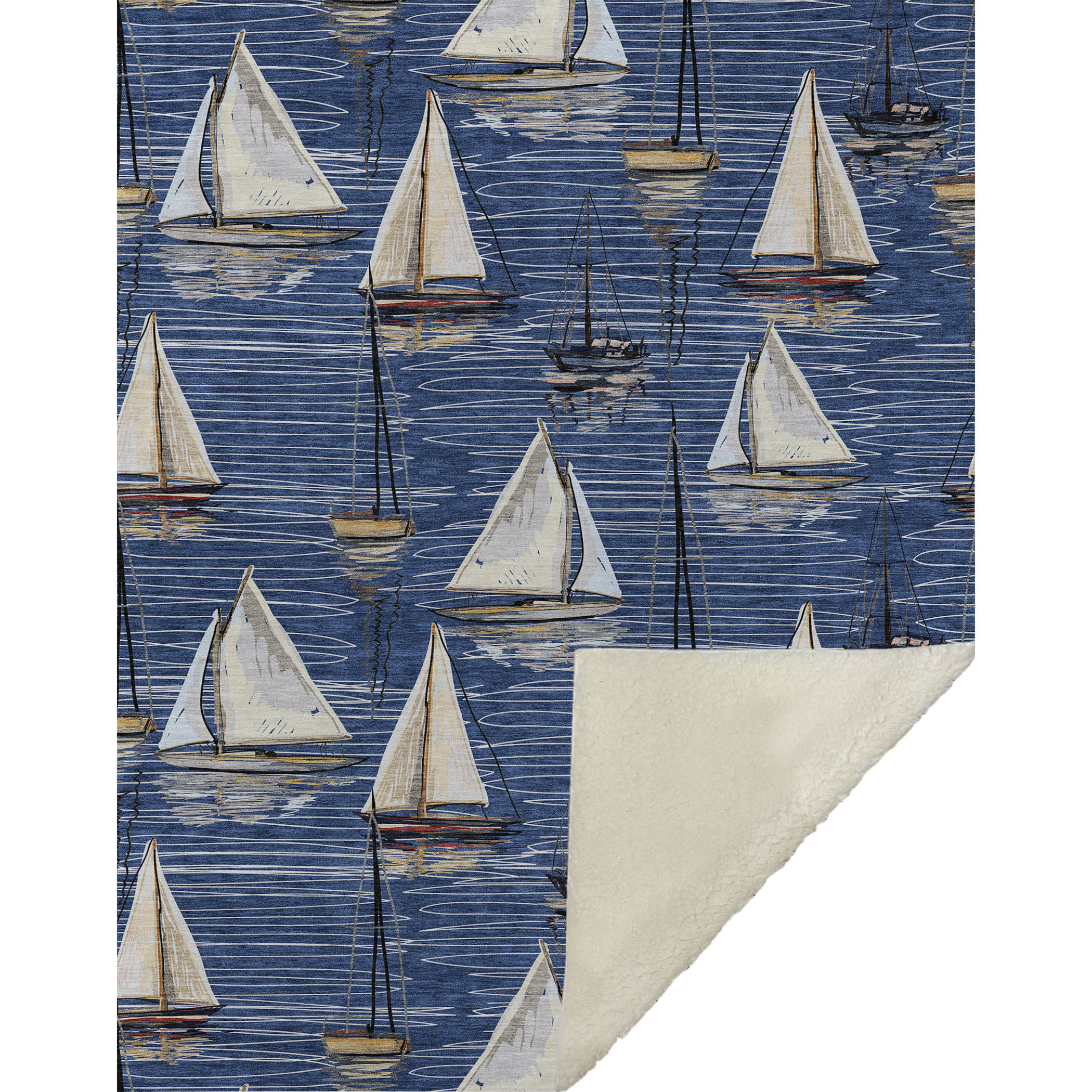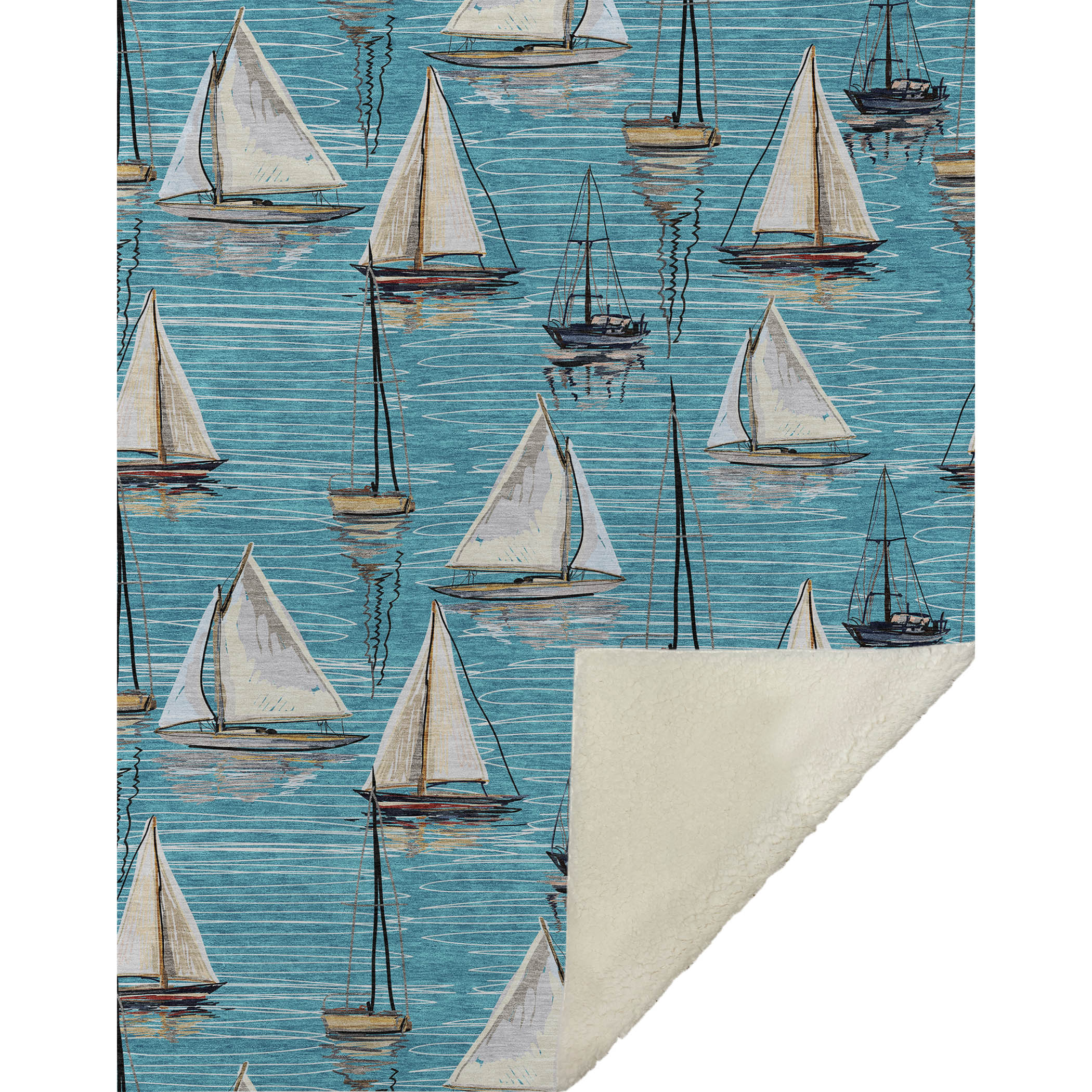 Set sail on a journey of comfort with the coastal charm of small detailed sailboats dancing across a serene, water-like backdrop. The oversized 50" x 70" design provides a generous wrap, featuring a velvet-like soft-touch front paired with a cozy sherpa backing for delightful warmth. Crafted from fade-resistant polyester microfiber, it holds its beauty both indoors and in sheltered outdoor spaces, and keeps care simple with its machine-washable feature.