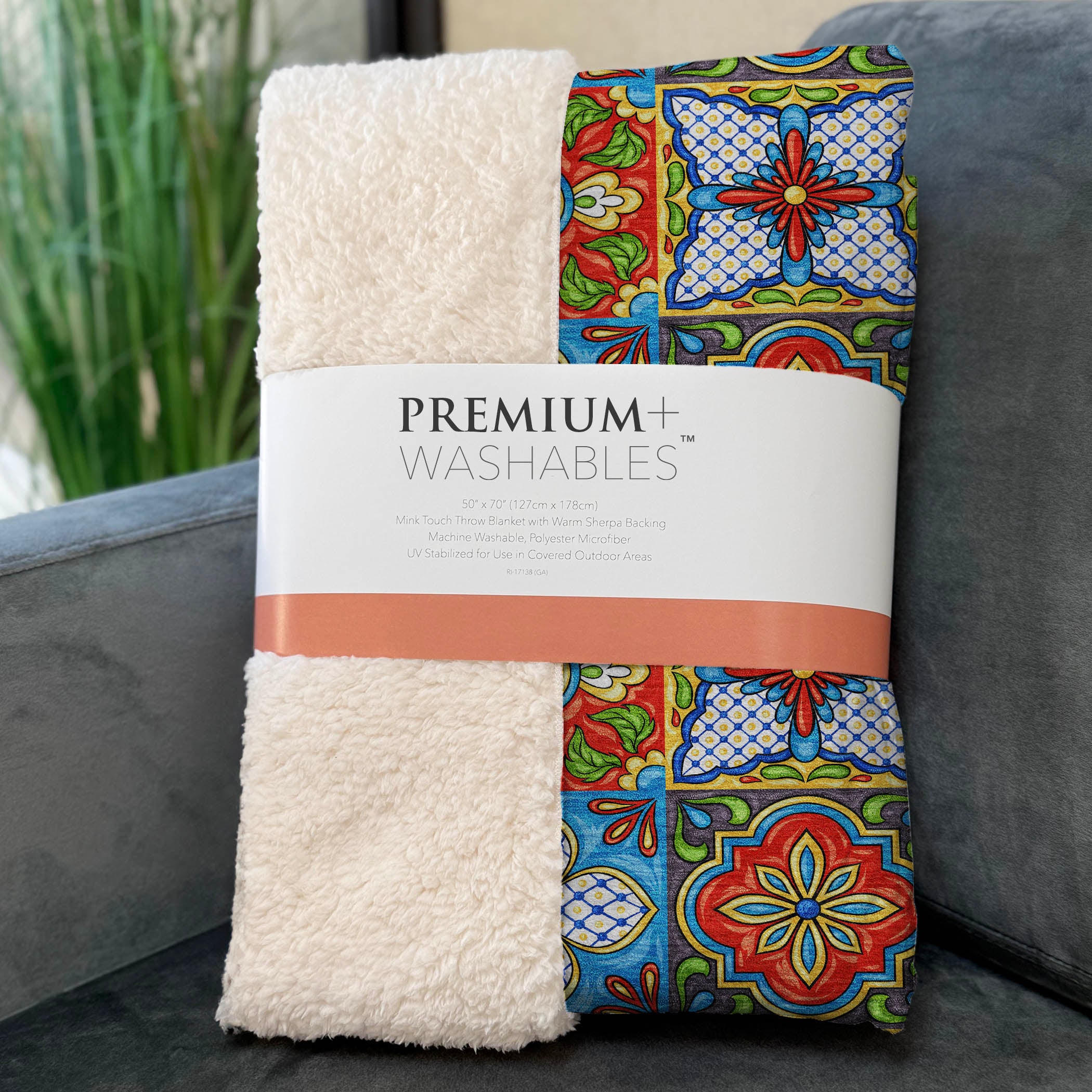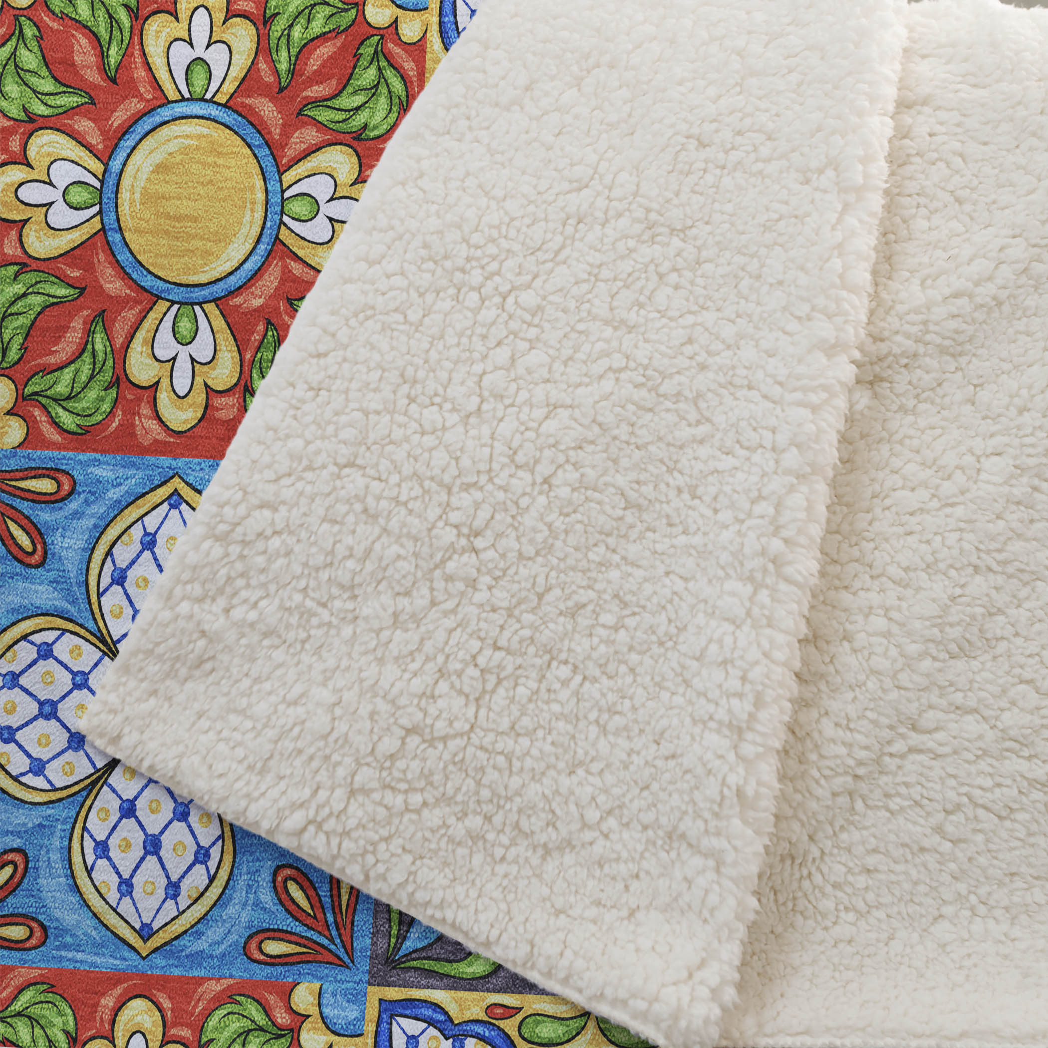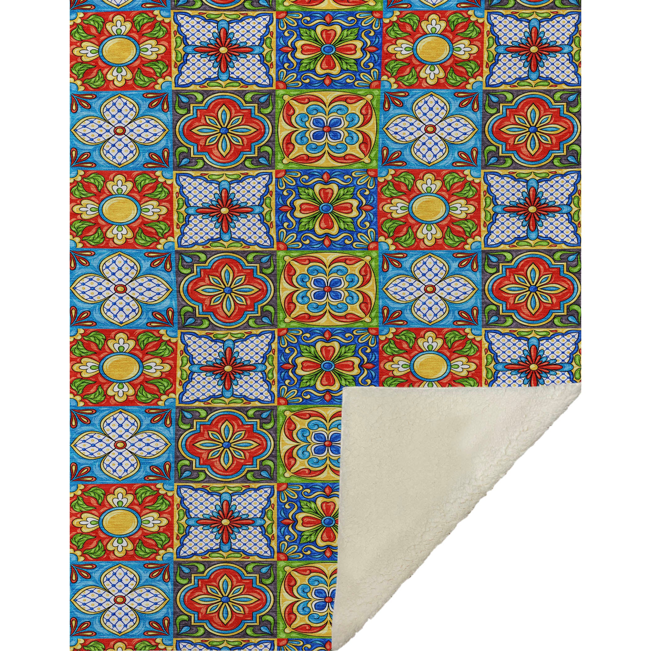 Step into a kitchen adorned with the vibrant spirit of Spanish tiles, where classic patterns echo Mediterranean warmth and style. Designed to capture the essence of sunlit terraces, the oversized 50" x 70" dimensions provide exceptional coverage, enhanced by the luxuriously soft-touch front and cozy sherpa backing for ultimate comfort. Created from fade-resistant polyester microfiber, it's perfect for both indoor and covered outdoor settings, and offers the ease of premium machine washability for hassle-free care.