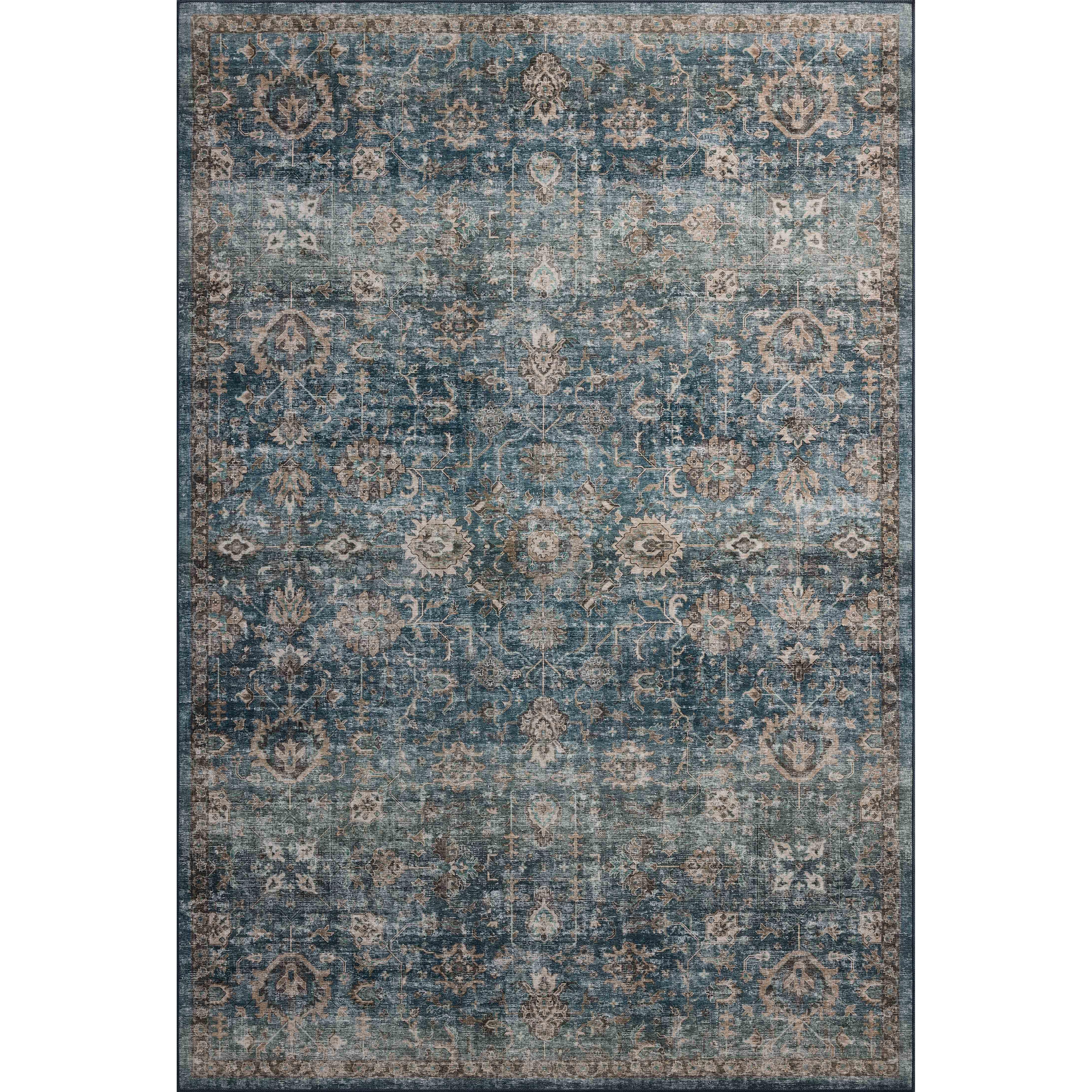 The Anniston Collection is a washable rug with traditional motifs in beautifully saturated and distressed tones. This durable area rug is power-loomed of polyester in China and designed for the busiest rooms of the home—living rooms, bedrooms, kitchens, hallways, and more. It can be washed in a home washing machine without an agitator, depending on the size. Any rug size 5' x 7'6" or smaller, including all runners, can fit into a washing machine that’s 3.4 cubic feet or bigger; 6' x 9' rugs require a washer that’s 4.2 cubic feet or bigger; 7'6" x 9'6" rugs require a washer that’s 4.8 cubic feet or bigger; 9' x 12' rugs must be washed in a commercial washer with at least a 60-lb. capacity. Wash in cold water, delicate cycle, with mild detergent, and no bleach; hang dry or lay flat to dry.