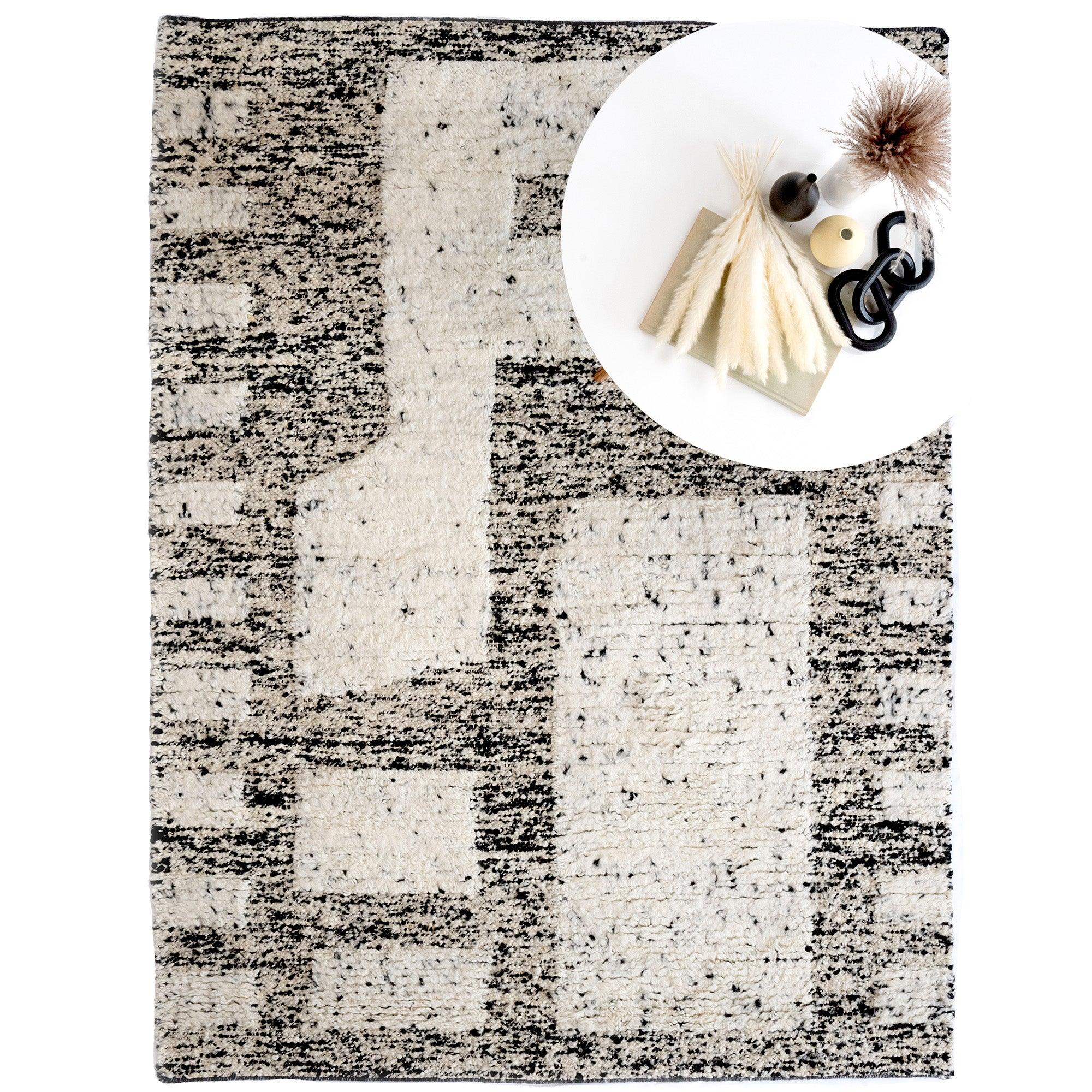 Aria Black White rug collection, where a breath of fresh air meets contemporary design. Ariette is the perfect name for this range, embodying its cloudlike wool texture and captivating geometric boho patterns. The high-low pile showcases stunning tonal variations and exquisite textures that seamlessly complement your bohemian decor style. Crafted from 100% natural, undyed wool and hand-woven by skilled artisans in India, Aria is not only a chic addition to your space but also an eco-friendly choice.