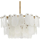A cousin of the popular Eloise the Leon features three tiers of white glazed glass plates with a matching glass cover over the brass canopy. The classically elegant three-light chandelier is characterized by striking finishes and organic forms. The steel frames features an antique brass finish beautifully contrasting the oyster-like forms of the glass plates each with its own unique finish. Approved for use in covered outdoor areas. Finish may vary.