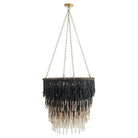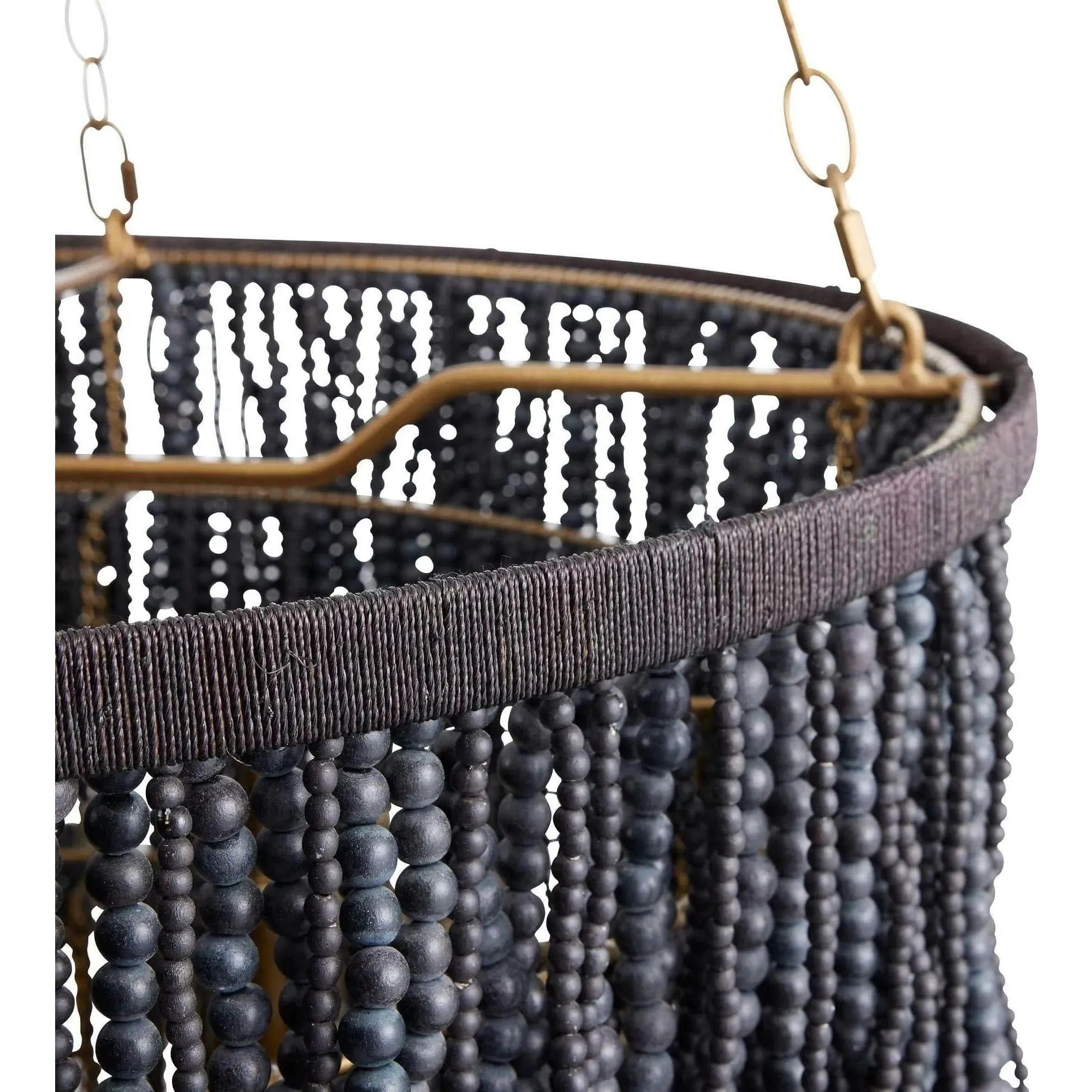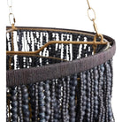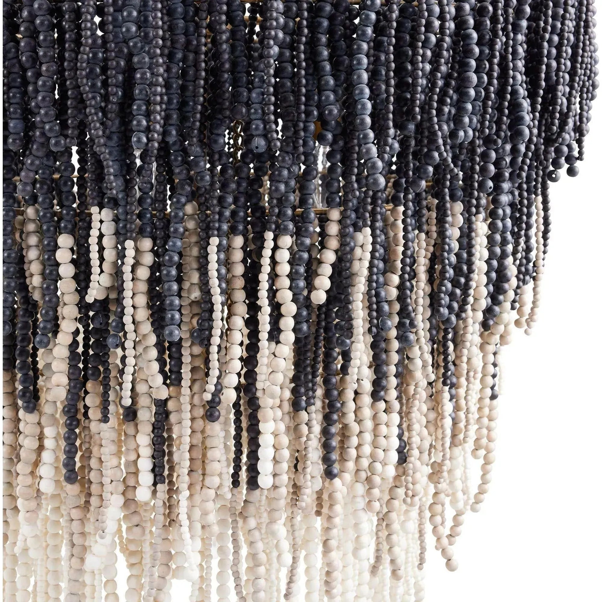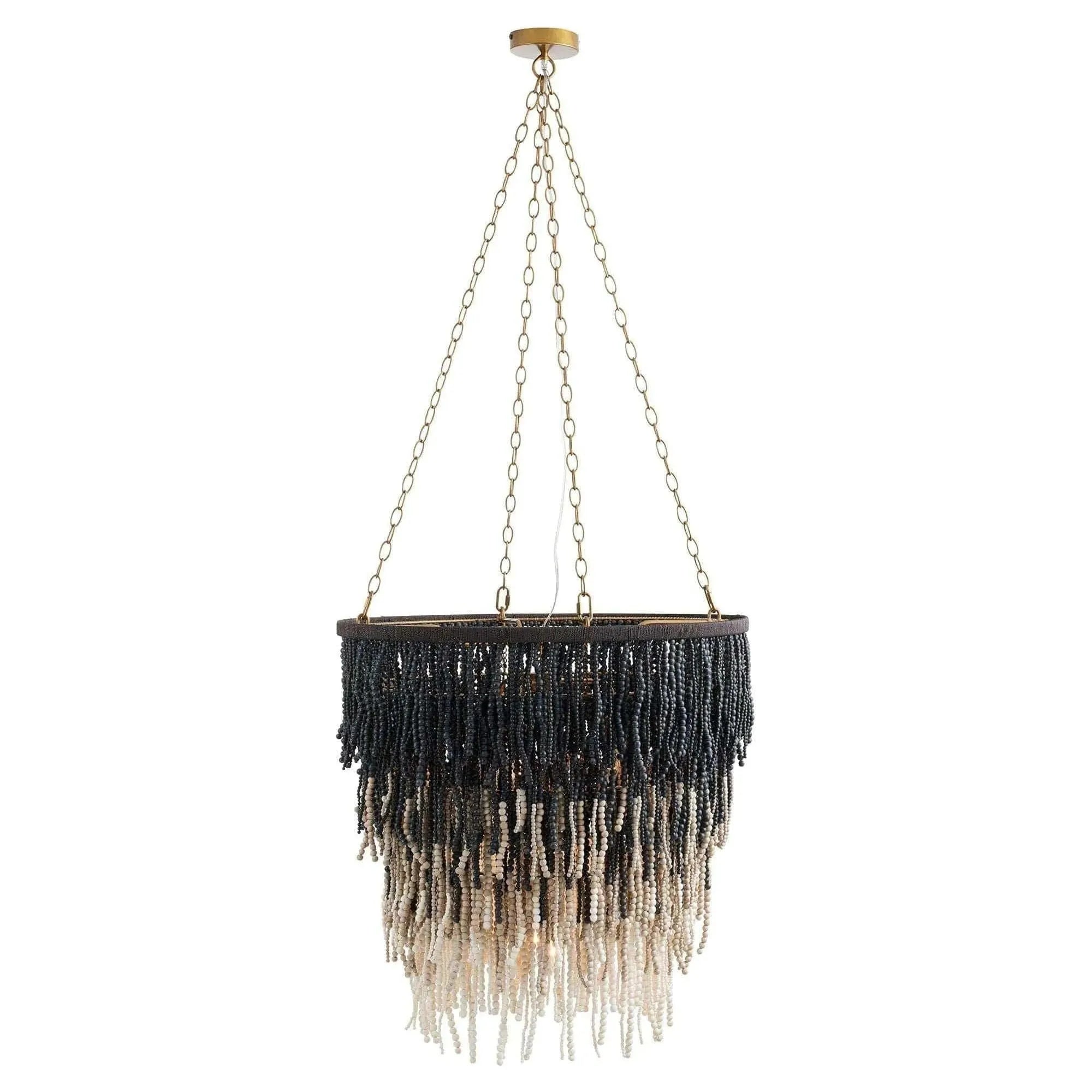 Showcasing unique design and materials, the Lizzy Chandelier is created with a layered concentric construction crafted from black, gray, and white wooden beads that are strung from an antique brass iron frame. The melange of neutral hues, along with the cascading formation of the beads, creates an ombré effect. A cluster of five lights illuminate the entire piece and highlights every detail and texture. Finish will vary. Additional chain available (CHN-249).