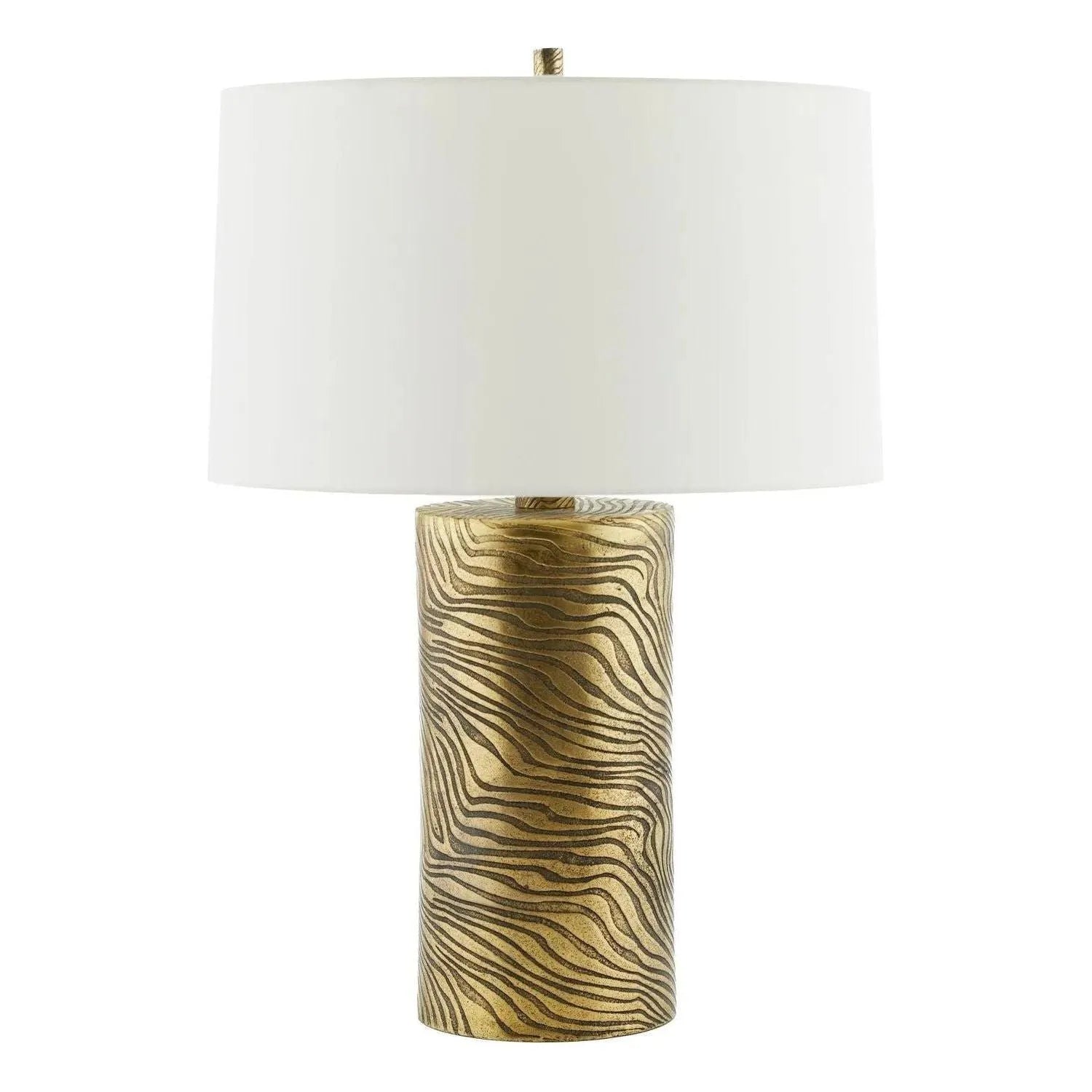 The Samoa presents a fiercely stylish way to illuminate a space. Cast antique brass aluminum is engraved with a stylized animal print. The textural lamp features a matching cylinder metal finial and is topped with off-white silk drum shade lined in off-white cotton. Finish will vary.