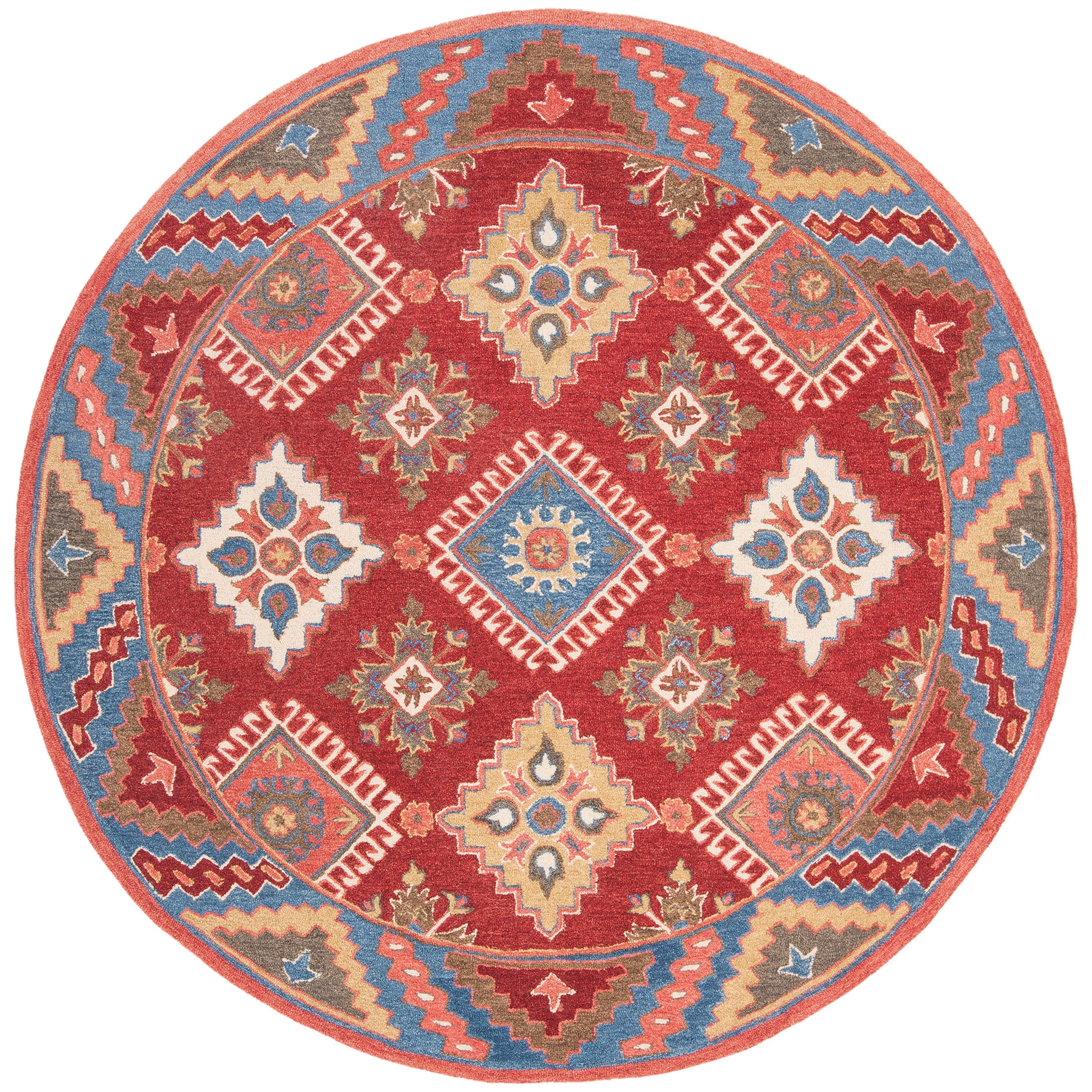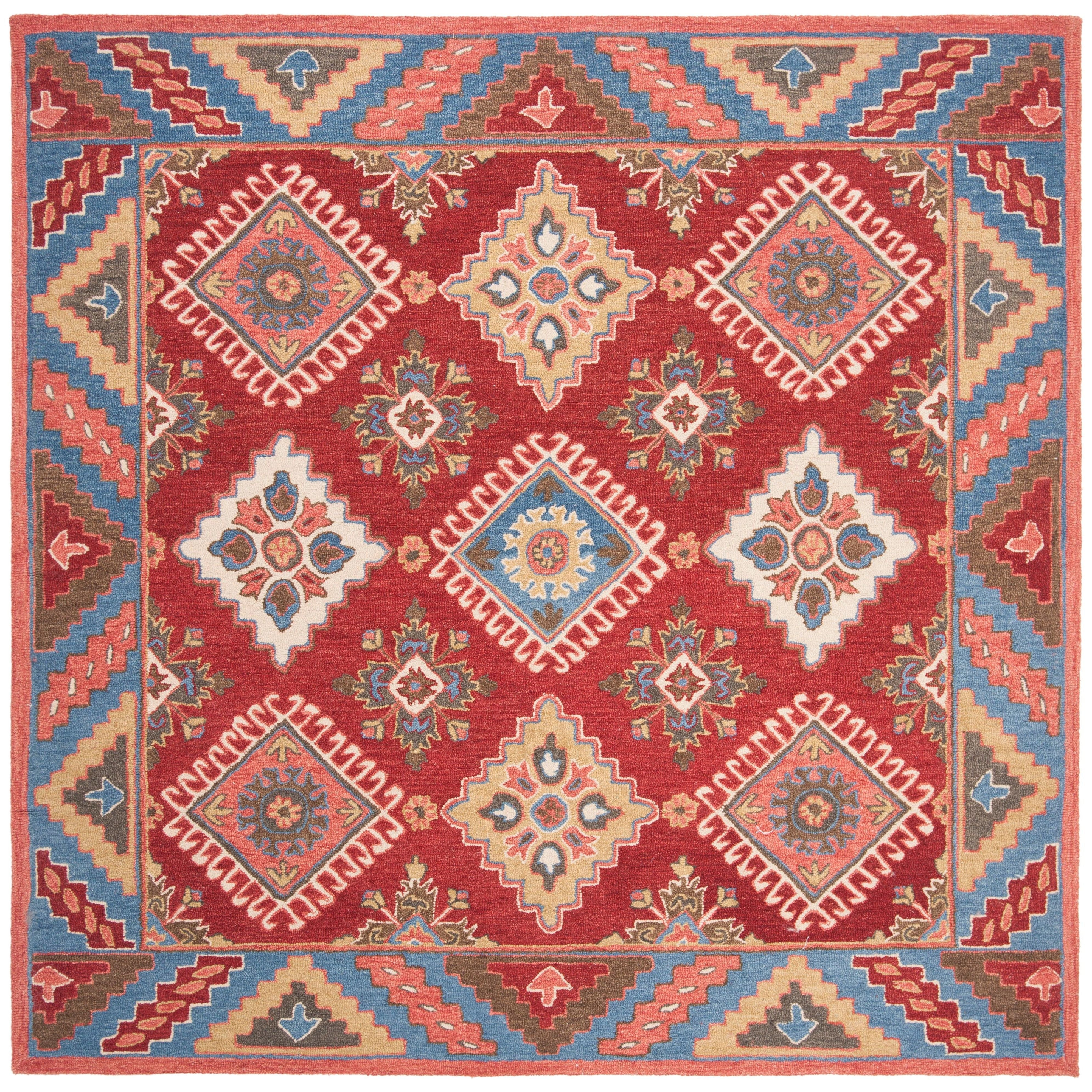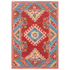 Aspen APN803Q Red Blue rug from the Aspen Collection, a perfect blend of rustic-chic charm and tribal-art inspired designs. This trendy rug features a sublime color palette and fashionable hues that effortlessly revive tribal motifs. Crafted from pure wool in a low loop pile, the Aspen rug offers both style and comfort underfoot, with an approximate thickness of 0.5 inches.