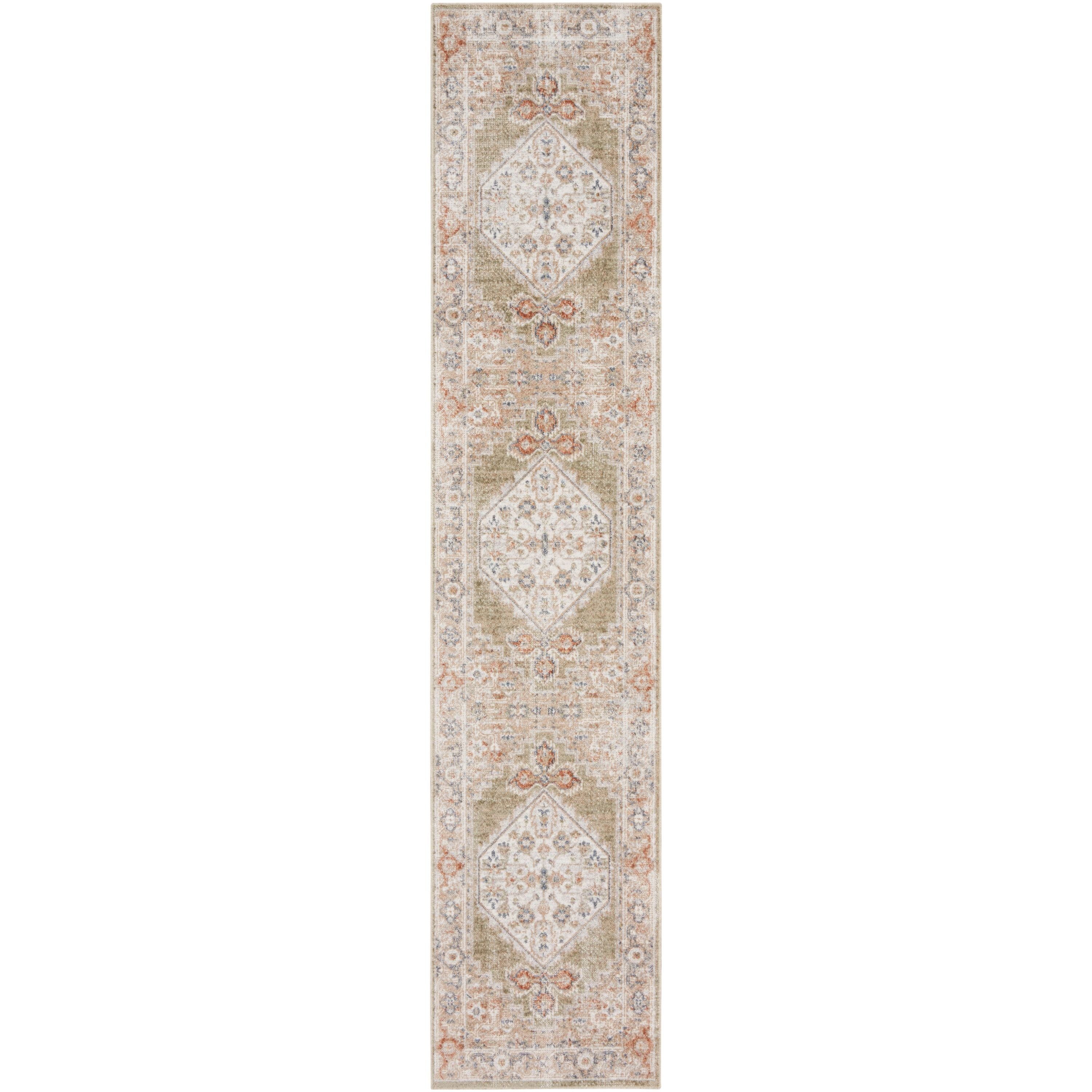 Astra Machine Washable ASW11 Sage Multicolor rug, a perfect blend of vintage charm and modern convenience. This Persian rug from the Astra Machine Washable Collection showcases an elegantly faded floral medallion pattern in a soothing sage green multicolor palette. The timeless design is elevated by a stunning sheen that beautifully changes tones when exposed to different lighting conditions.