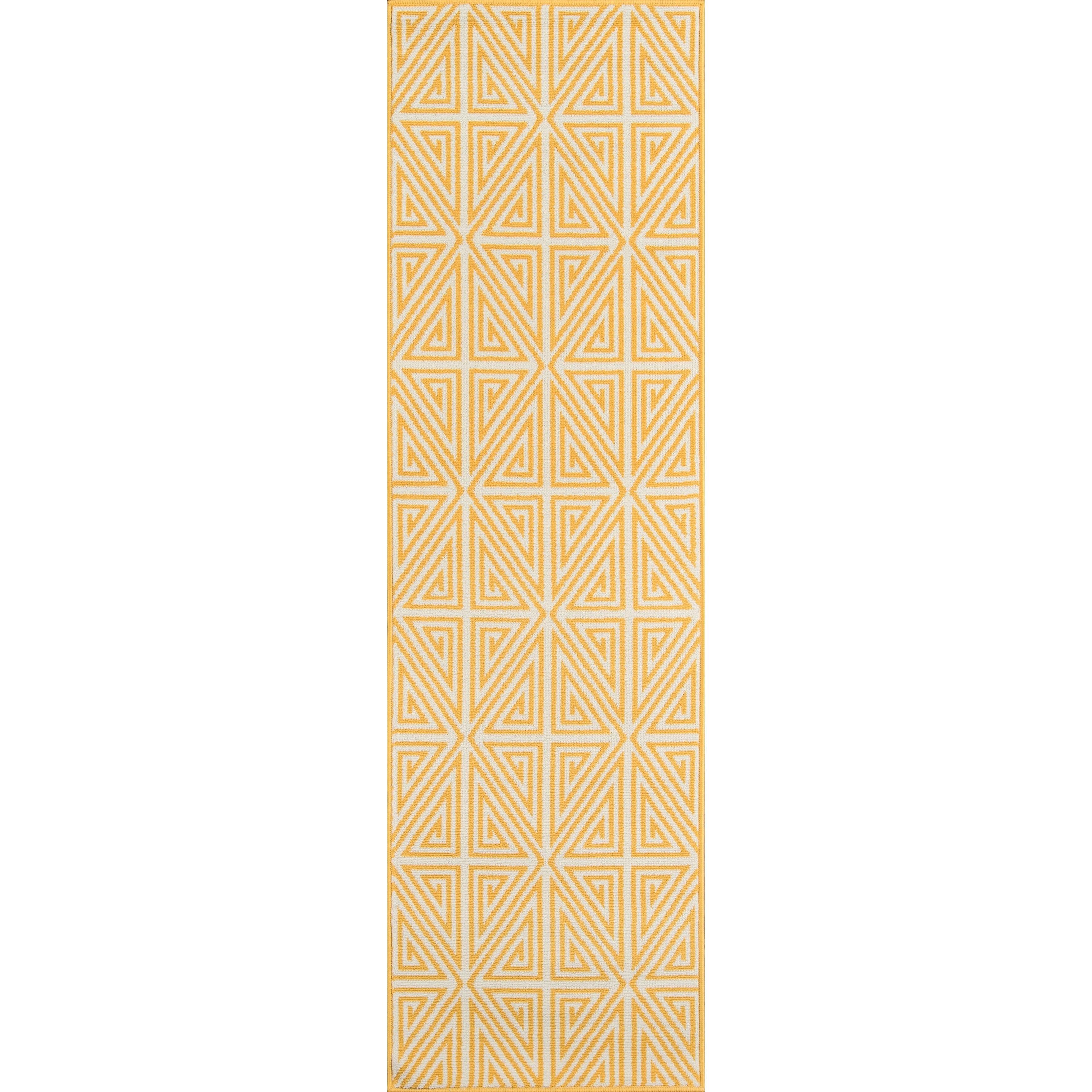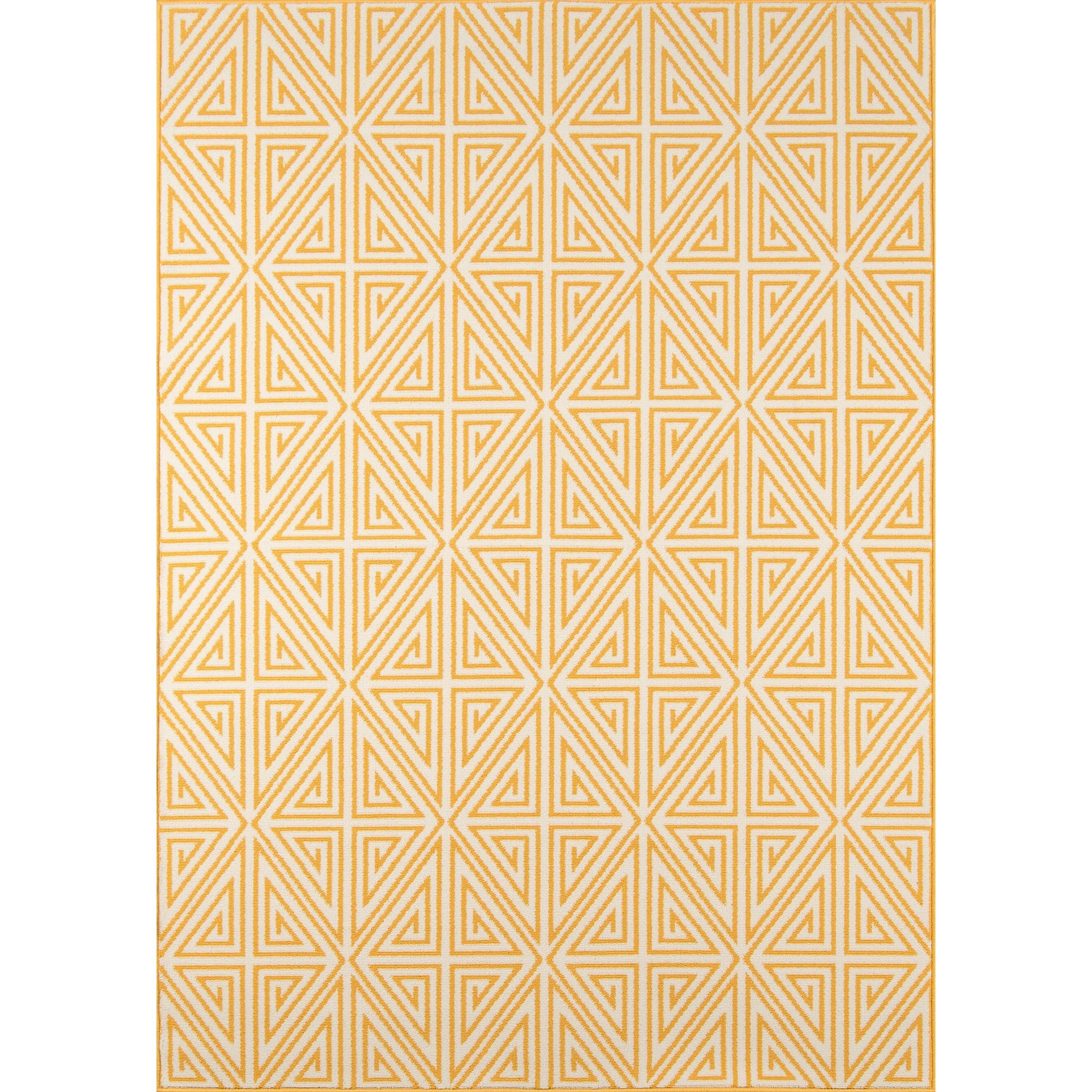 Baja Baj 4 Yellow area rug, a versatile and stylish addition to your indoor or outdoor living space. This all-weather rug features a blend of stripes, diamonds, trellis, and nautical motifs like ropes and anchors, creating a sophisticated look that complements any decor. Perfect for patios, porches, or pool decks, this rug is designed to withstand the elements with its durable power-loomed construction.