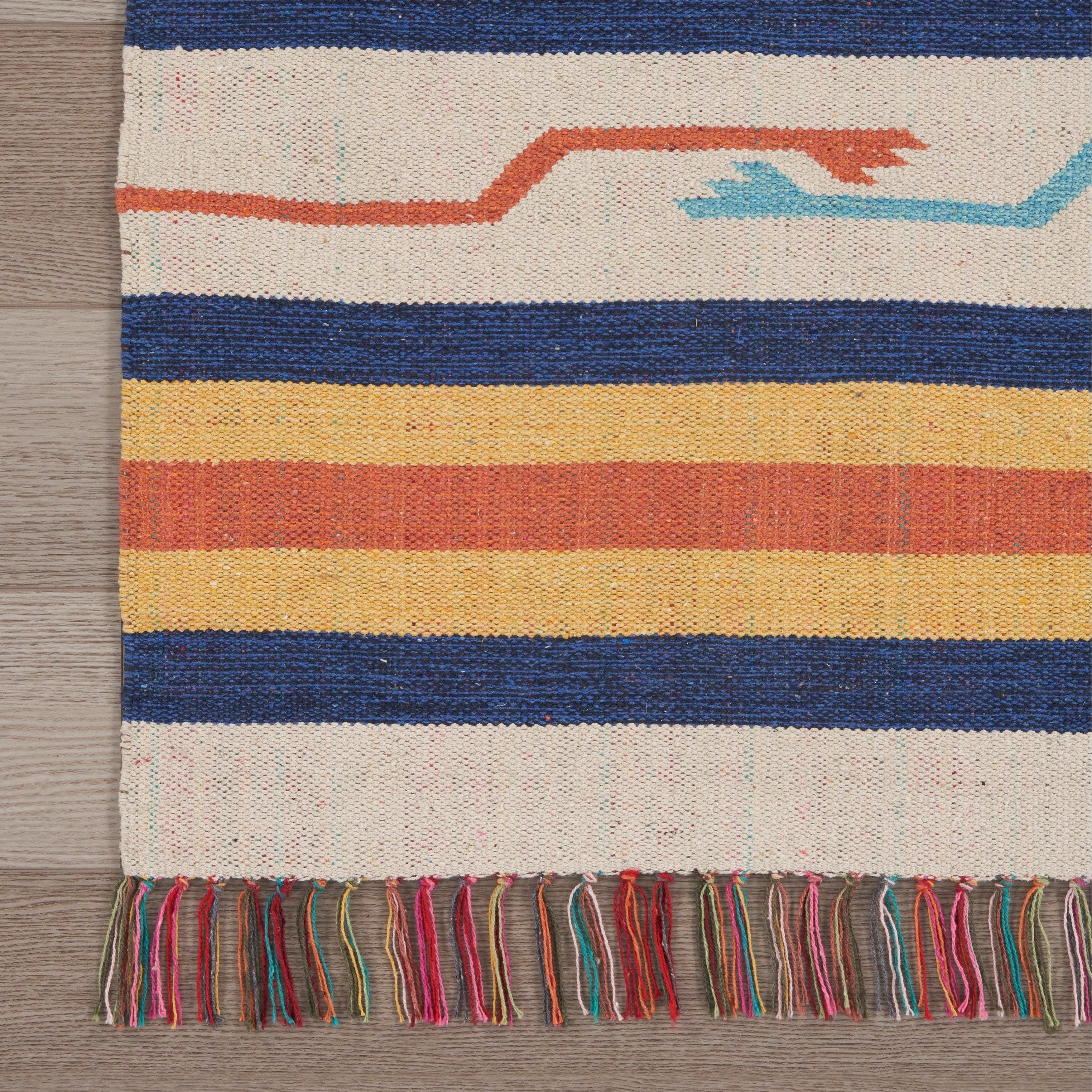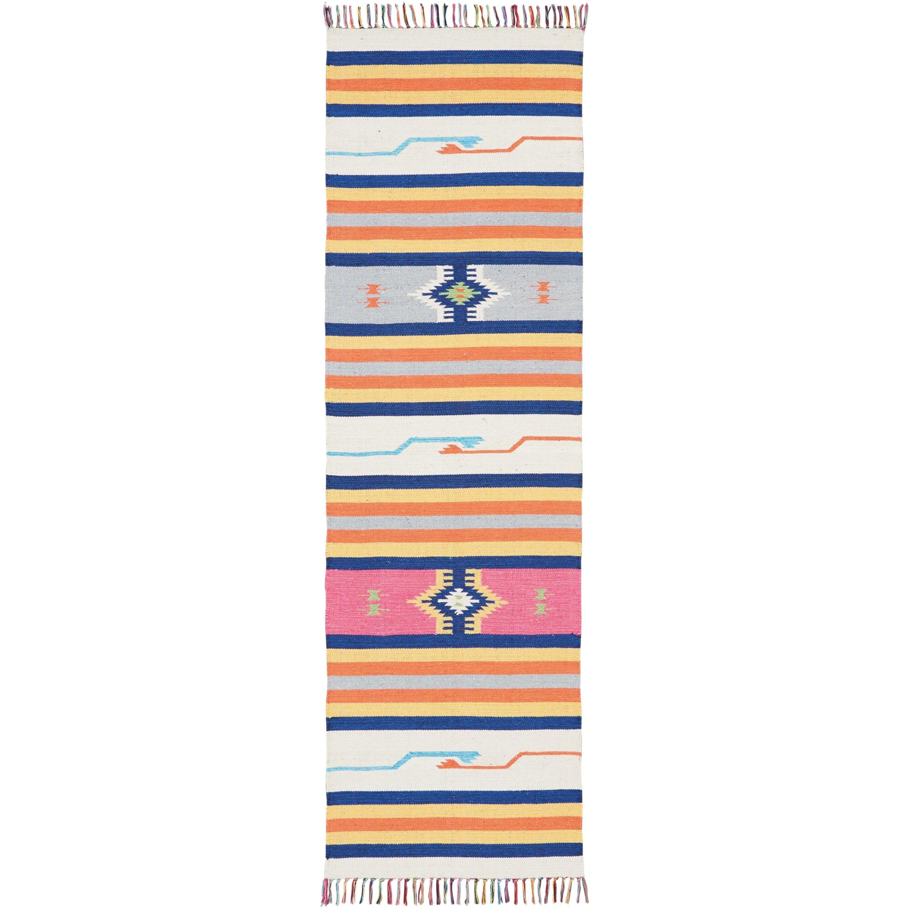 Baja BAJ01 Ivory area rug from our vibrant tribal-inspired collection. This Ikat style rug boasts a stunning rainbow of colors, including primary shades of red, yellow, and blue, complemented by hints of orange, turquoise, and pink set against a soft ivory background. The eclectic mix of hues adds a touch of Moroccan flair to your space, creating a lively atmosphere. Crafted with a flat weave design, this kilim rug exudes casual elegance perfect for any room in your home.