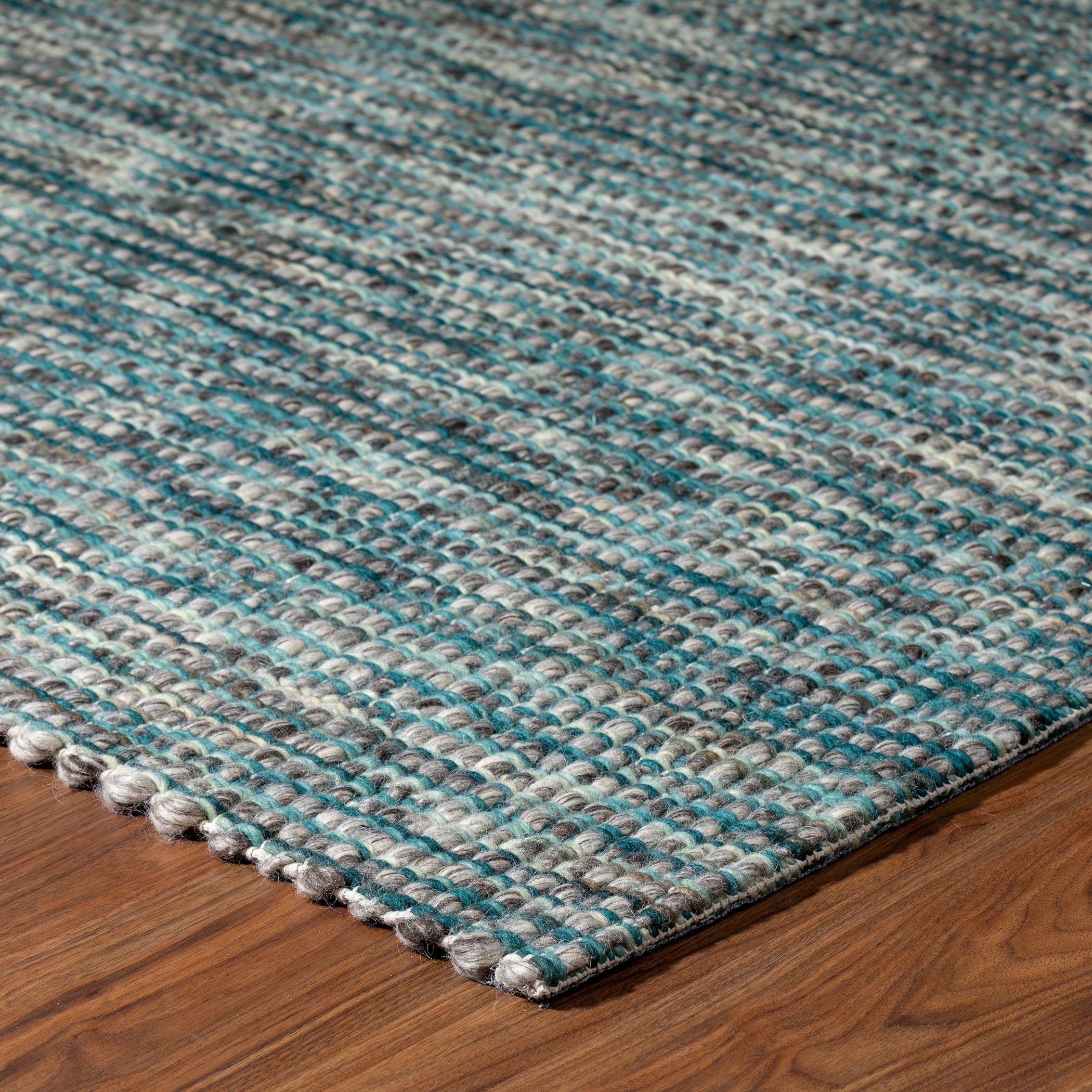 Bondi BD1 Turquoise rug, a stylish addition to your home decor. Crafted with high-quality wool, this rug features a unique "cobblestone" design that adds texture and warmth to any room. The undyed, tonal wool foundation creates a natural and earthy feel, while the vertical accent yarns are dyed to create a striking visual contrast.