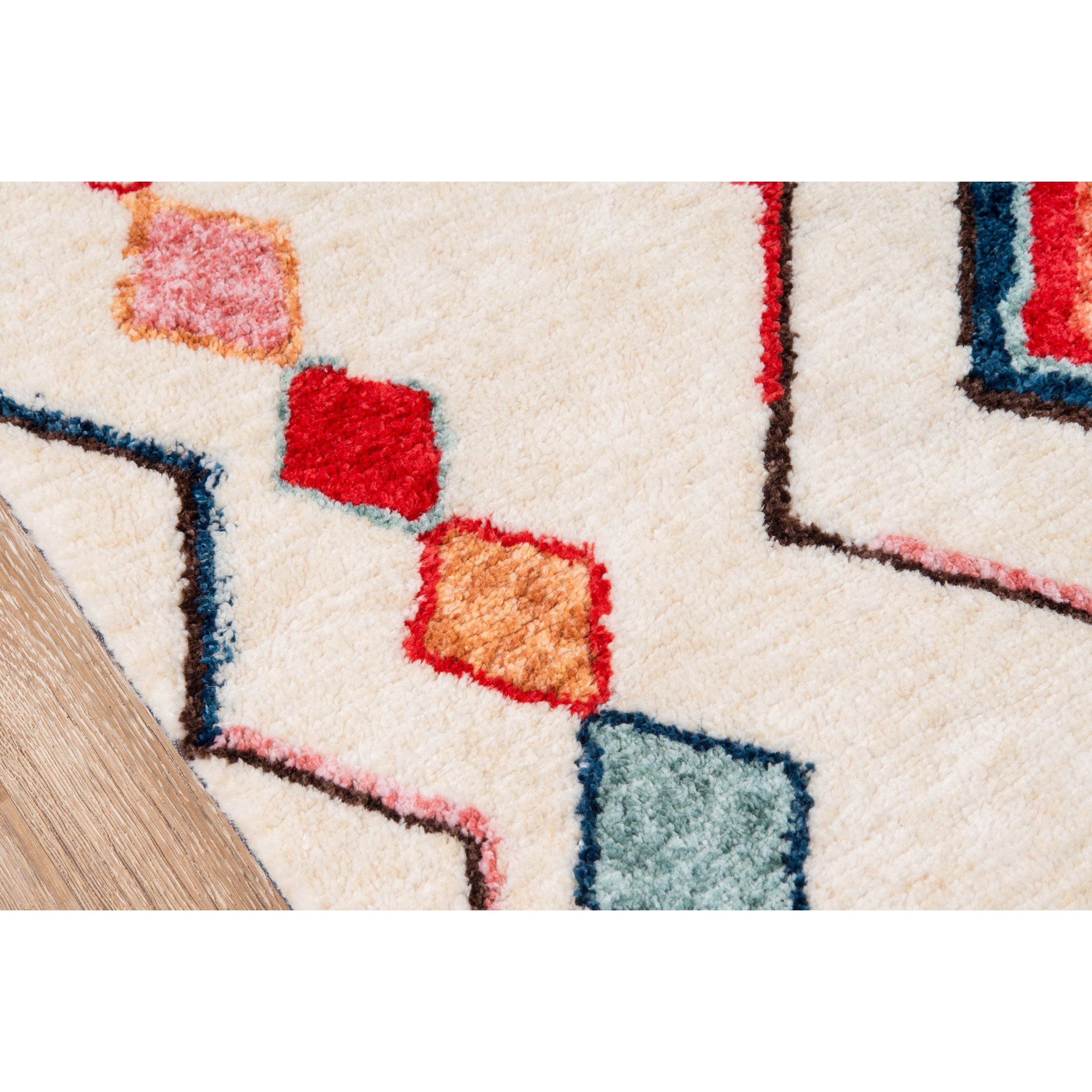Bungalow Bun 6 Multi, a modern area rug that effortlessly combines graphic geometric patterns with a bohemian color palette. This rug exudes retro charm with eclectic designs like freeform diamonds, tribal prints, colorful hexagons, and stripes reminiscent of decades past. Crafted from plush polyester fibers and tufted construction, this rug offers a fun and chic accent for any interior space.