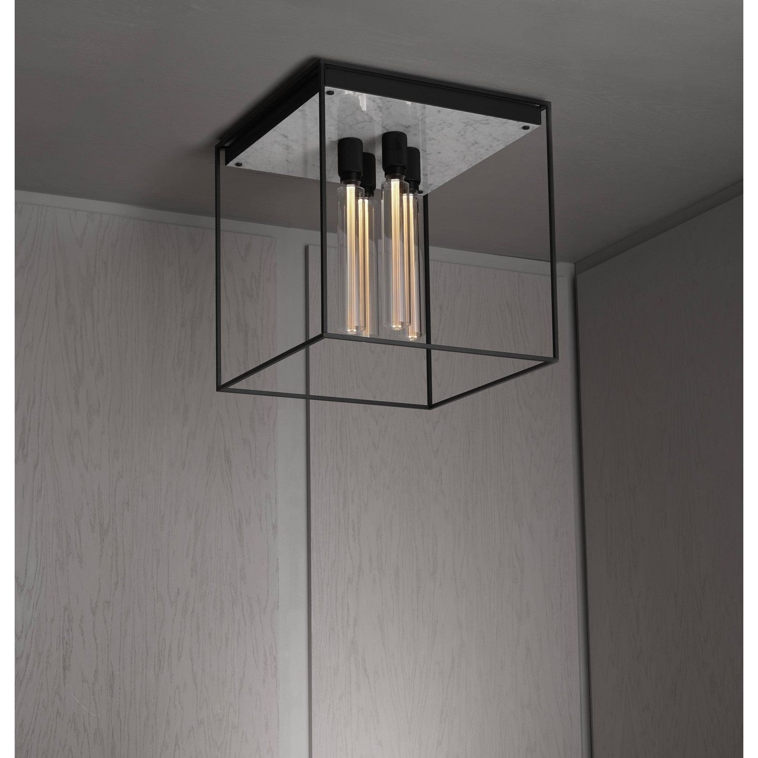 A ceiling light made from a matt black metal cage and comes with a polished Black or White marble back panel. The ceiling light is finished with a matt black knurled lamp holder and our signature penny buttons.