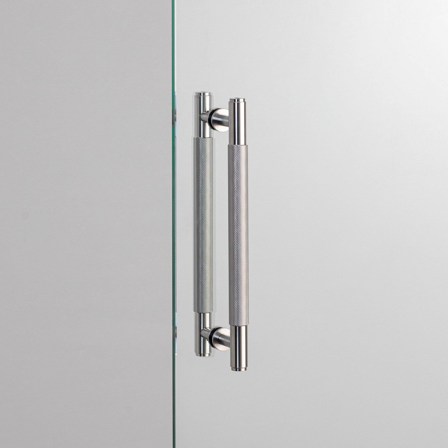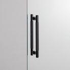 A double-sided pull bar made from solid black anodised metal. These pull bars feature our signature, diamond-cut, cross-knurl pattern and are refined by hand. Comes complete with small solid black metal discs. They work great on interior glass or solid doors with a minimum of 10mm thickness and a maximum of 60mm thickness. Not intended for use in wet environments. Included in the box is two pull bars with double-sided fixings.
