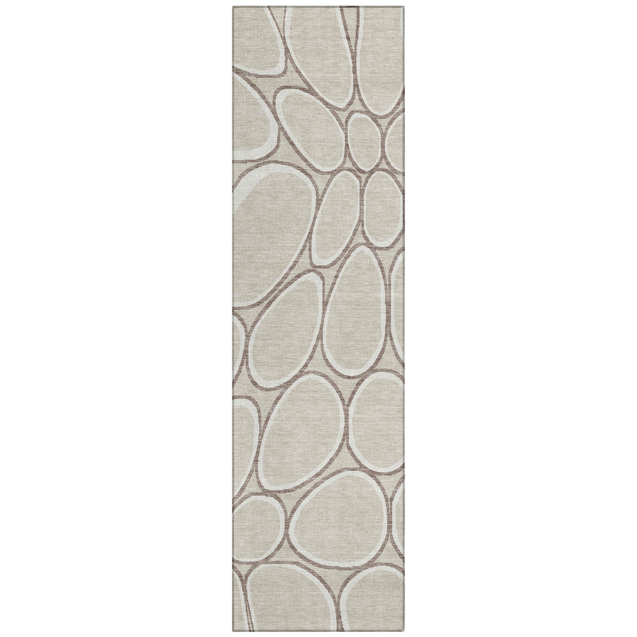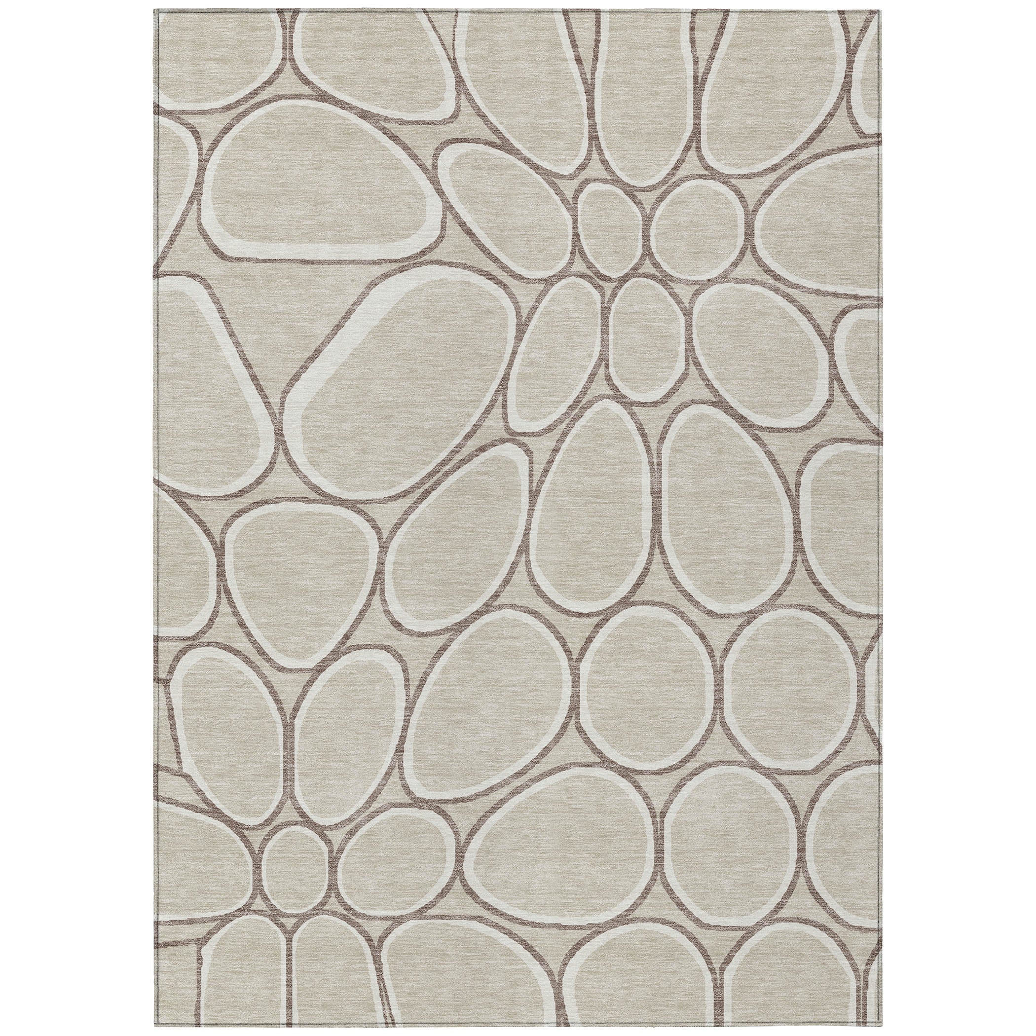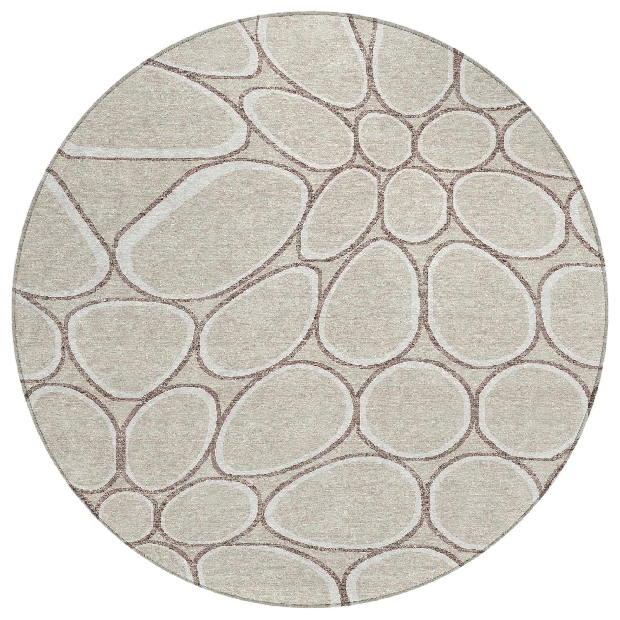 Discover the beauty of our area rug, where stone-shaped circles create an intricate path pattern, offering a stunning transitional and circular motif. This rug not only enhances your decor but is also practical, being UV stabilized for both indoor and outdoor use, ultra-thin for easy fitting, machine-washable for hassle-free maintenance, and designed to be both family and pet friendly.