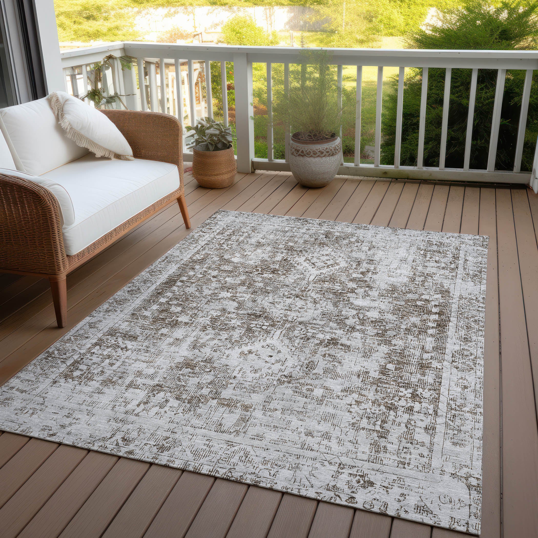 Showcasing a traditional design with distressed motifs and a border, this rug brings timeless elegance to your home. The global pattern enhances its sophisticated appeal. UV stabilized for versatile indoor or outdoor use, the ultra-thin construction ensures effortless maintenance. Machine-washable and family and pet-friendly, it’s perfect for busy households.