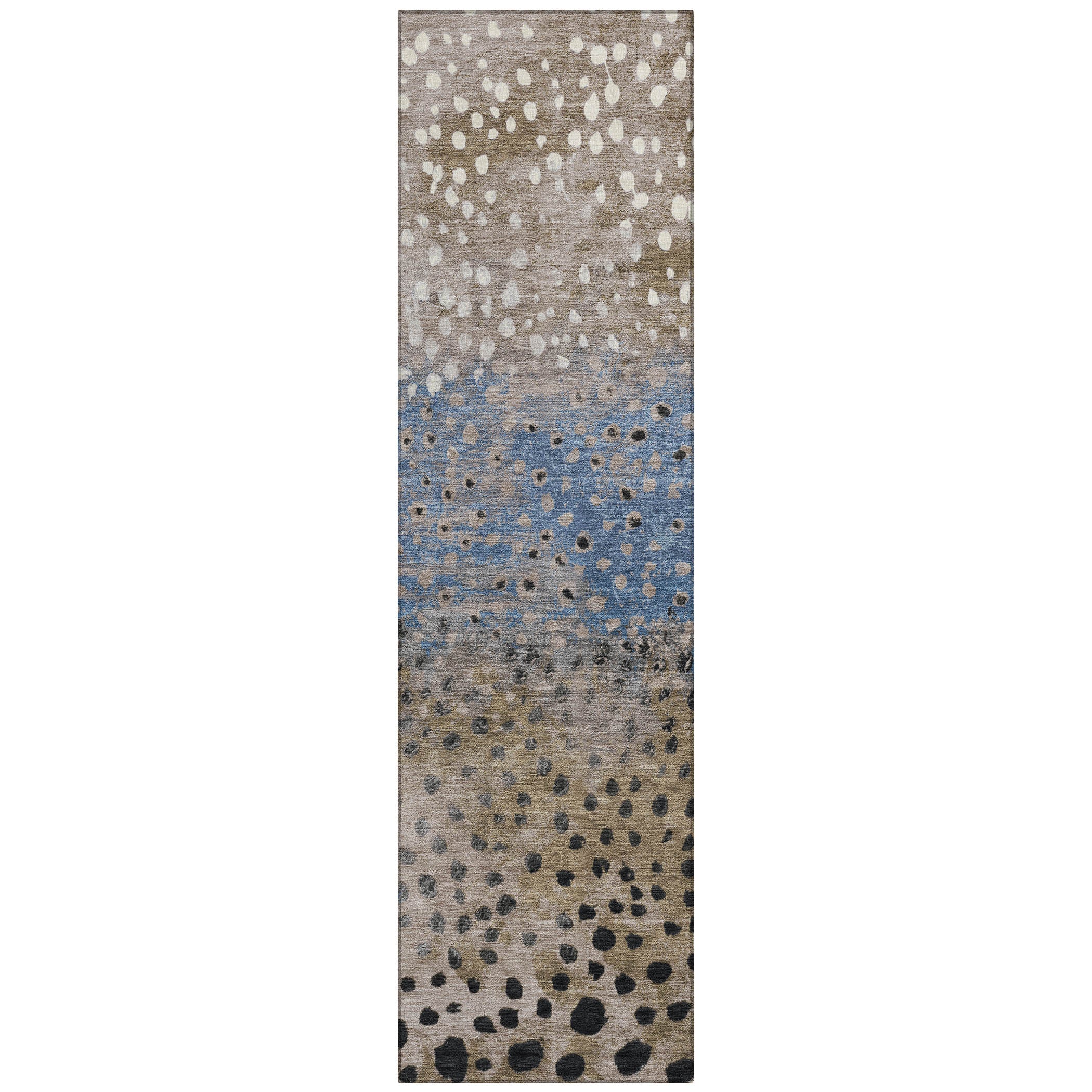 Enliven your space with the vibrant design of random-sized dots that float softly in this transitional rug. The dot pattern brings a lively touch to any room. UV stabilized for versatile use, it boasts an ultra-thin construction. This machine-washable rug is family and pet-friendly, making it a practical choice for busy households.
