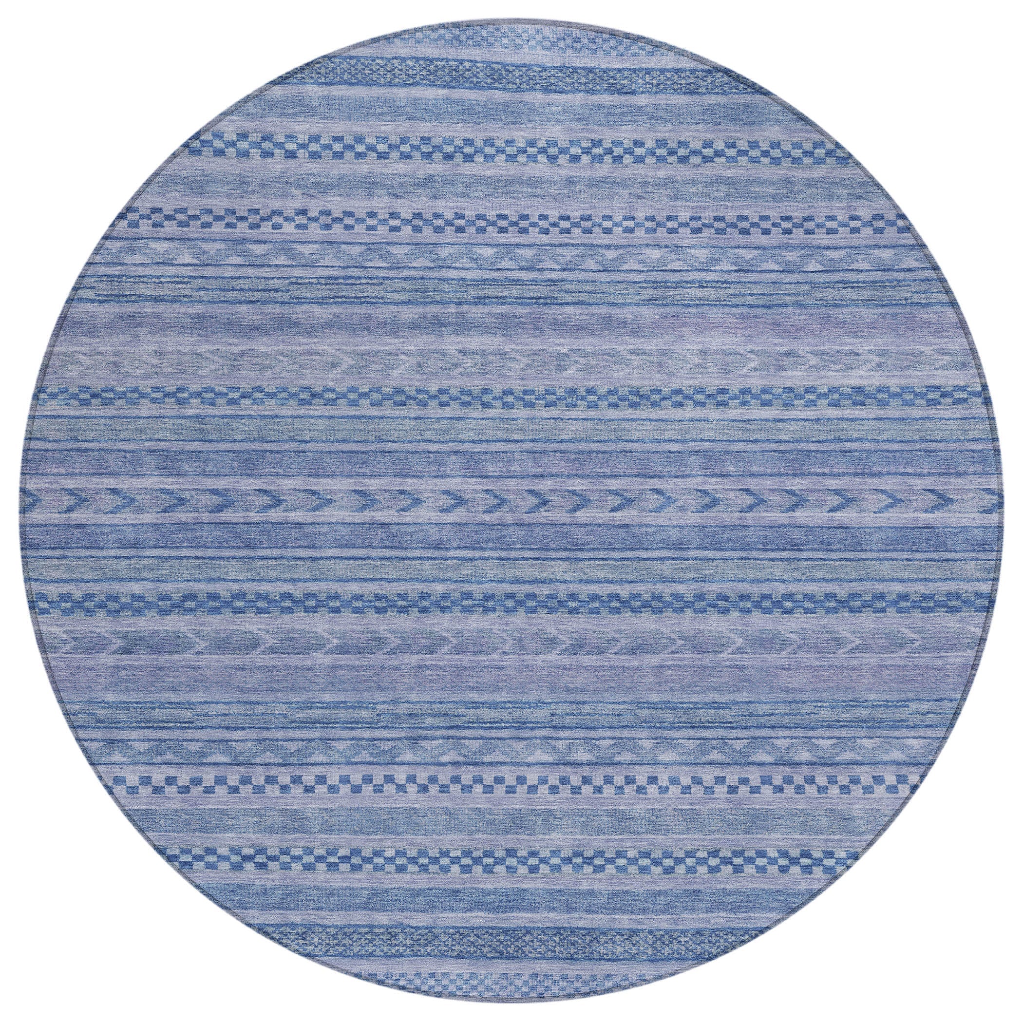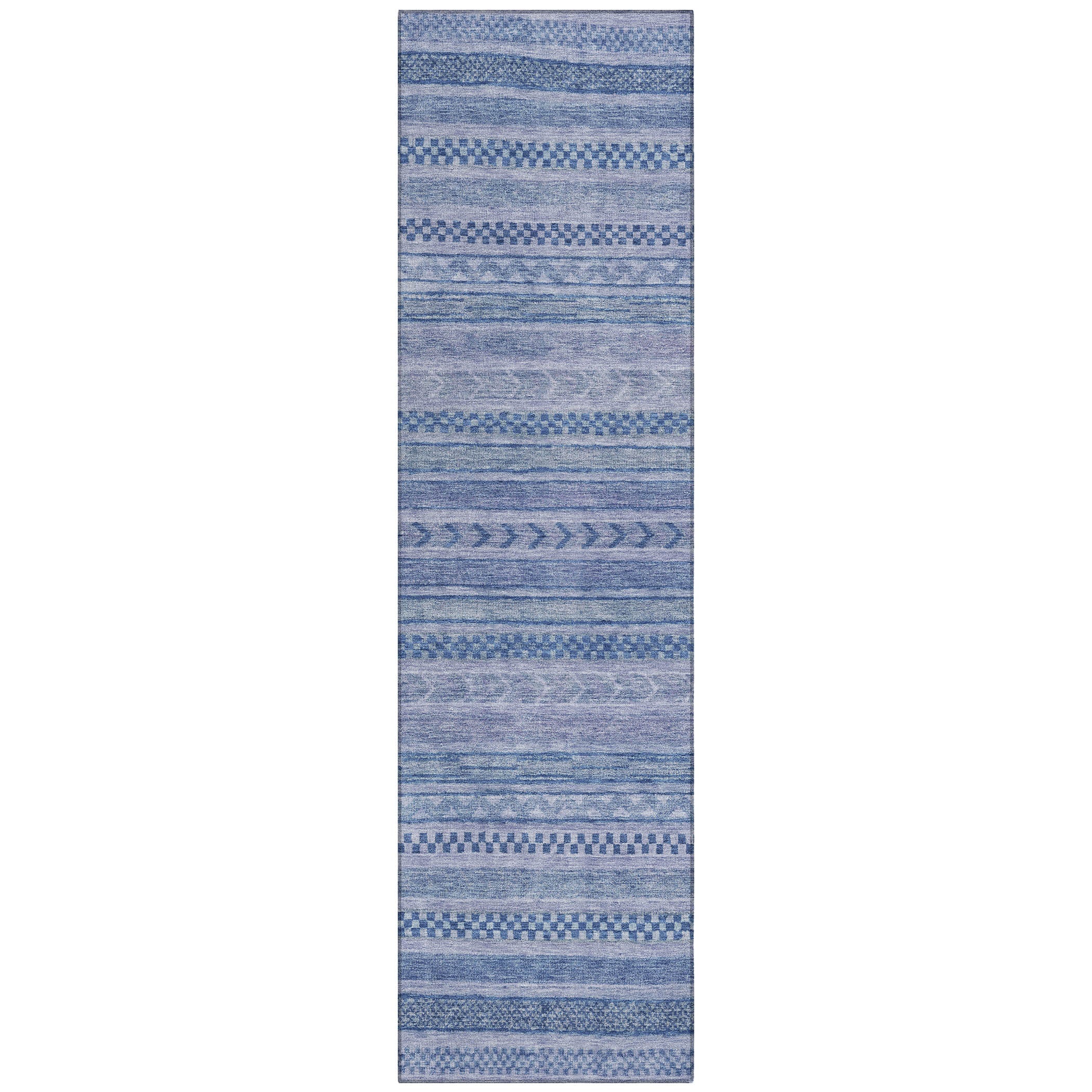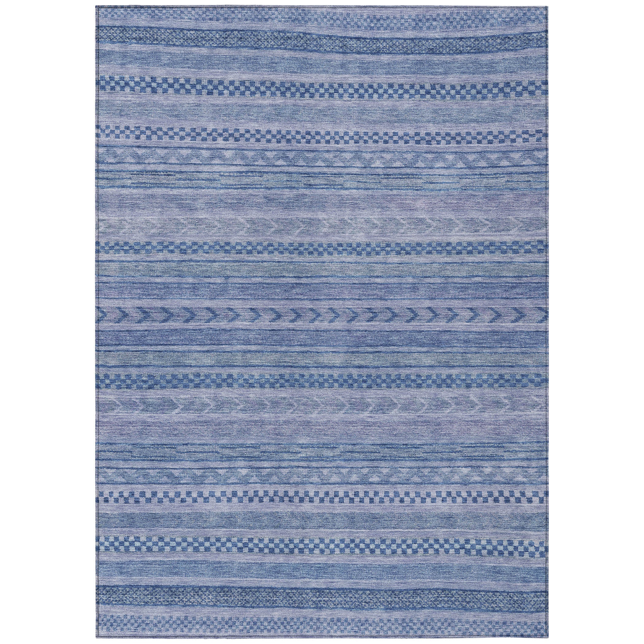 This transitional rug showcases small stripes with various motifs in horizontal patterns, creating a rich and textured design that suits any decor style. The stripe pattern adds a refined and sophisticated touch to your living space. UV stabilized for indoor or outdoor use, this rug is built to last while retaining its vibrant look. Its ultra-thin design ensures a smooth fit under furniture, and it's conveniently machine-washable. Ideal for family and pet-friendly environments, this rug combines practicality with aesthetic appeal.