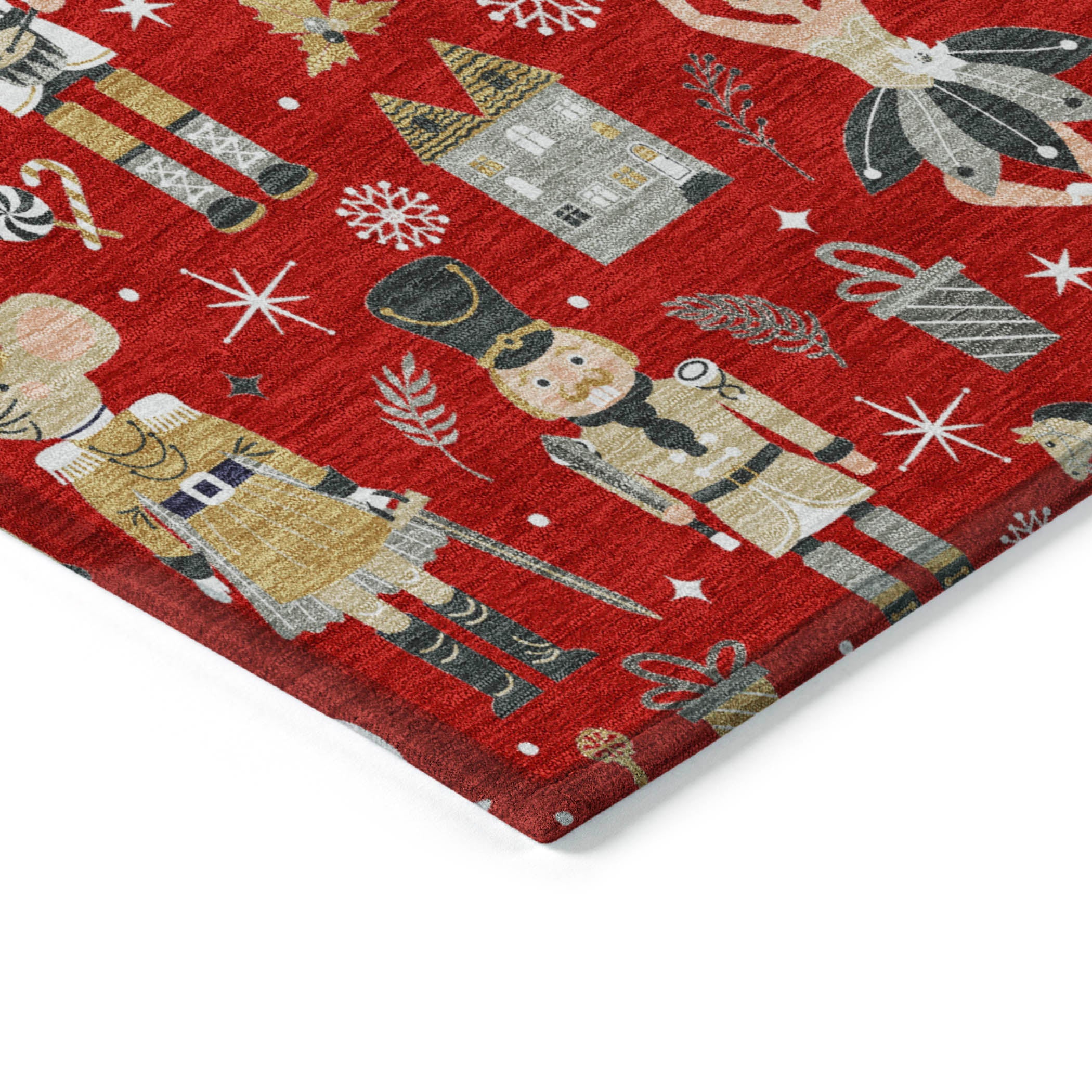 A charming combination of nutcrackers, trees, bows, rocking horses, and presents makes this rug a perfect addition for the holiday season. The playful inclusion of mice and angels brings a whimsical touch to the design, adding depth and festive cheer. Its transitional style allows the Christmas pattern to blend effortlessly with both classic and contemporary spaces. Designed for both indoor and outdoor spaces, this UV-stabilized rug features an ultra-thin construction that’s easy to clean and care for. Its machine-washable design adds convenience, while its family and pet-friendly nature ensures it can handle everyday wear and tear. Stylish and durable, it’s the perfect solution for busy households.