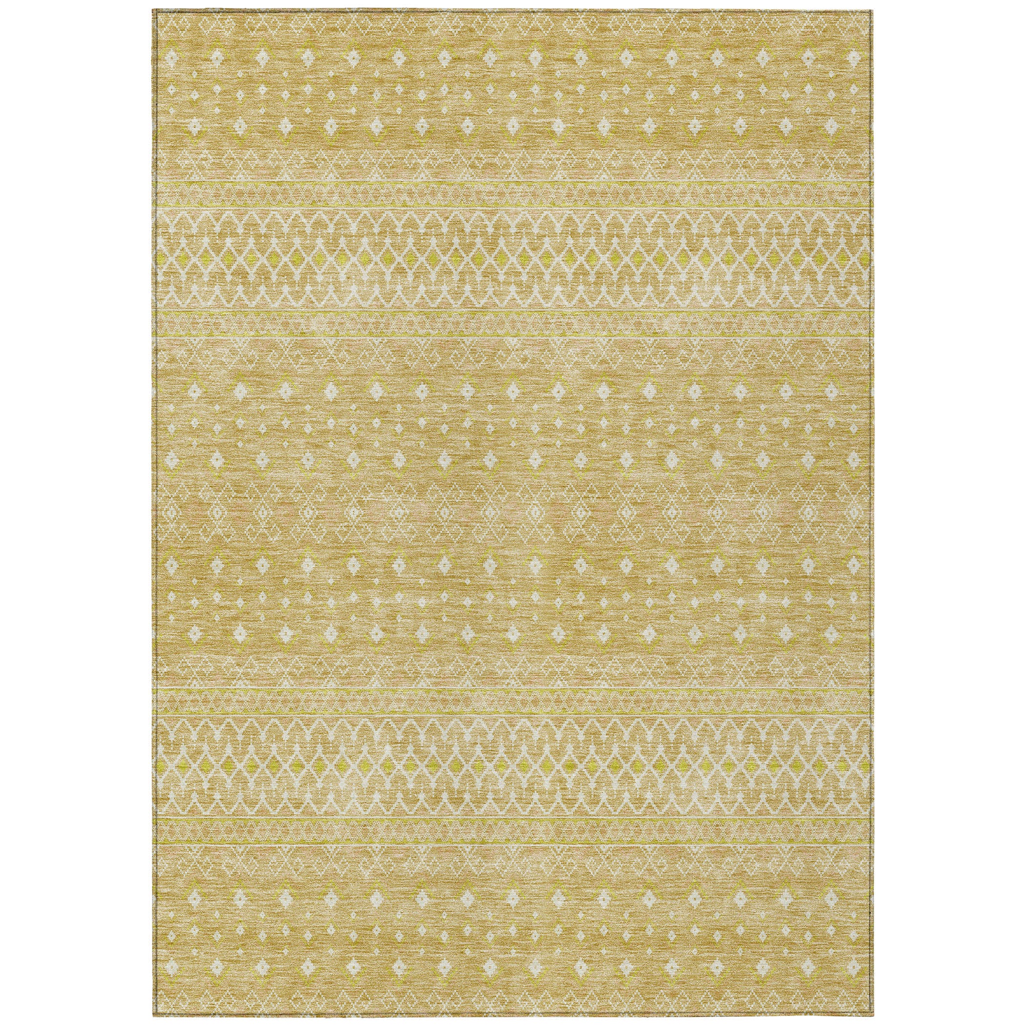 Chantille ACN709 Gold rug, a stunning blend of bohemian charm and timeless transitional style. This rug features intricate diamond patterns that capture the essence of boho chic, adding a touch of elegance to any space. Crafted with UV-protected fabric, it is perfect for indoor lounges or outdoor terraces, ensuring its beauty lasts for years to come.