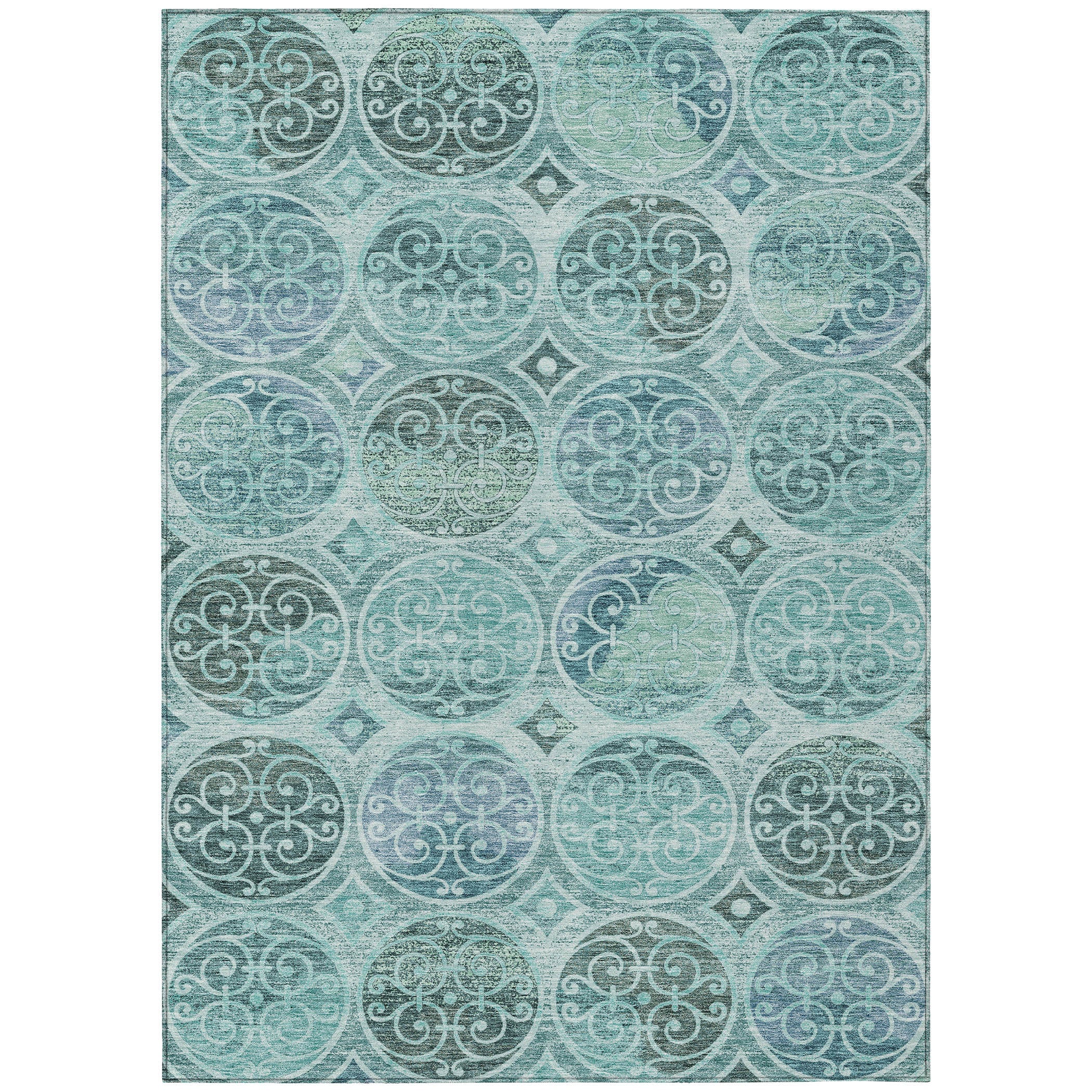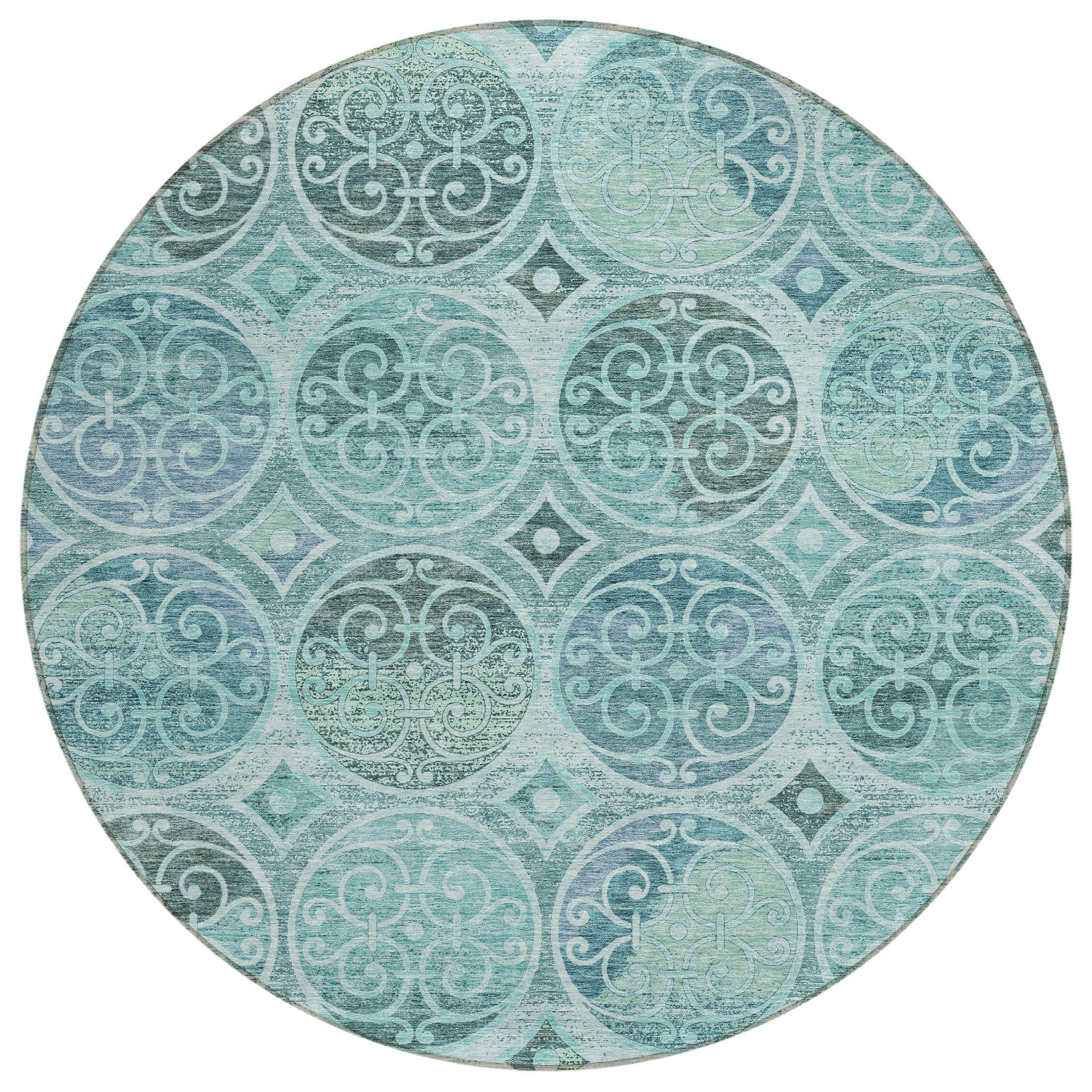 Chantille ACN738 Teal rug, a masterpiece showcasing intricate circles reminiscent of elegant wrought iron designs. This rug effortlessly blends traditional and modern styles, elevating the aesthetic of any space with its captivating pattern. The UV stabilized material allows for versatile use indoors or outdoors, while its ultra-thin construction ensures easy placement in any room. Cleaning is a breeze as this rug is machine-washable, making maintenance hassle-free. Designed to be family and pet-friendly, the Chantille ACN738 Teal rug combines beauty and functionality seamlessly. Add a touch of artistry to your decor with this stylish and practical rug option.