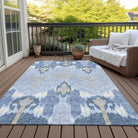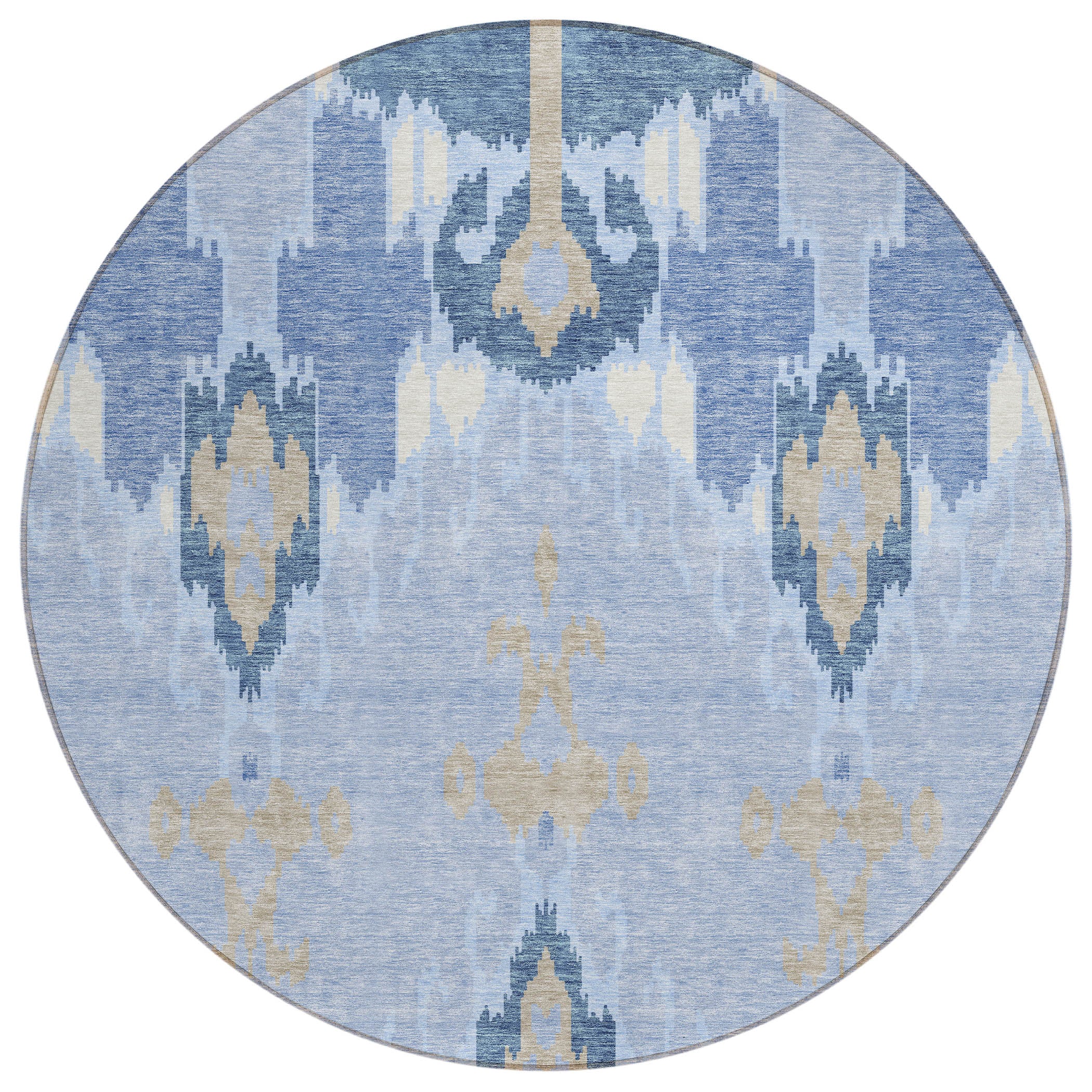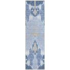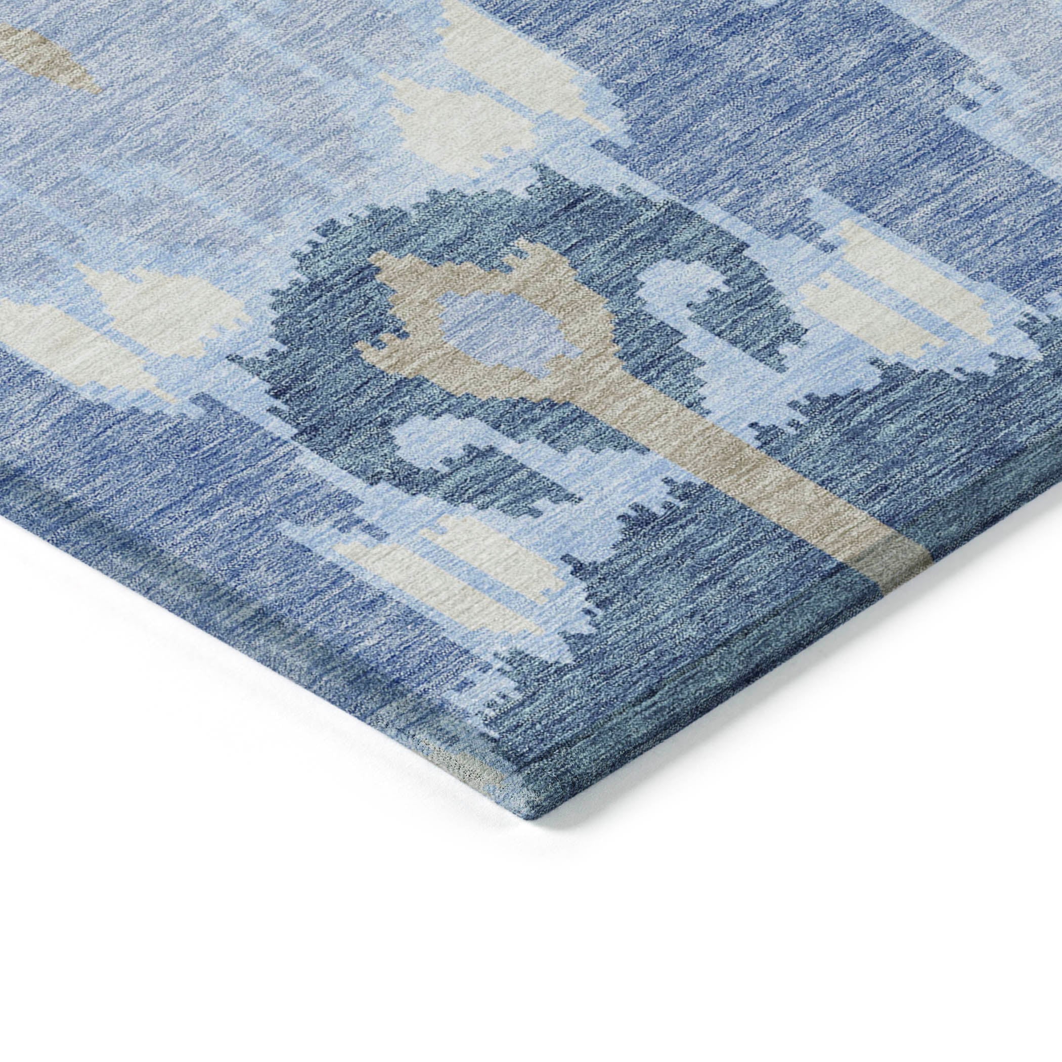 Chantille ACN748 Sky rug, a modern interpretation of the traditional Ikat pattern. This rug seamlessly blends classic motifs with a contemporary touch, making it an eye-catching addition to any room decor. Its unique design ensures a stylish visual impact that appeals to transitional tastes.