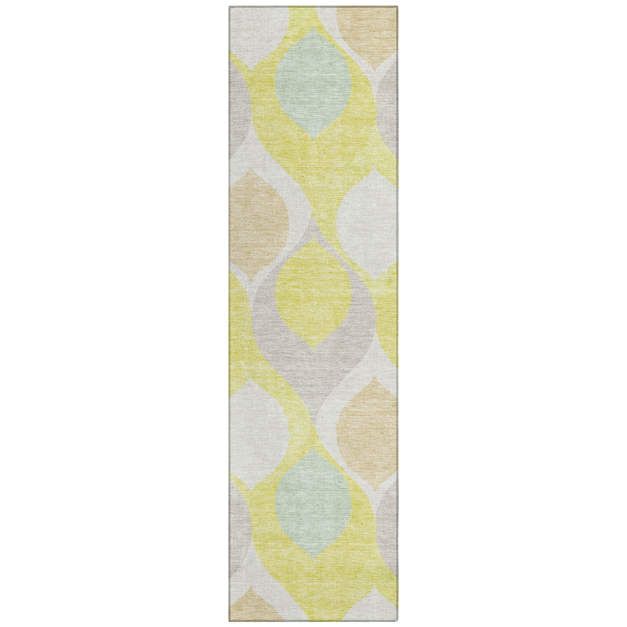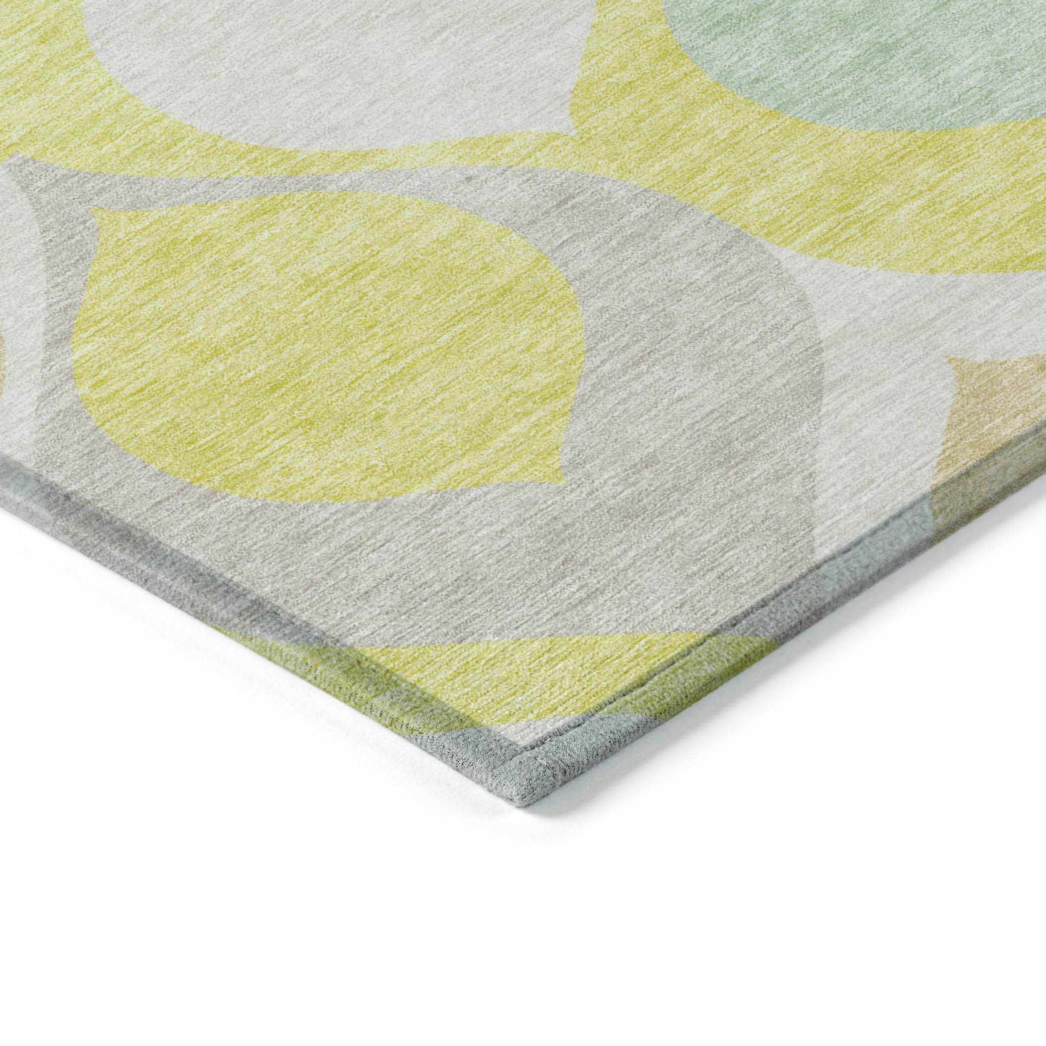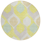 Chantille ACN749 Yellow rug, a stunning piece that embodies transitional and mid-century modern design. The rug features a captivating pattern of floating tear-shaped motifs, creating a sense of lightness and fluidity that complements contemporary decor beautifully.