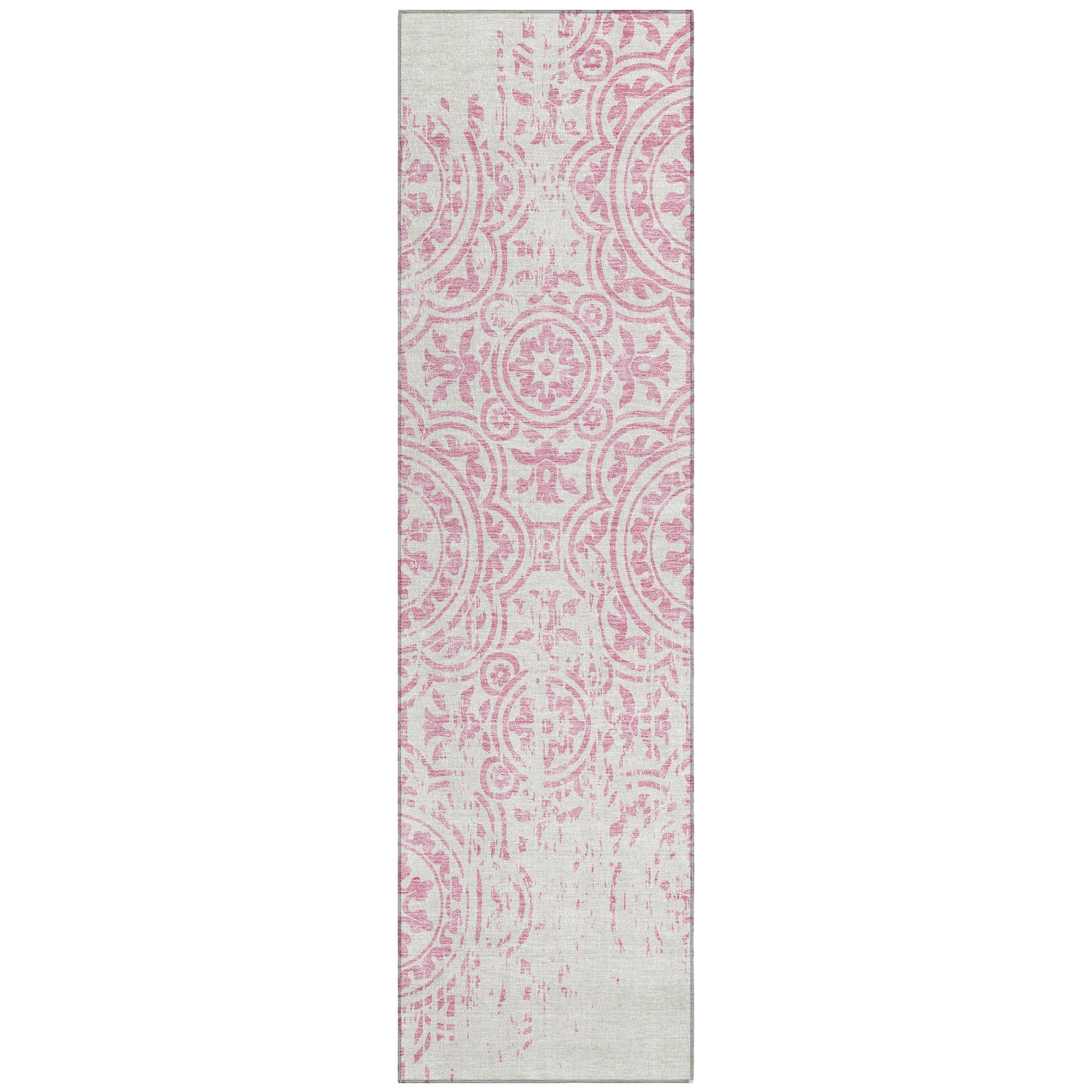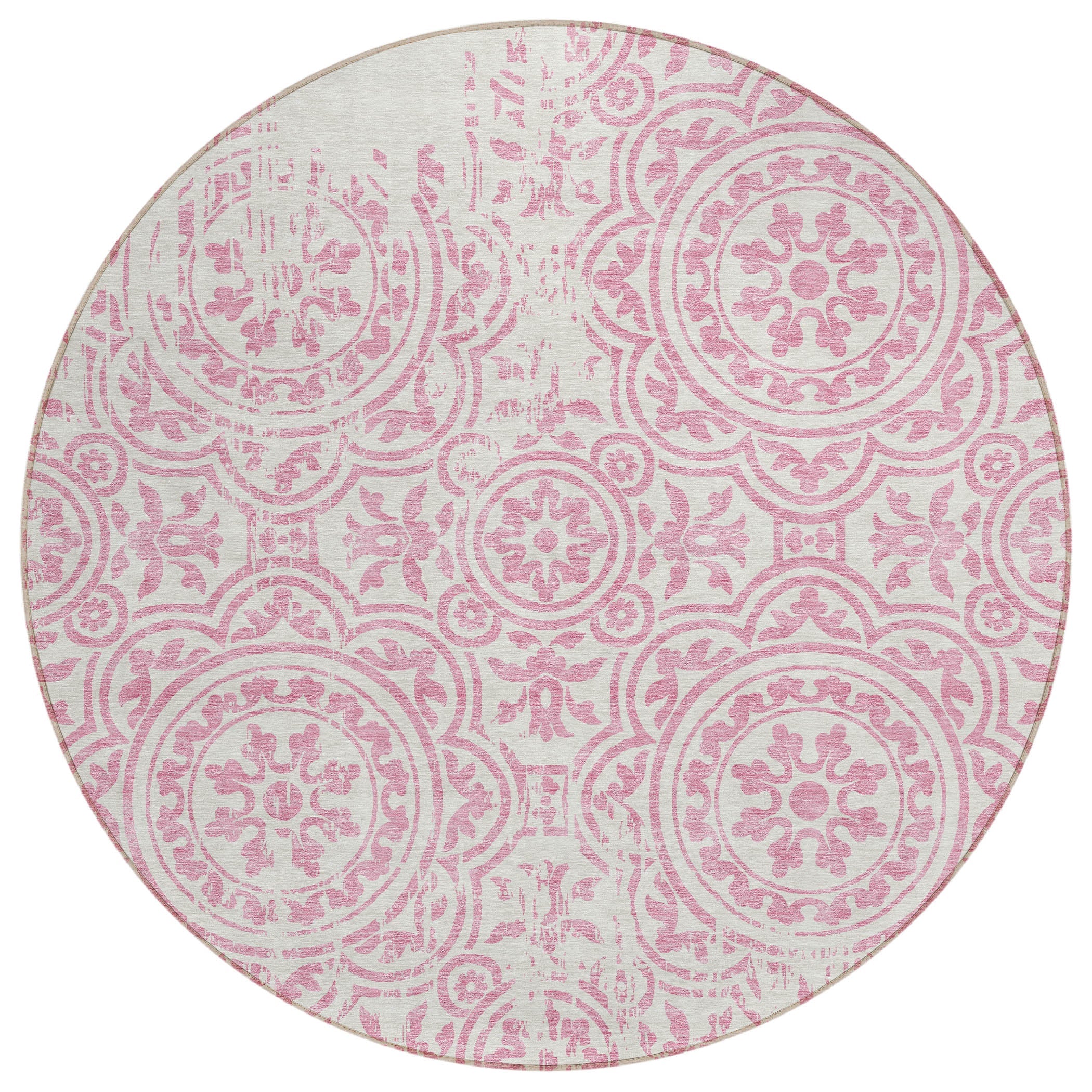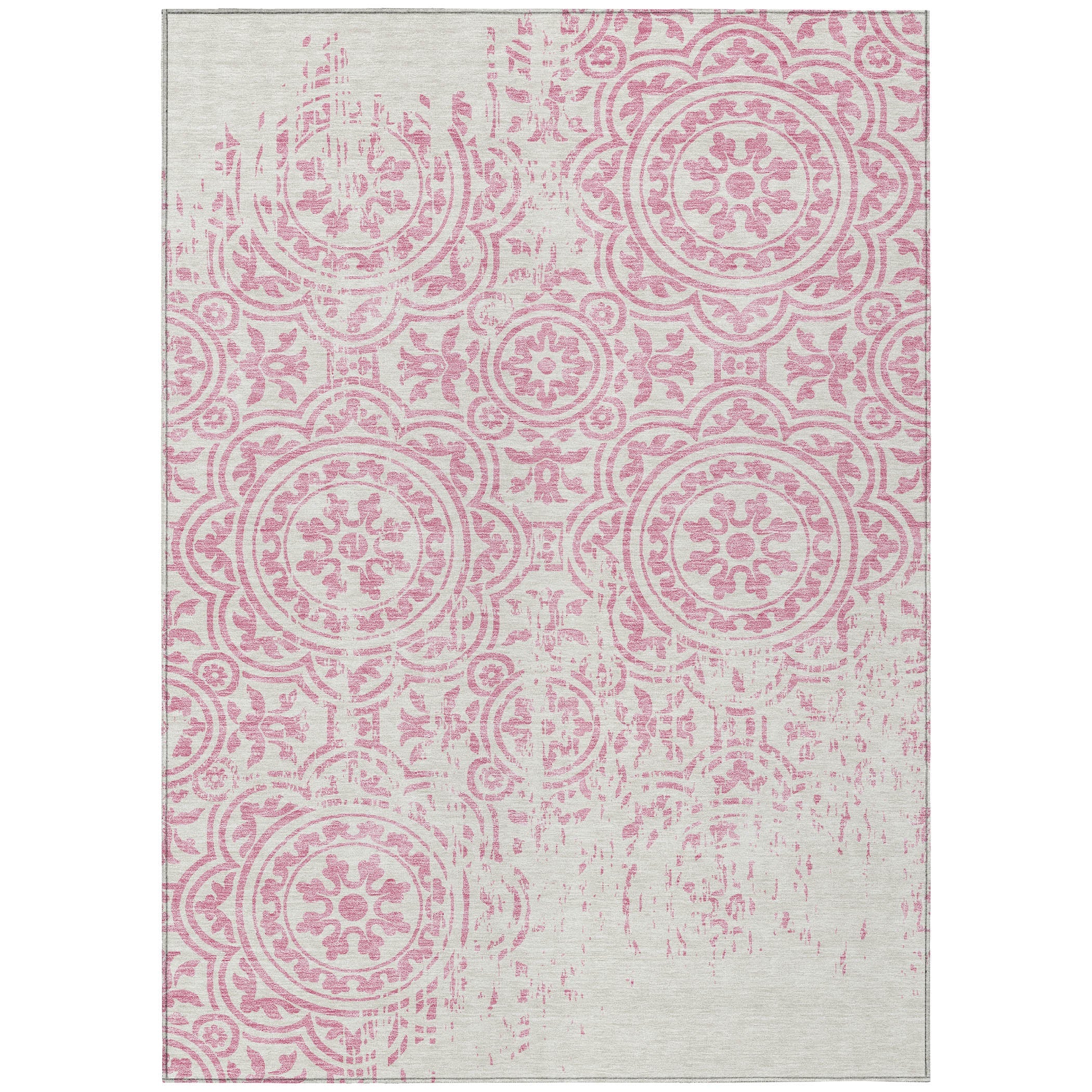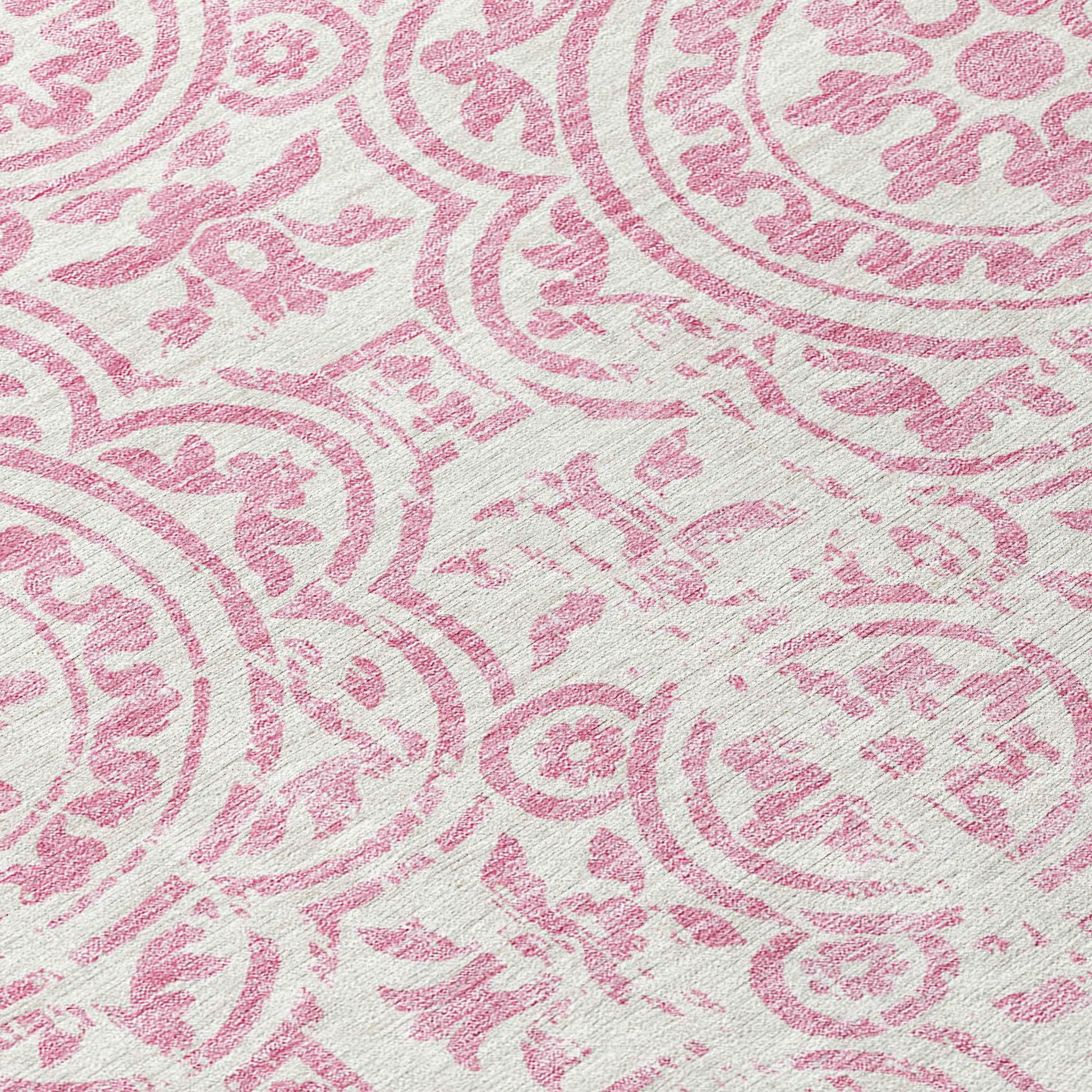 Chantille ACN758 Pink rug, a stunning addition to any space. The intricate design showcases large-scale medallions against open, airy corners, creating a captivating visual appeal. This transitional rug effortlessly blends classic elegance with a modern touch, making it perfect for any decor style.