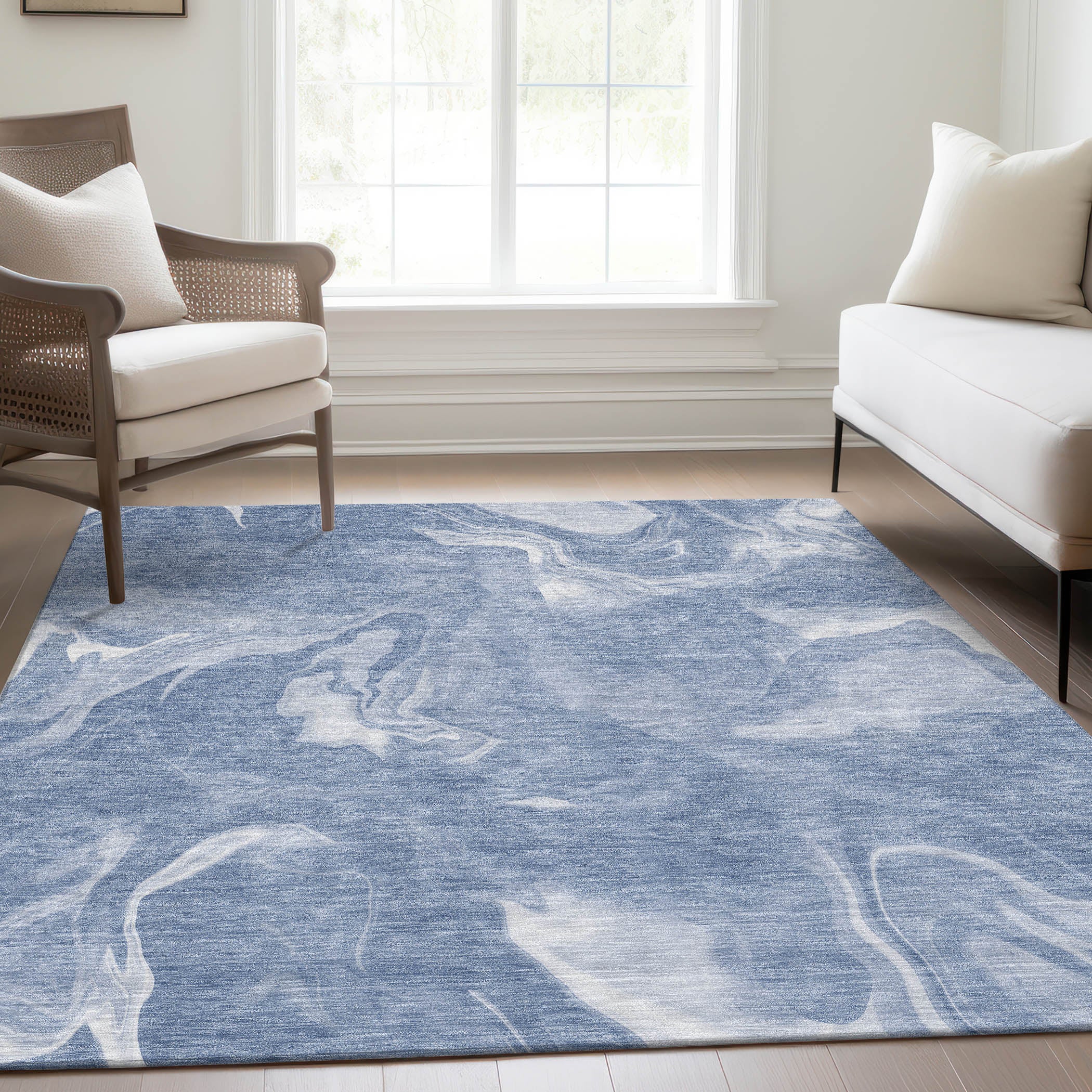 Chantille ACN802 Blue area rug, a masterpiece that brings serene beauty into your living space. This rug is adorned with abstract designs that exude a tranquil and soft vibe, perfect for transitional settings. Crafted to marry aesthetic elegance with practicality, it boasts UV stabilization for versatile use and an ultra-thin construction for seamless integration into any room.