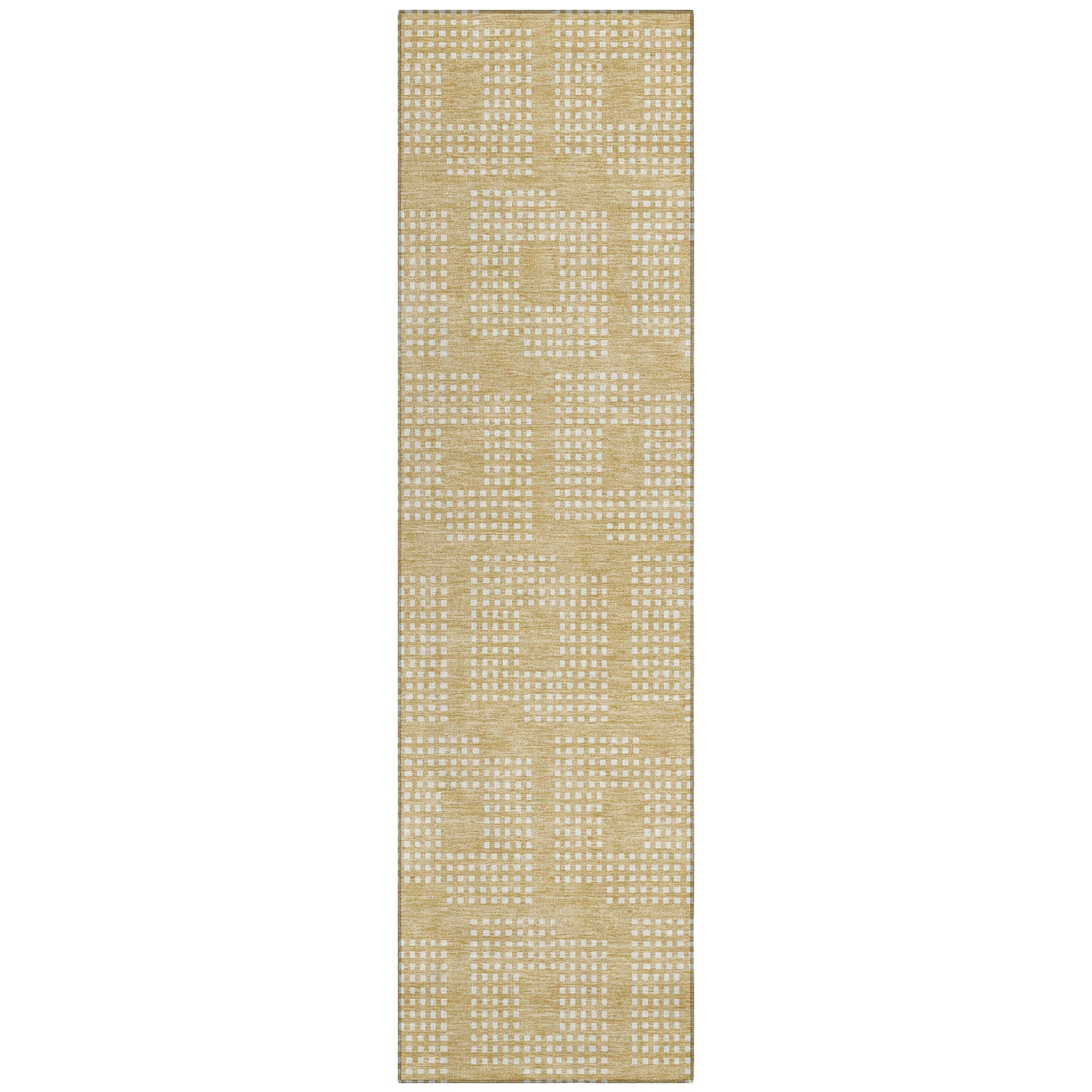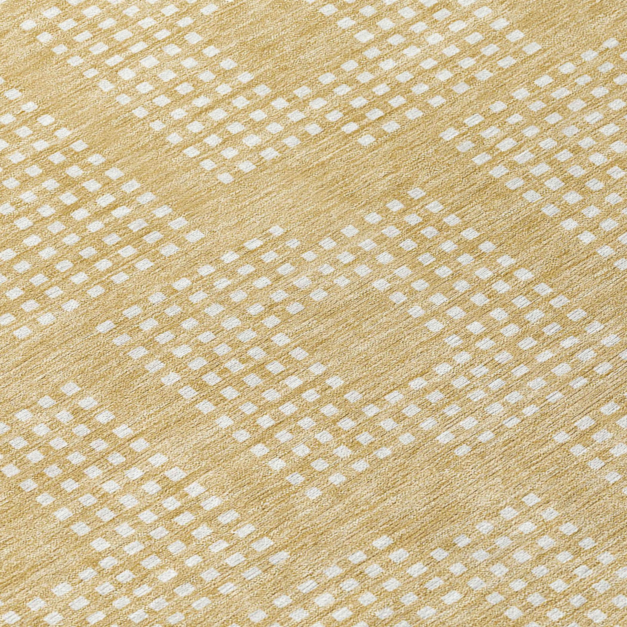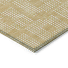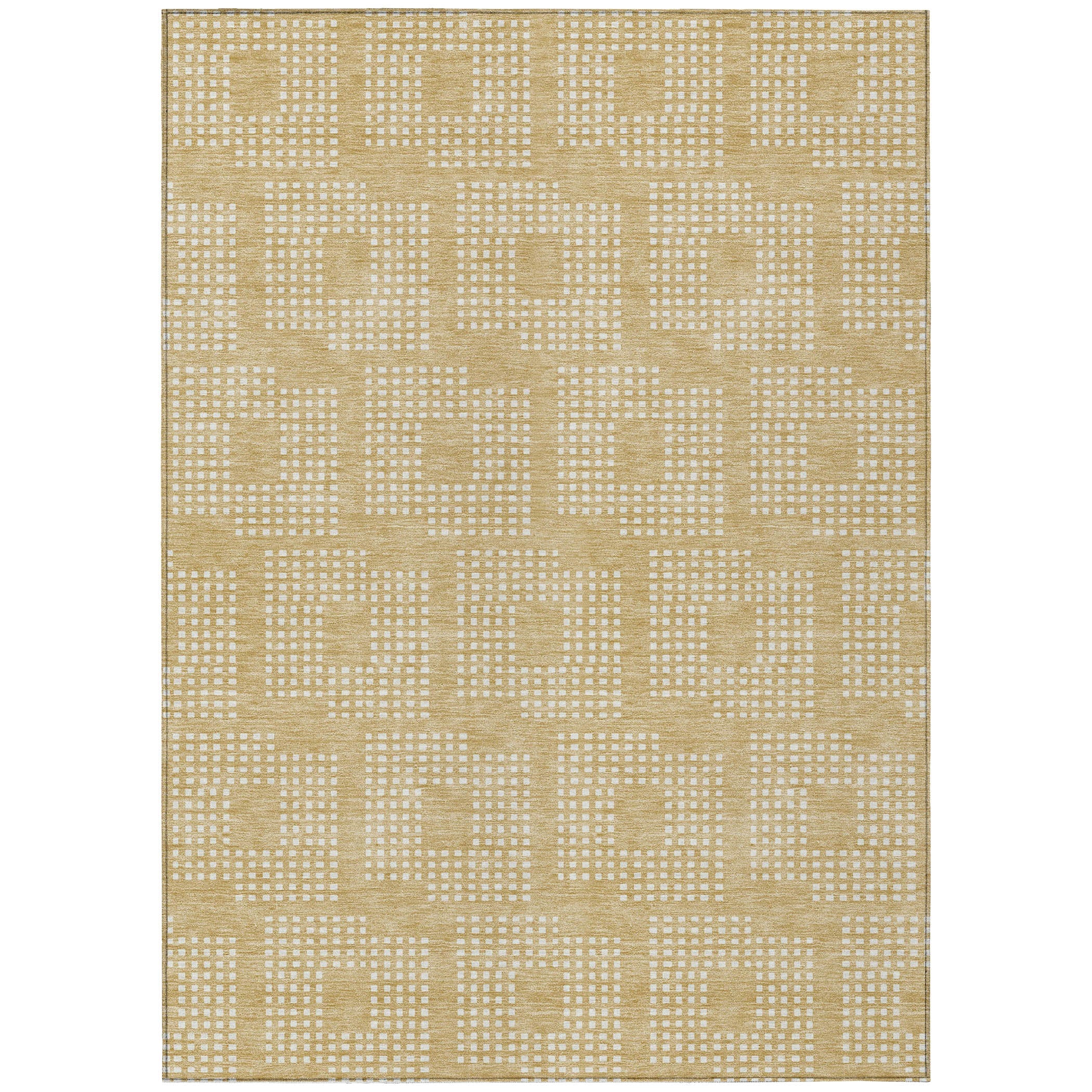 Chantille ACN890 Gold area rug, a geometric masterpiece that seamlessly blends style and sophistication. Delight in the intricate design of tiny squares coming together to form a larger square pattern, adding a touch of elegance to any room. The repetitive squares create a harmonious symmetry that enhances the aesthetic appeal of your space.