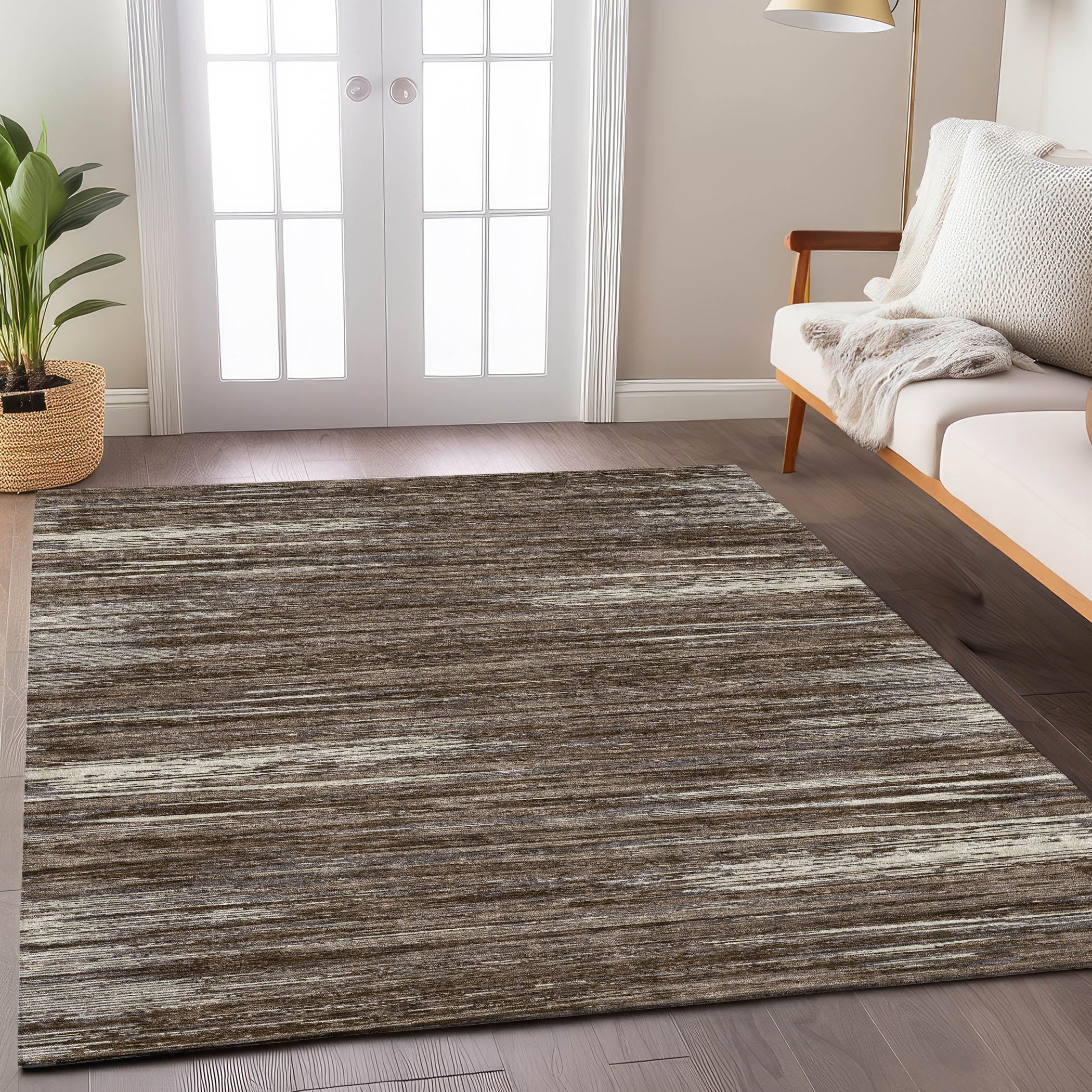 Chantille ACN896 Brown area rug, a perfect blend of simplicity and elegance. This rug features horizontal lines in a minimalistic, transitional style that effortlessly elevates any room's aesthetic. The understated stripe pattern adds a touch of sophistication to your living space.