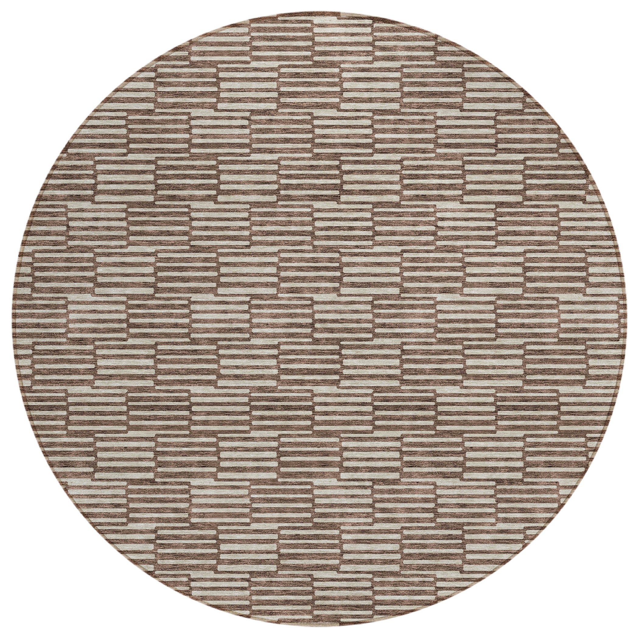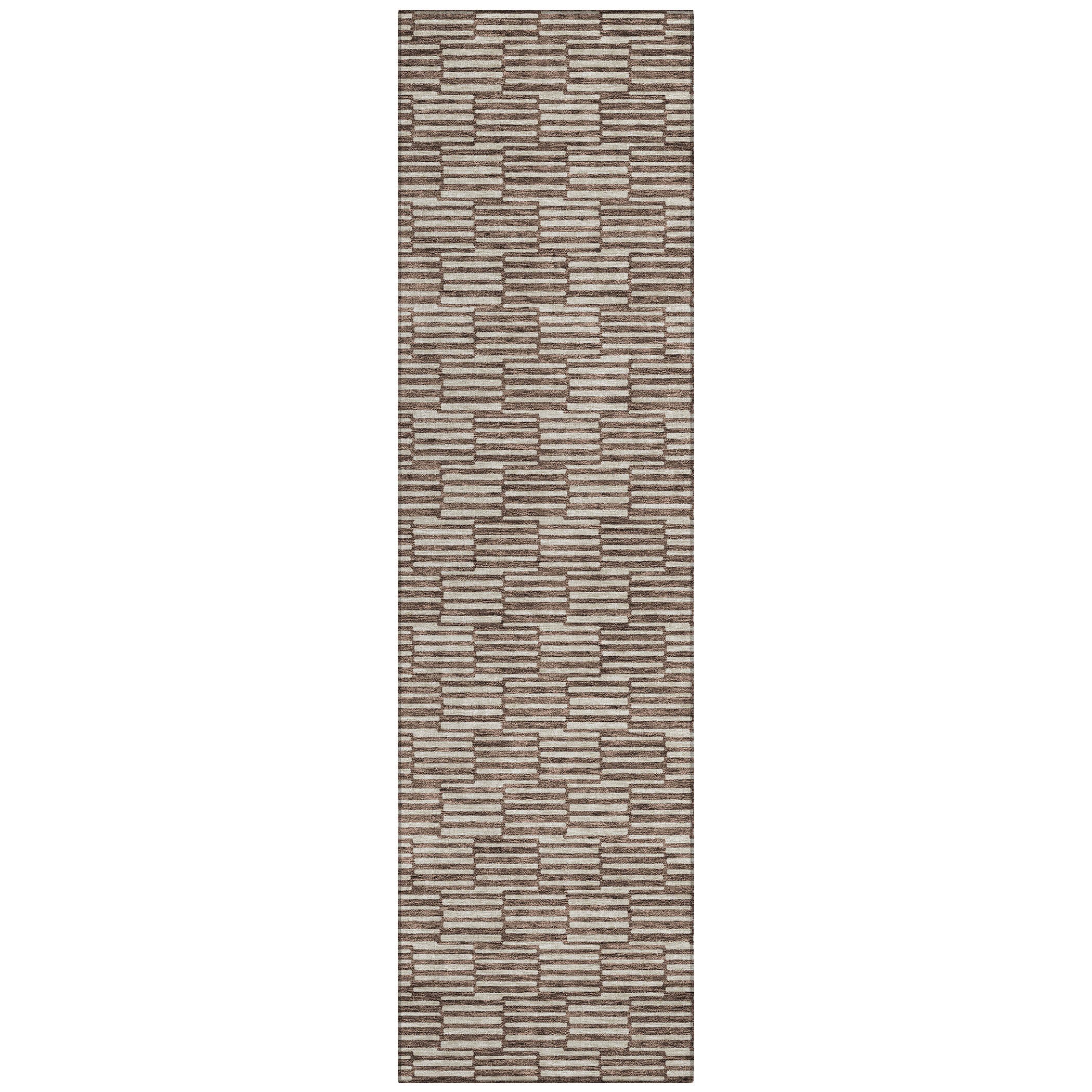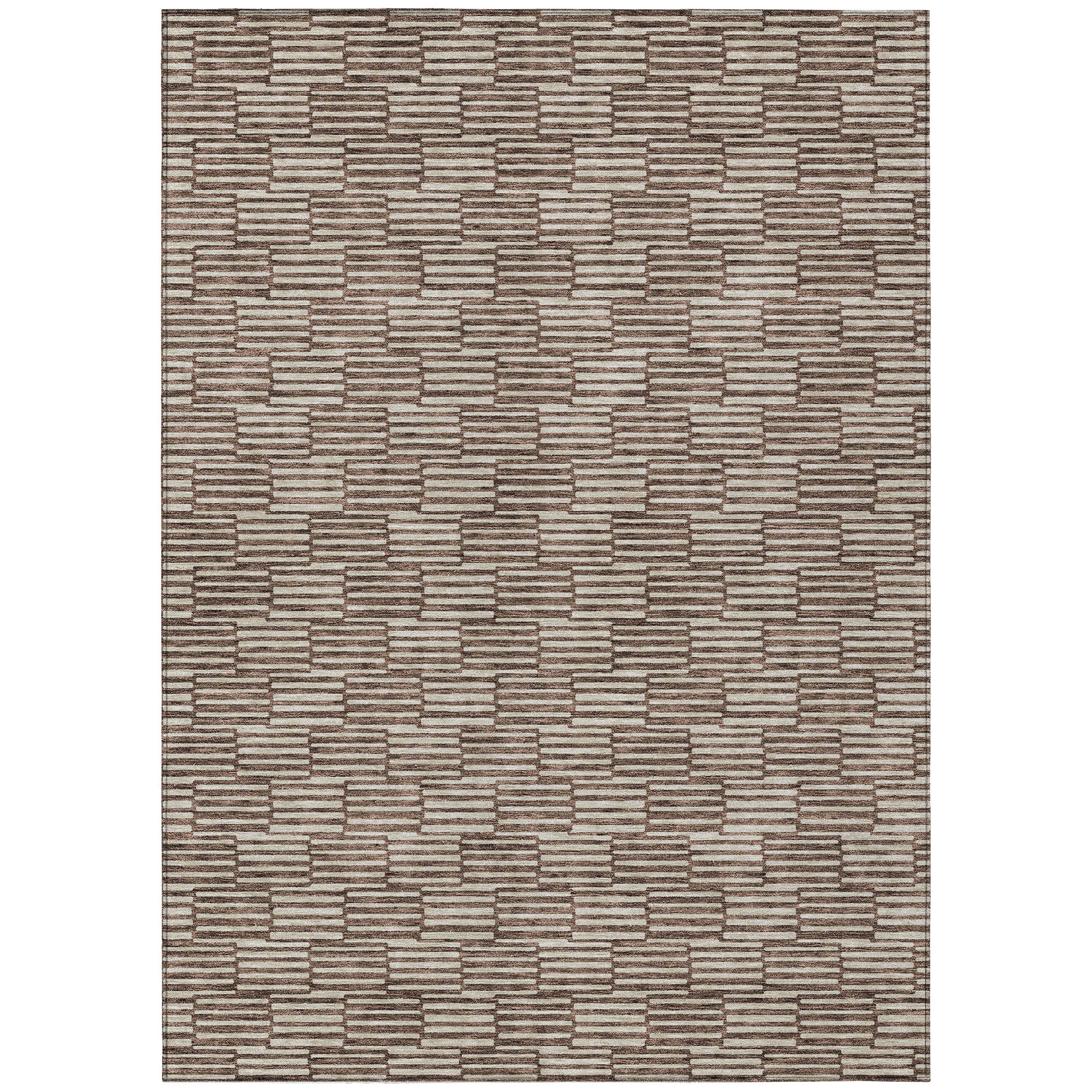 Chantille ACN918 Brown area rug - a fusion of elegance and modern design. This rug features small rectangles that combine to create a captivating horizontal pattern, seamlessly blending transitional style with linear sophistication. Whether used indoors or outdoors, its UV stabilized construction ensures lasting beauty in any setting.