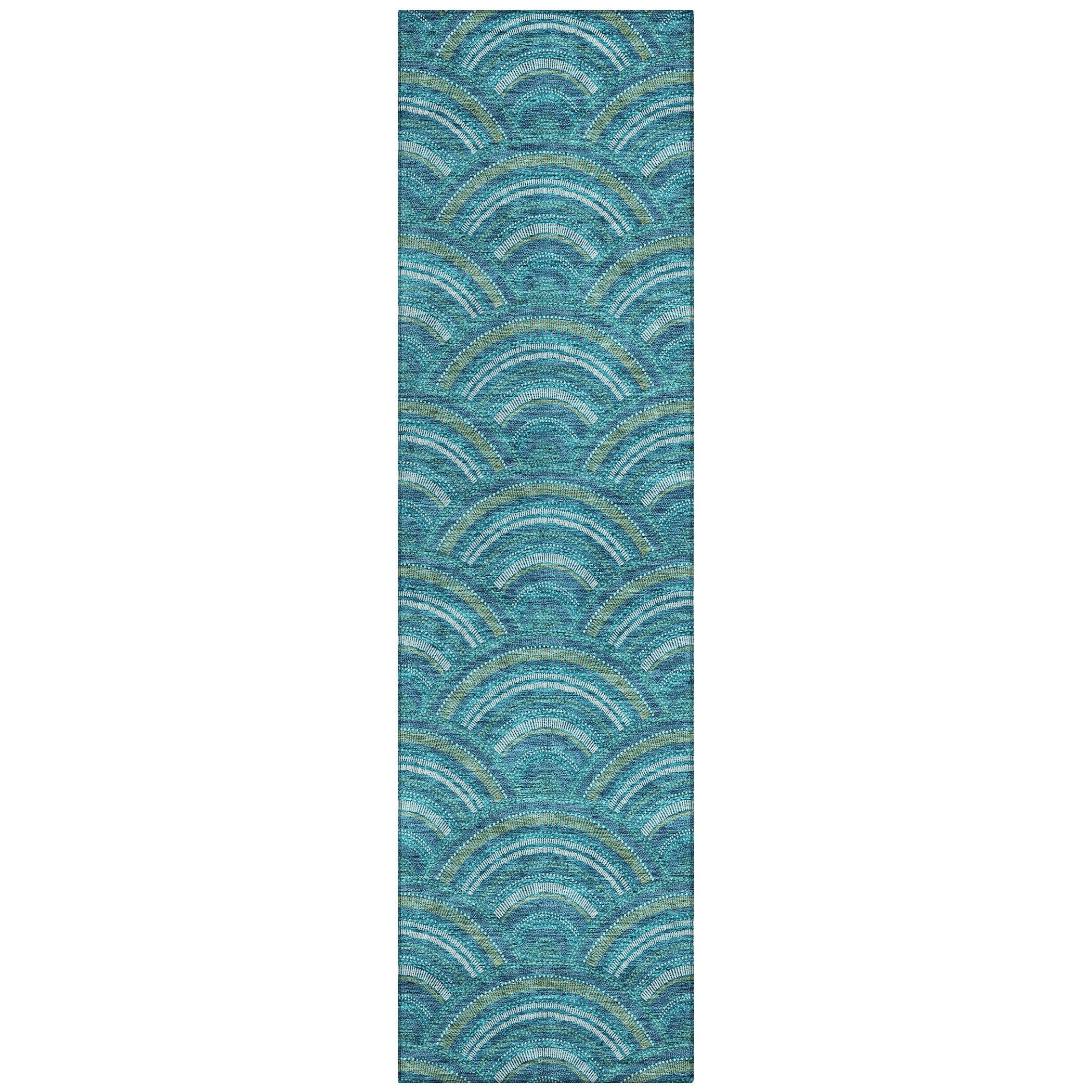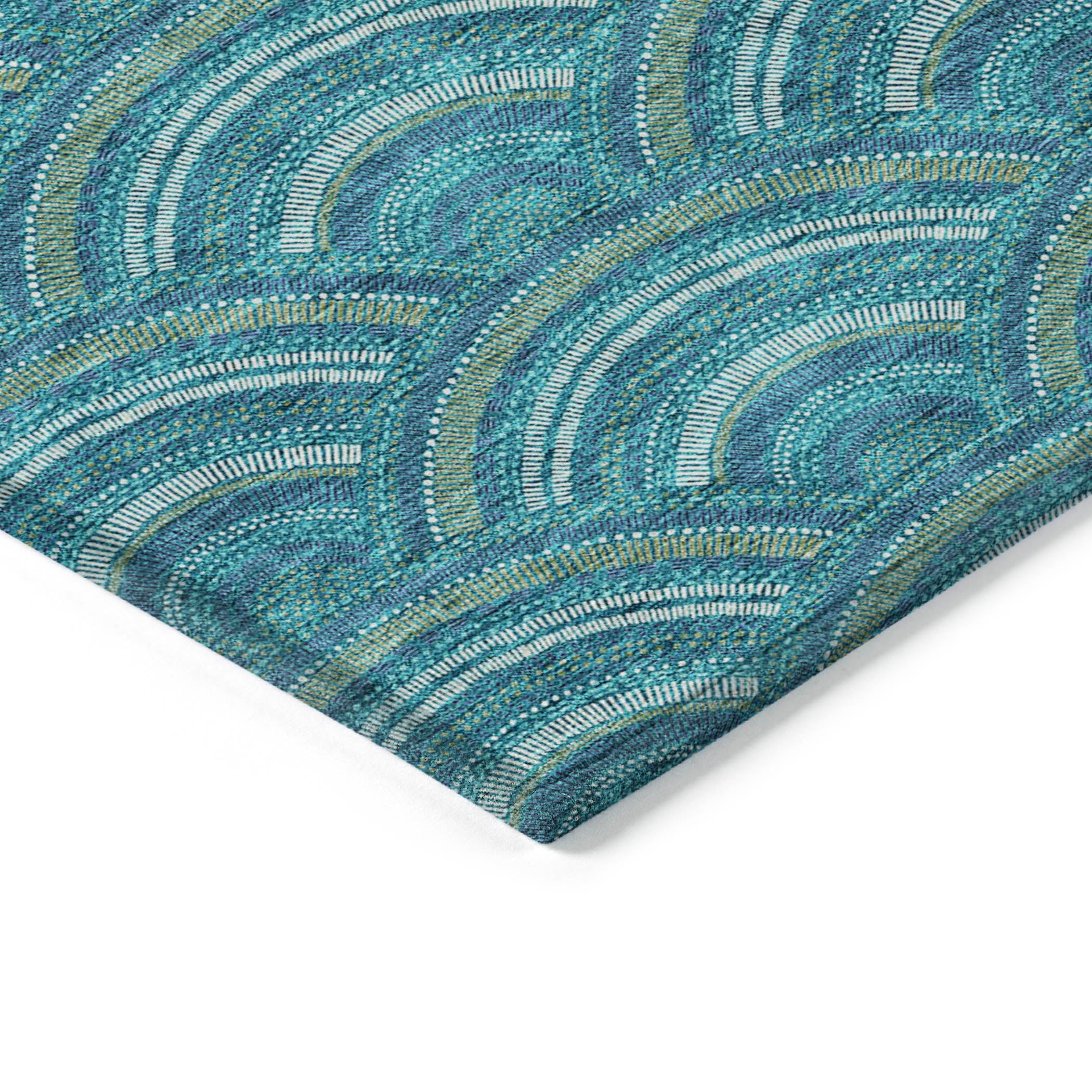 Chantille ACN984 Teal area rug, a stylish fusion of modern trends and transitional charm. Its smart semi-circle pattern adds a contemporary touch to any space while maintaining a timeless appeal. Crafted with UV stabilization, this rug is ready to withstand both sun and shade, making it ideal for indoor and outdoor use.