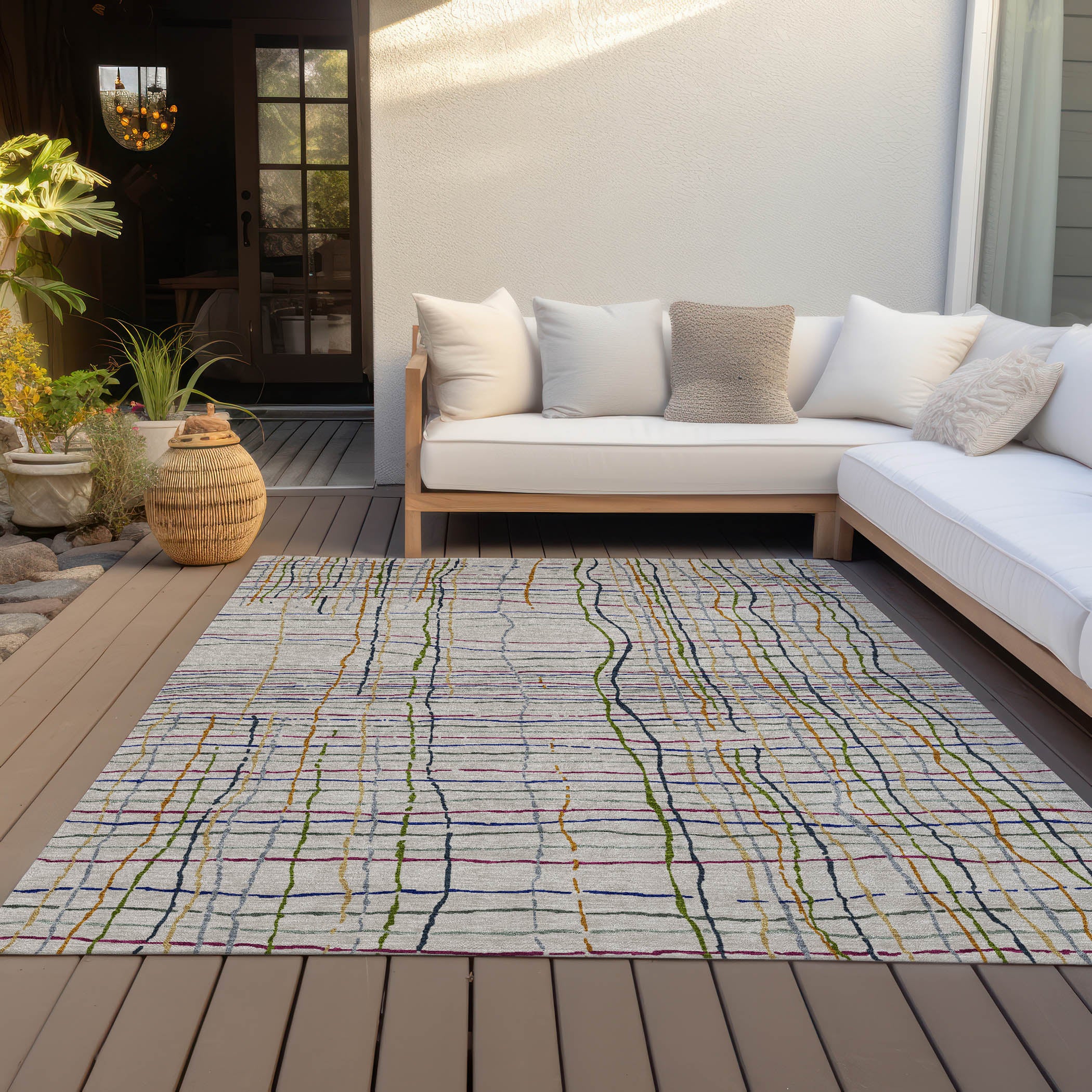 Our elegantly designed area rug is crafted with vertical and horizontal lines that ensure visual flow and an engaging aesthetic. The transitional style with striped patterns offers versatility for any room. UV stabilization makes this rug suitable for both indoor and outdoor use, while its ultra-thin build and machine-washable features provide practicality. Its an ideal choice for households with pets and children, promising easy maintenance and durability.