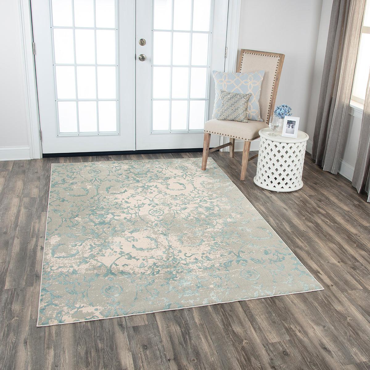 Chelsea CHS103 from Rizzy Home, adding an air of luxury to your living space. This collection features a soft ivory, gray, and teal color palette that seamlessly blends modernity with timeless elegance. The elegant abstract patterns and incredibly soft feel make it a perfect choice for any room. Crafted in Turkey, these pieces are machine-made with a 100% super soft polypropylene pile that ensures both durability and comfort.