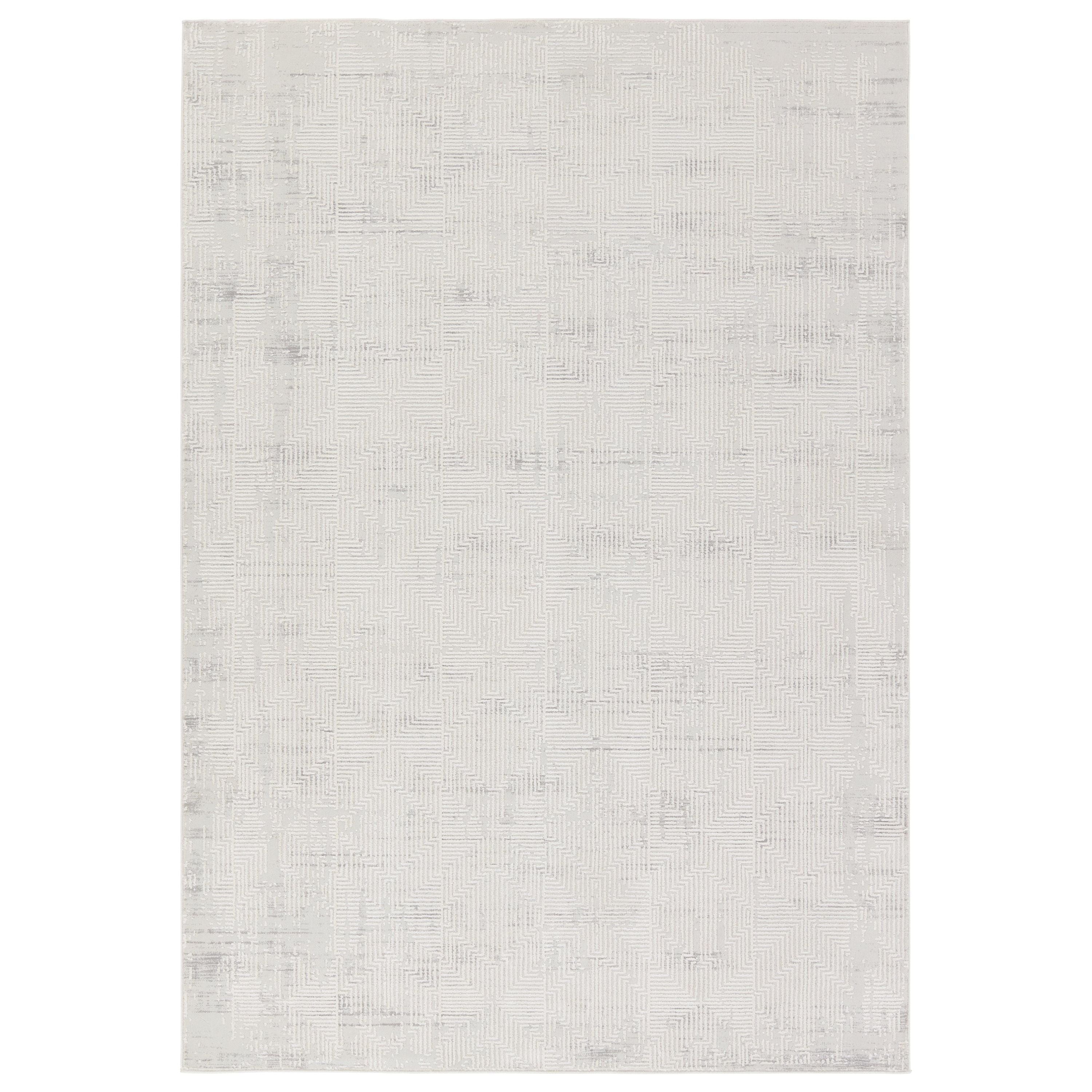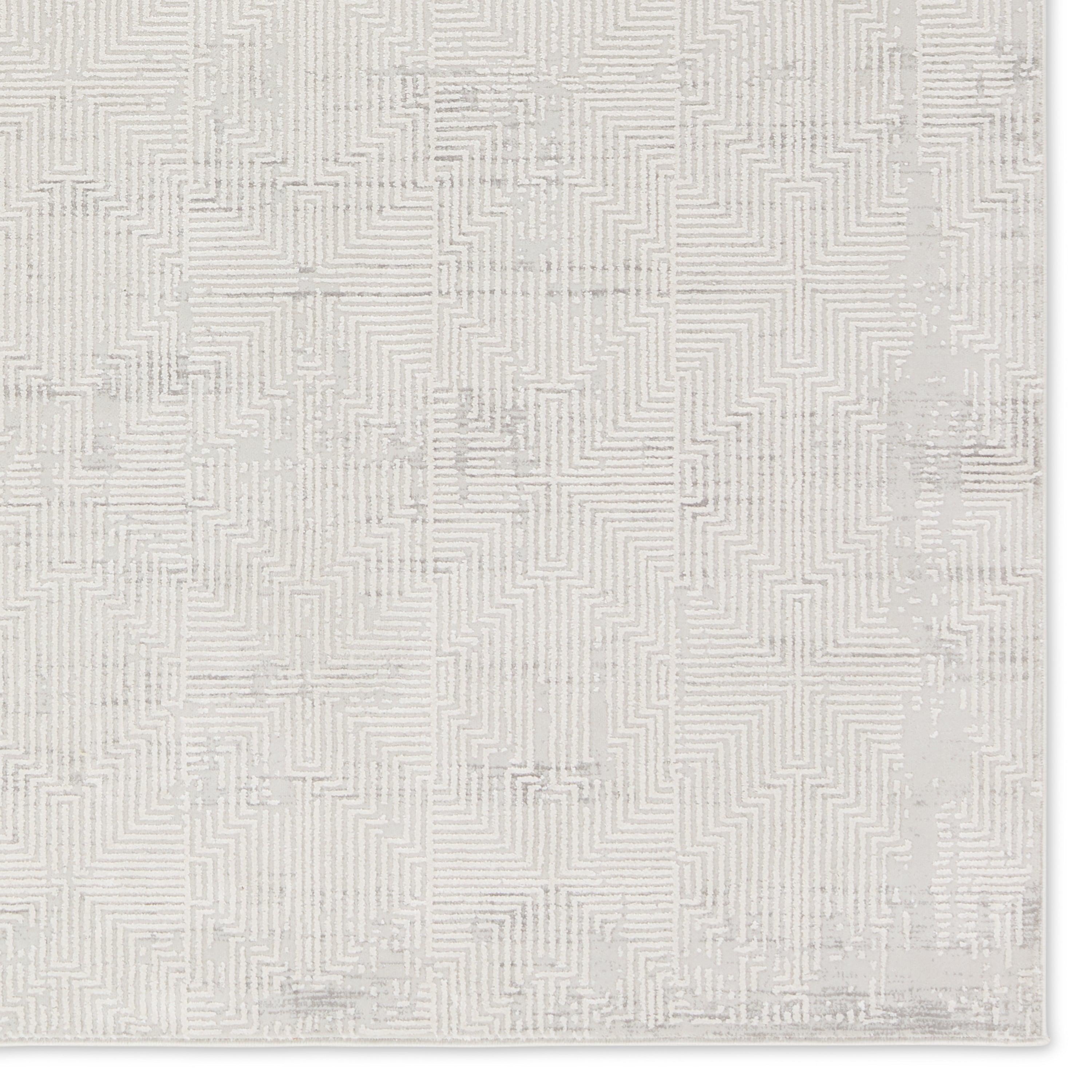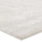 Cirque CIQ48 Ottavia, an exquisite power-loomed area rug that effortlessly blends antique designs with distressed patterning for a touch of glamour. The gray and cream colorway, along with its high sheen, beautifully complement the abstract geometric pattern, adding a sophisticated charm to any space.