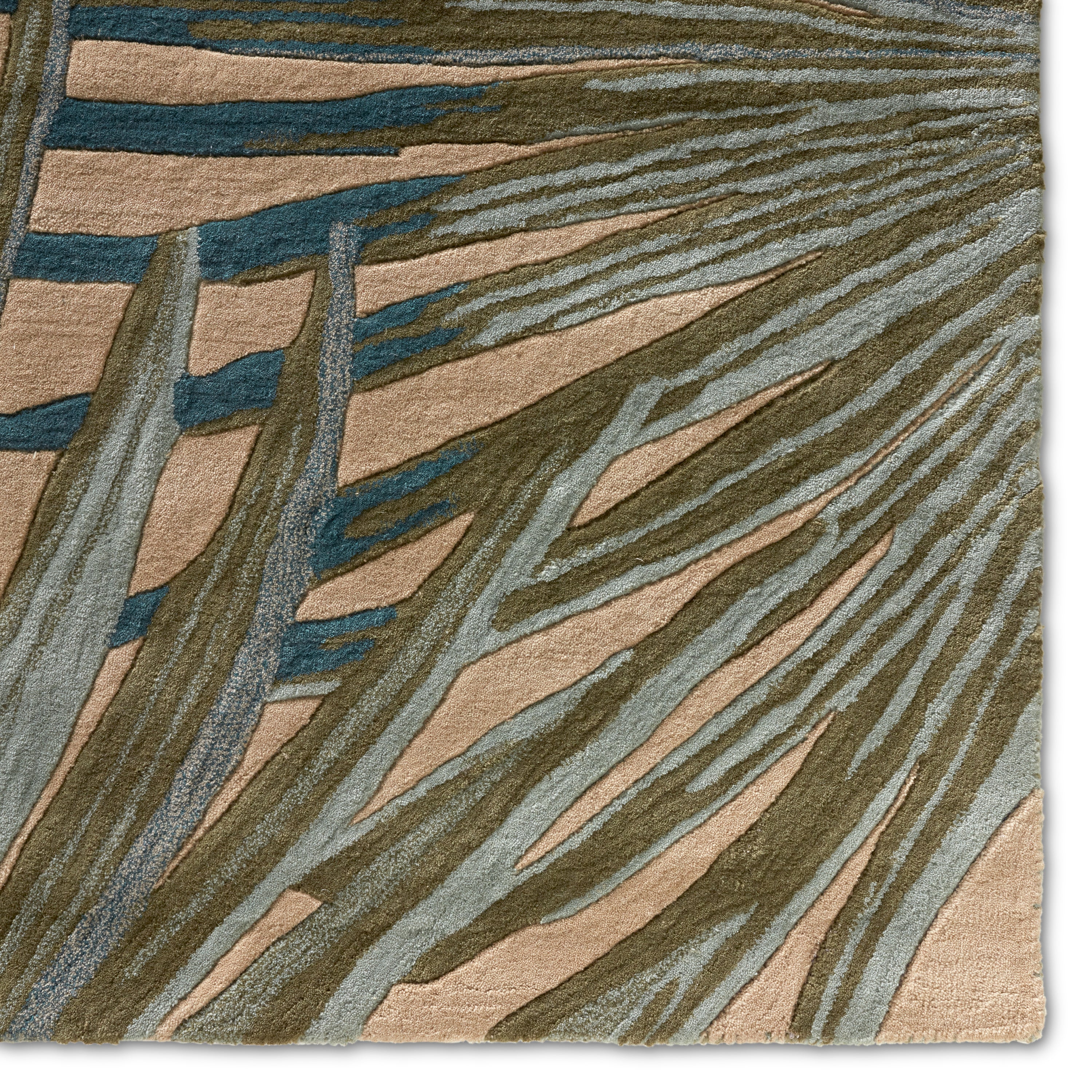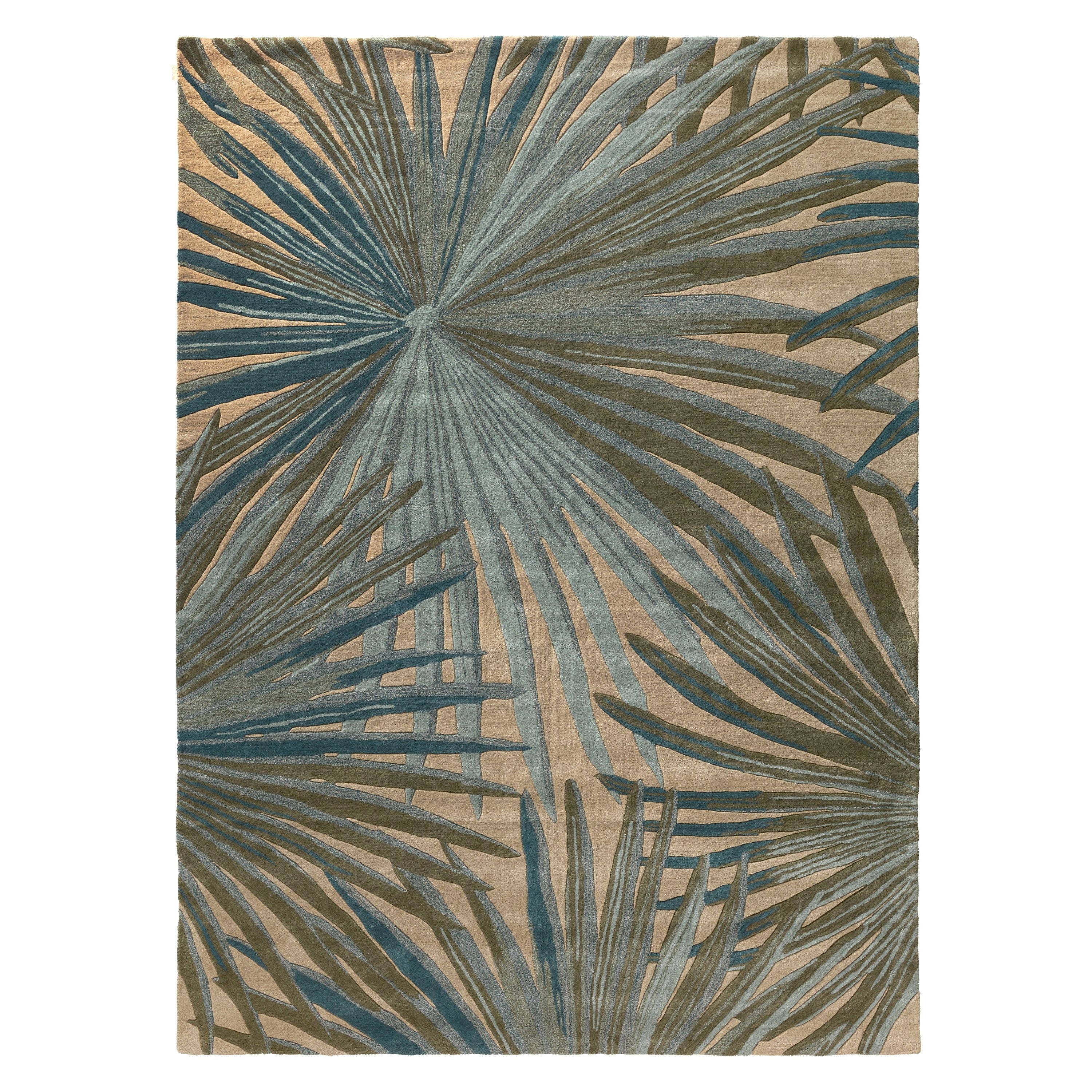 Coastal Seaside COS33 Palmetto area rug, a charming addition to any space with its modern design and refreshing color palette. Featuring playful blue and green palm fronds on a soothing beige background, this hand-tufted rug adds a touch of tropical flair to your decor. Crafted from high-quality wool, it not only boasts lasting durability but also provides a luxurious feel underfoot for ultimate comfort.